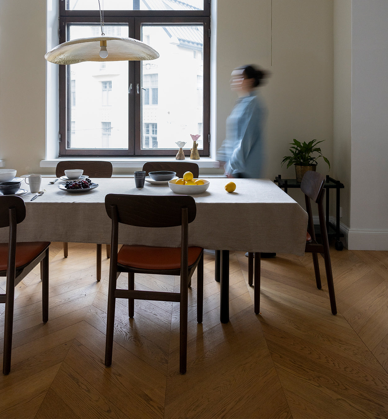 Selkeät, puhtaat linjat tuovat ruokailutilaan samaa rauhallisuutta ja raikkautta, jota löytyy pohjoisesta luonnostamme. Tummat ja vaaleat Kivi-astiat muodostavat harmonisen kokonaisuuden pellavatekstiilien kanssa, ja niiden orgaaniset muodot ja luonnollinen kauneus luovat luontevan vastavoiman kiireiselle elämälle.
