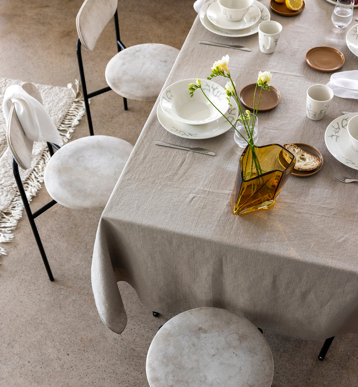 Rajattu värimaailma ja sama koruttomuus kuin pohjoisessa luonnossa luovat pelkistettyä kauneutta ja rauhaa. Pellavainen Soolo-pöytäliina ja luonnonmateriaaleista, kuten puusta valmistetut tarjoiluastiat sopivat paremmin kuin hyvin yhteen pohjoisesta inspiraationsa ammentavien, puhdaslinjaisten Saaga-astioiden kanssa. Pienet ruskeat Tuntu-leipälautaset tuovat kattaukseen ryhtiä ja Lohkare-lasimaljakko viimeistelee lämpimän luonnollisen tunnelman.