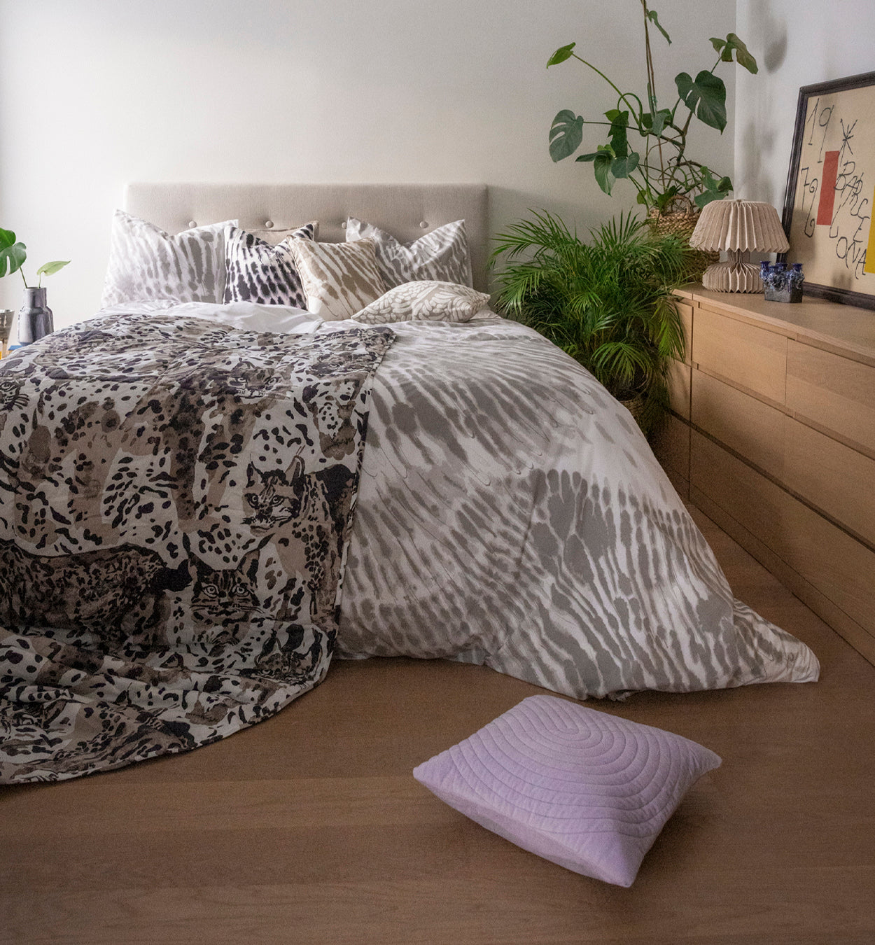 Kauniit ja hillityt Laulujoutsen-vuodevaatteet sopivat jokaiseen kotiin. Minna Niskakankaan suunnittelemaan Laulujoutsen-kuosiin on ikuistettu kansallislintumme suuret siivet, jotka kantavat ne etelän lämpöön meidän jäädessä nauttimaan kaamoksen tunnelmallisesta hämärästä. Vedämme peittoa korville ja lataamme akkuja. Laulujoutsen-vuodevaatteet on valmistettu puuvillaperkaalista, joka on vuodevaatteissa yleisimmin käytetty, tiheään kudottu, helppohoitoinen ja mattapintainen materiaali. Se tuntuu ihoa vasten ylelliseltä ja miellyttävältä, minkä vuoksi puuvillaperkaali-lakanoita kutsutaan myös "hotellilakanoiksi". Villikissa-päiväpeitto sopii täydellisesti yhteen Laulujoutsen-kuosin kanssa.