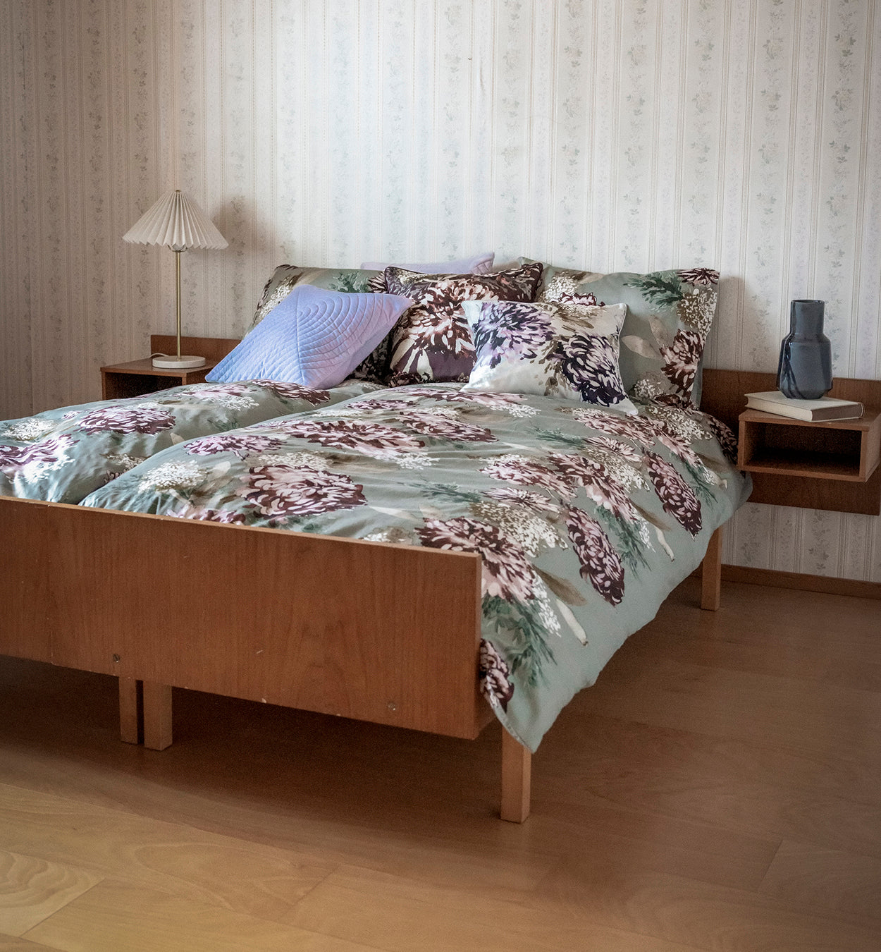Kuningatar-kuosi sopii täydellisesti trendikkään retrohenkisesti sisustettuun makuuhuoneeseen. Yhdistämällä runsaan kukkakuosin pelkistettyihin ja linjakkaisiin kalusteisiin, luot kiinnostavaa kontrastia. Seuraksi sopivat ajattomat Festi-pöytävalaisimet ja kimppu kuivakukkia Railo-maljakossa.