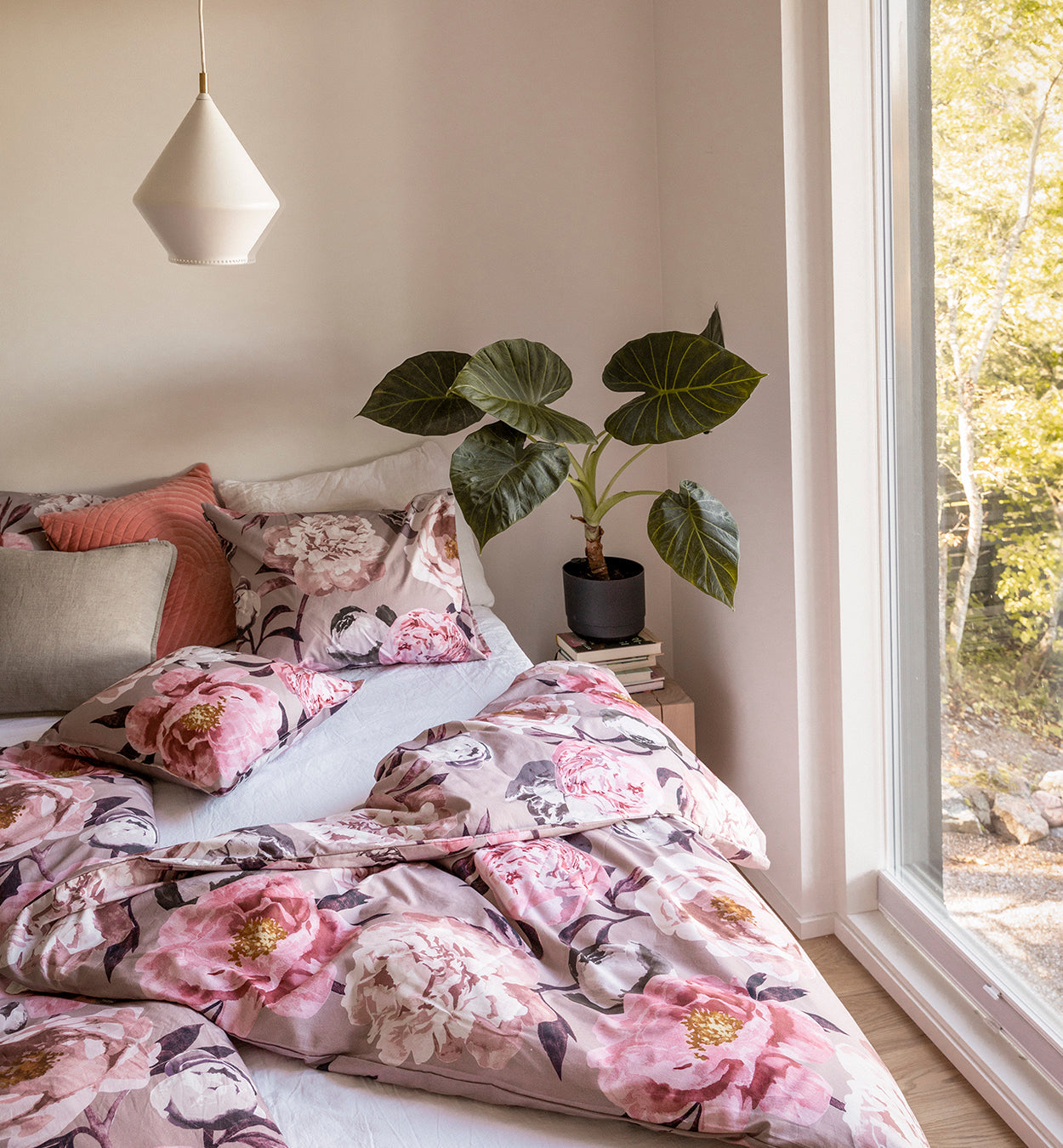 Rakastettu Pioni-kuosi tuo väriä pohjoisen luonnon vaihtelevien, usein harmaiden säiden keskelle. Se piristää, kun on aika vetää peittoa korville ja ladata akkuja. Yhdistele värikkääseen kuosiin esimerkiksi valkoisen, vaaleanpunaisen ja beigen eri sävyjä ja tunne, kuinka makuuhuone herää pionien kukoistukseen.