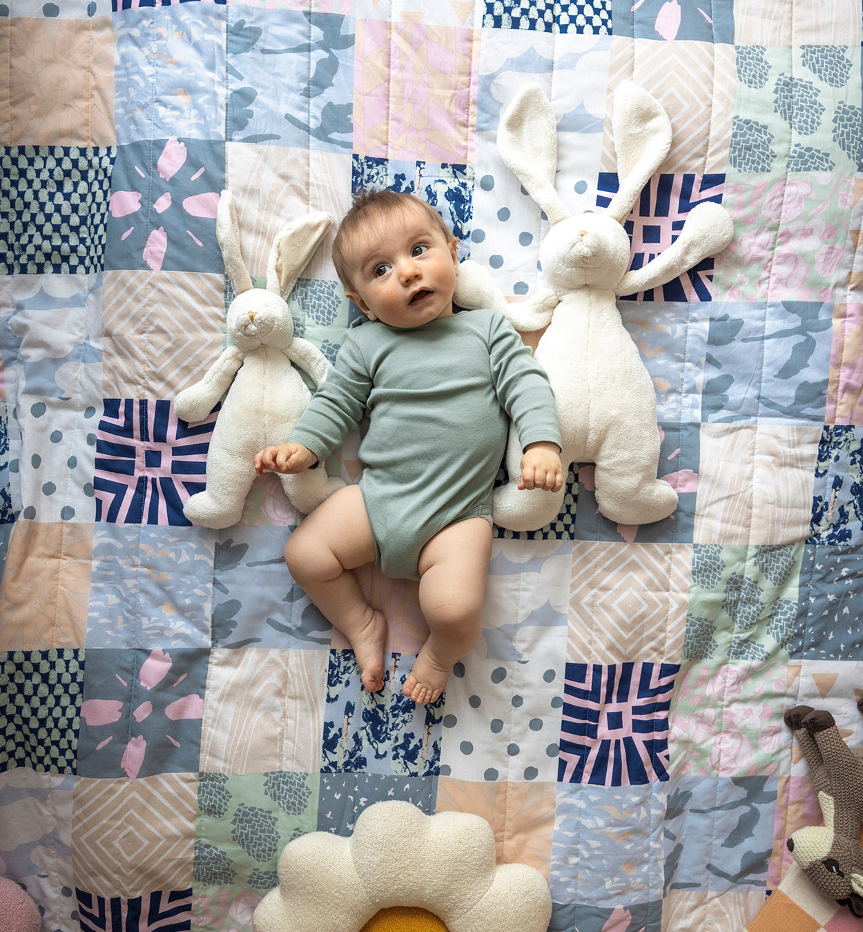 Pieni hetki sieltä, toinen täältä. Lasse Kovasen suunnittelemaan Tilkkutäkki-päiväpeittoon on kuvattu muistoja mökillä vietetyistä lapsuuden kesistä: räsymattoja, puun kaarnaa, laineilevaa vettä, mustikoita, helteisenä tuoksuvaa metsää ja tietysti kirkkaana porottava aurinko. Tilkkutäkki-päiväpeiton pastellinen värimaalima sopii suloiseen lastenhuoneen sisustukseen.