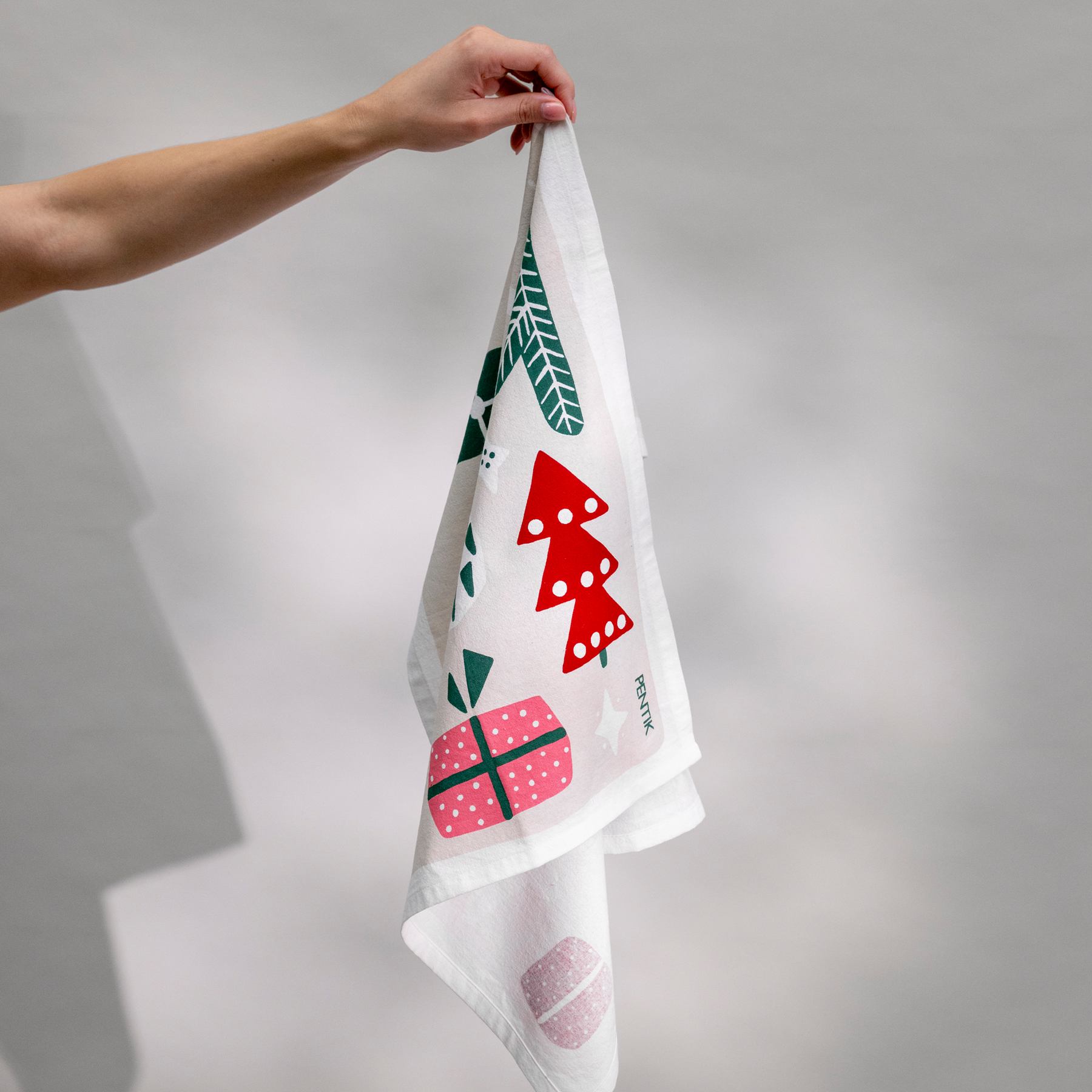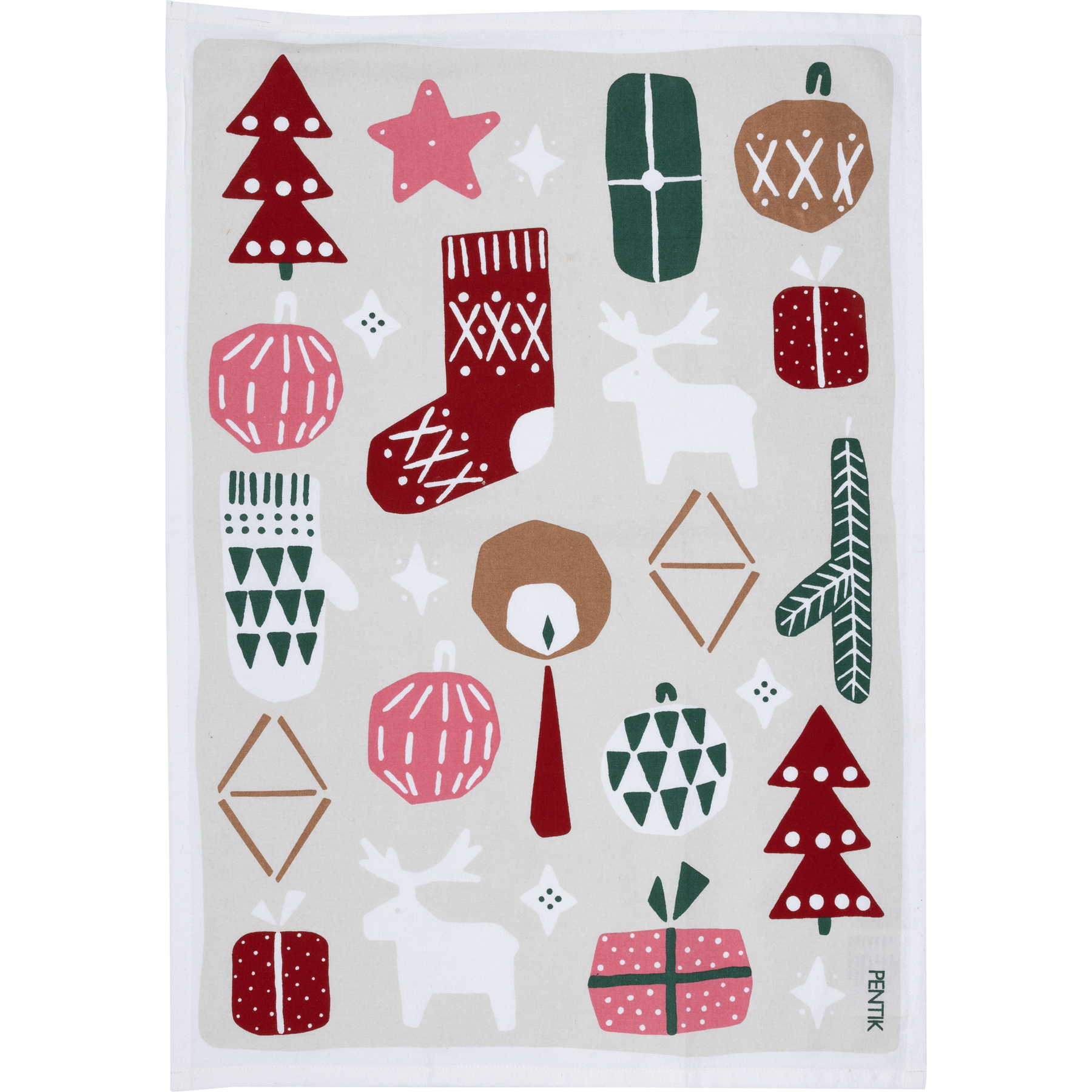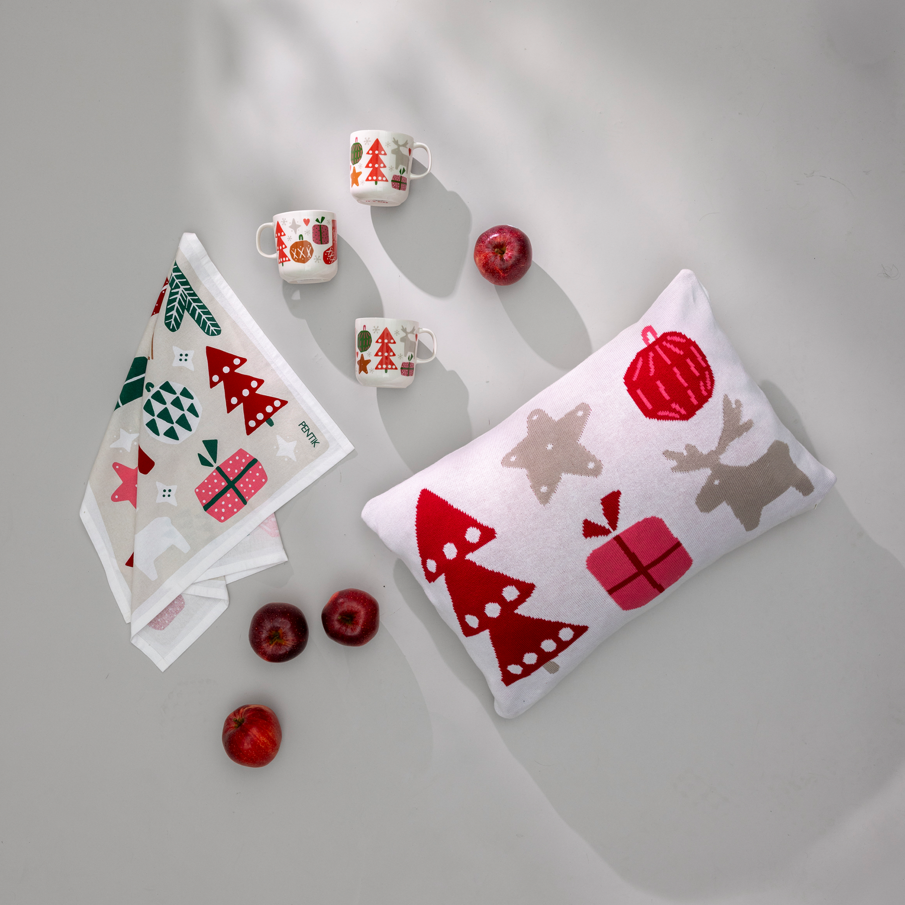 Riemukkaasti kuvioitu Aatto-keittiöpyyhe nostaa hymyn huulille. Sen graafiset kuviot ovat tuttuja suomalaisesta jouluperinteestä. Aatto-kuosin on suunnitellut Minna Niskakangas. Keittiöpyyhkeen koko on 47x70 cm ja se on 100 % puuvillaa.