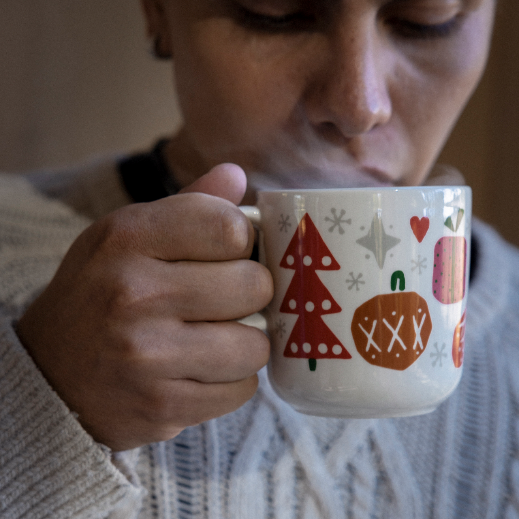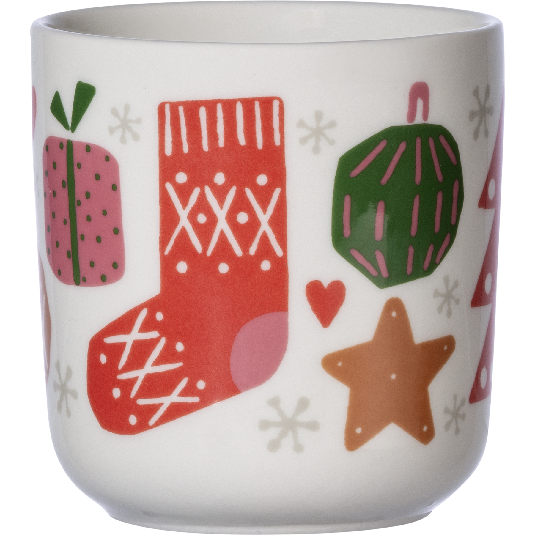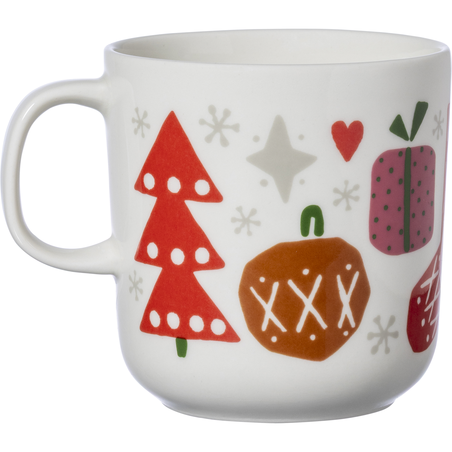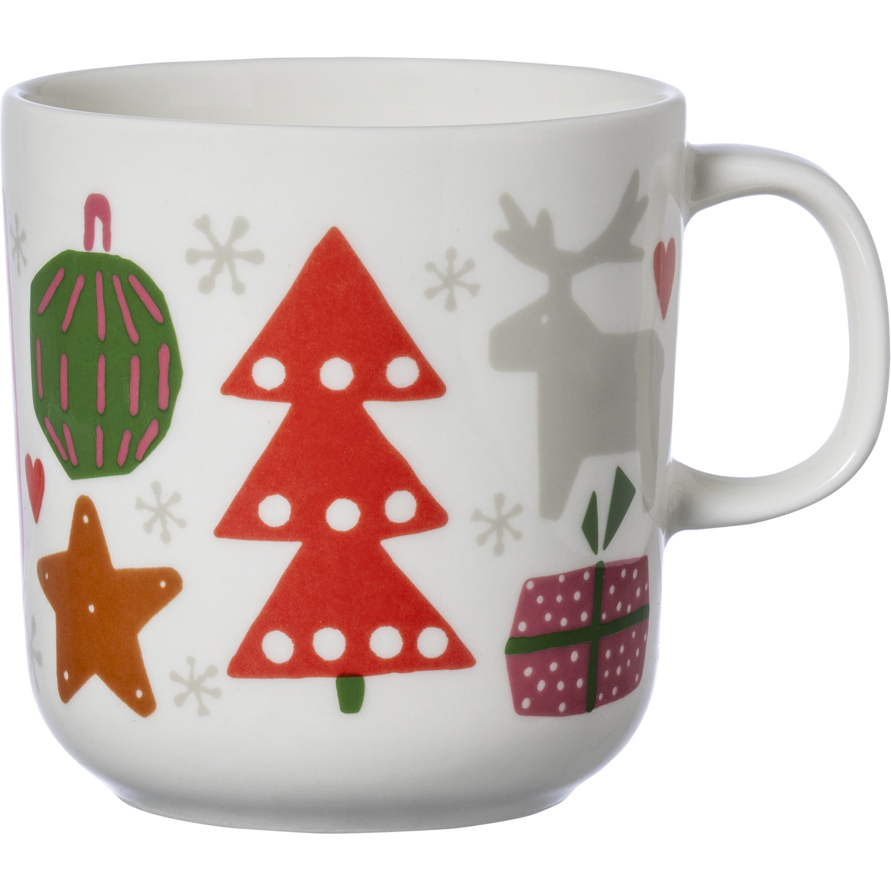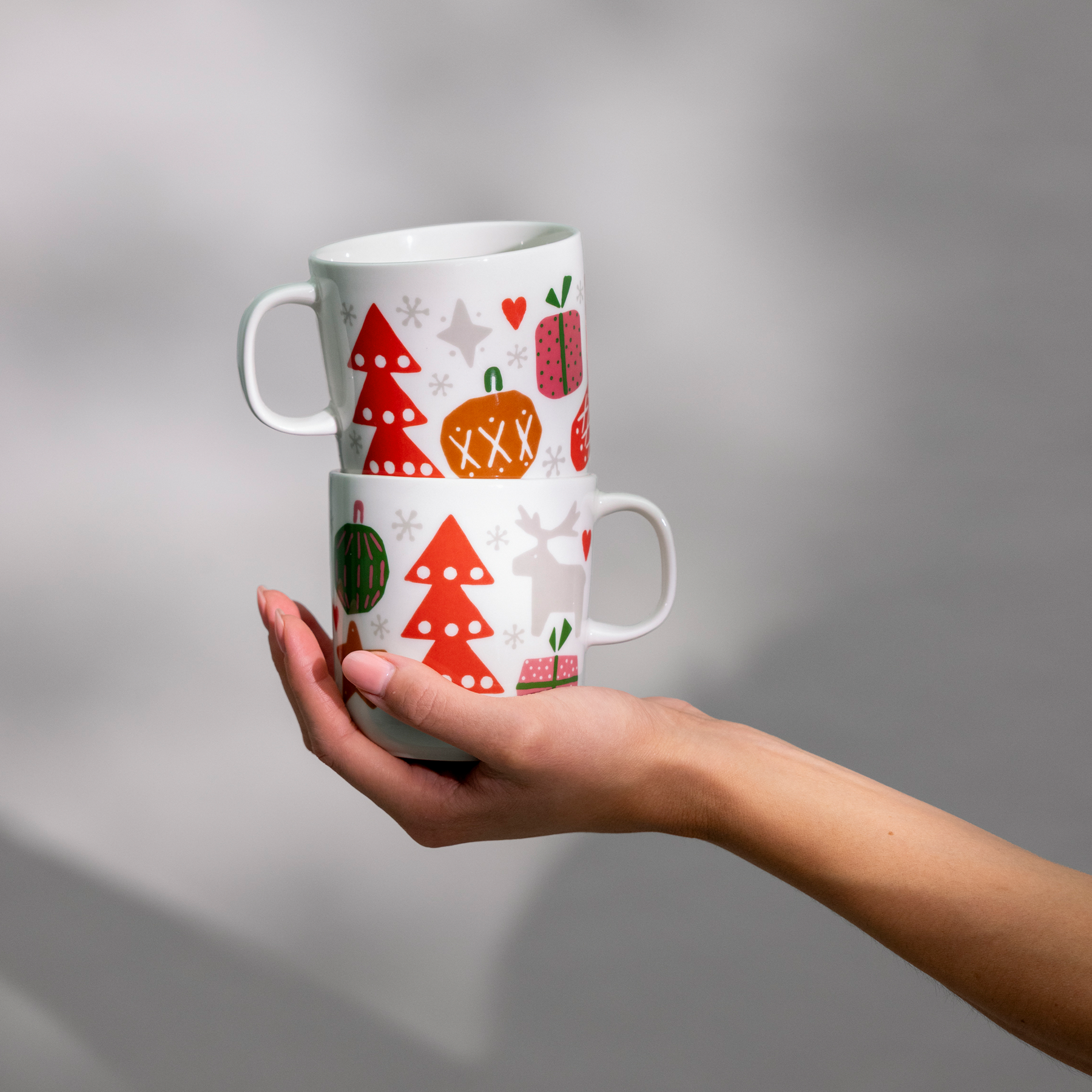 Riemukkaasti kuvioidut Aatto-mukit nostavat hymyn huulille. Graafiset kuviot ovat tuttuja suomalaisesta jouluperinteestä. Aatto-kuosin on suunnitellut Minna Niskakangas.