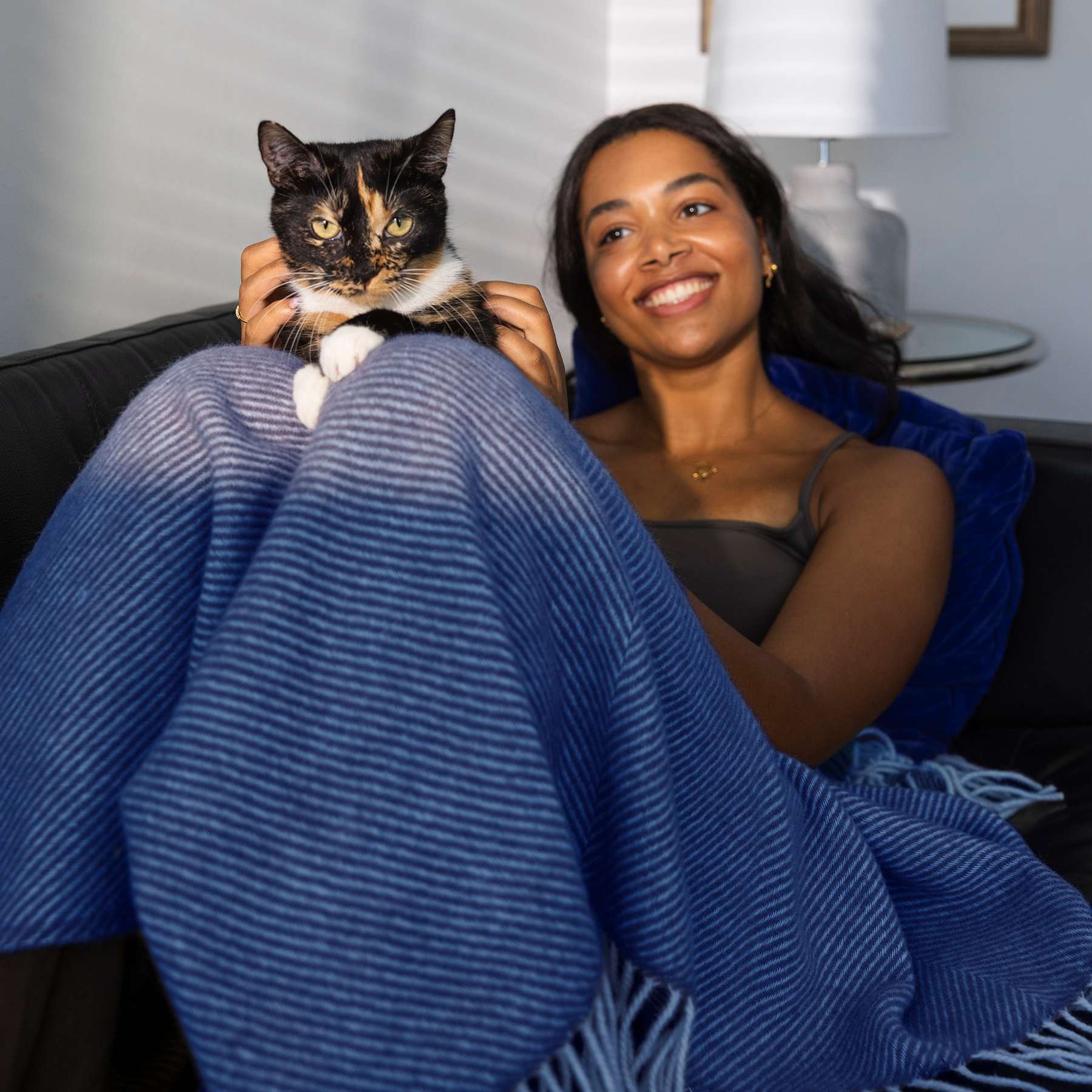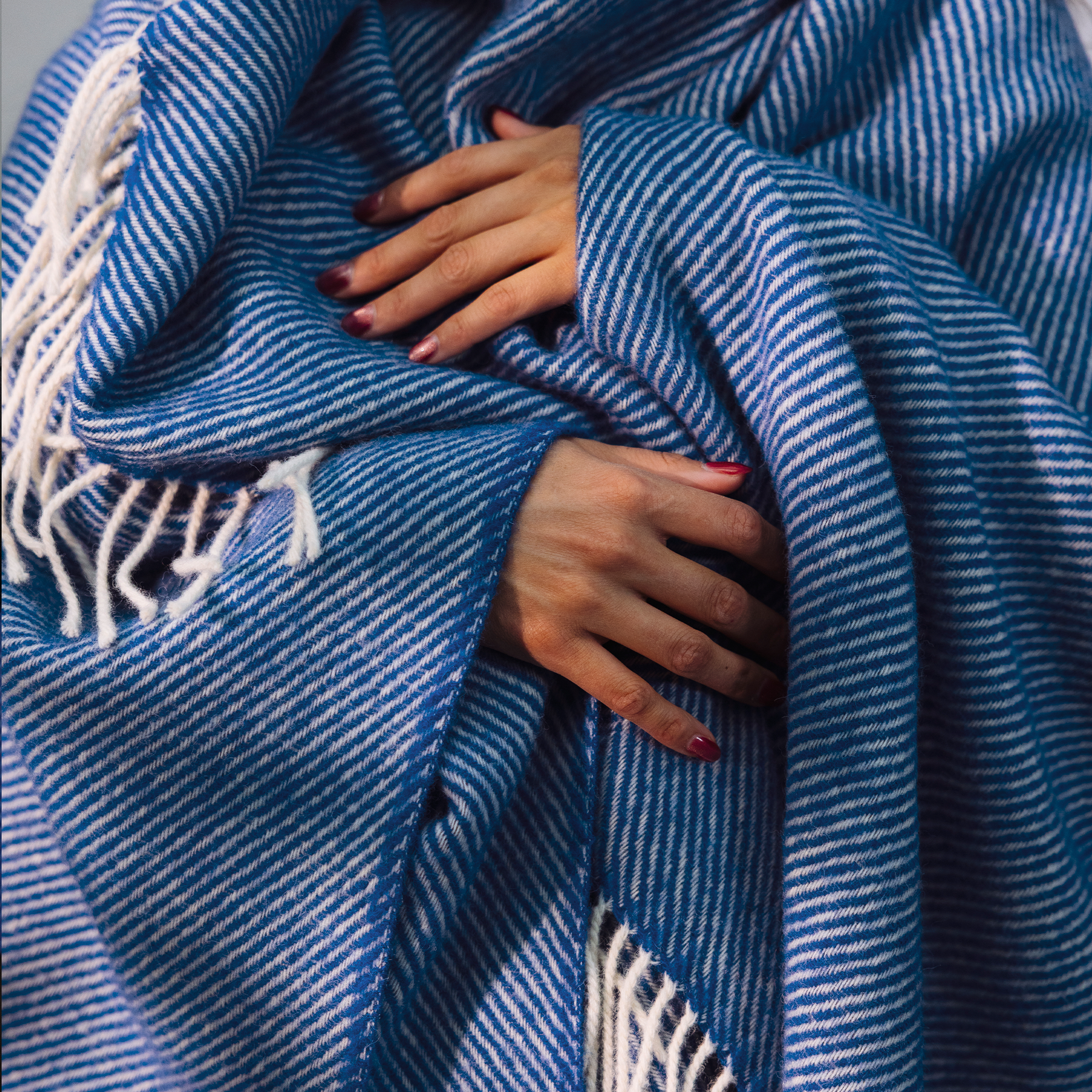 Sininen Aura-torkkuviltti on 100 % villaa, ja sen koko on 130x170 cm. Torkkupeitossa käytetty villa on Uudesta-Seelannista.
