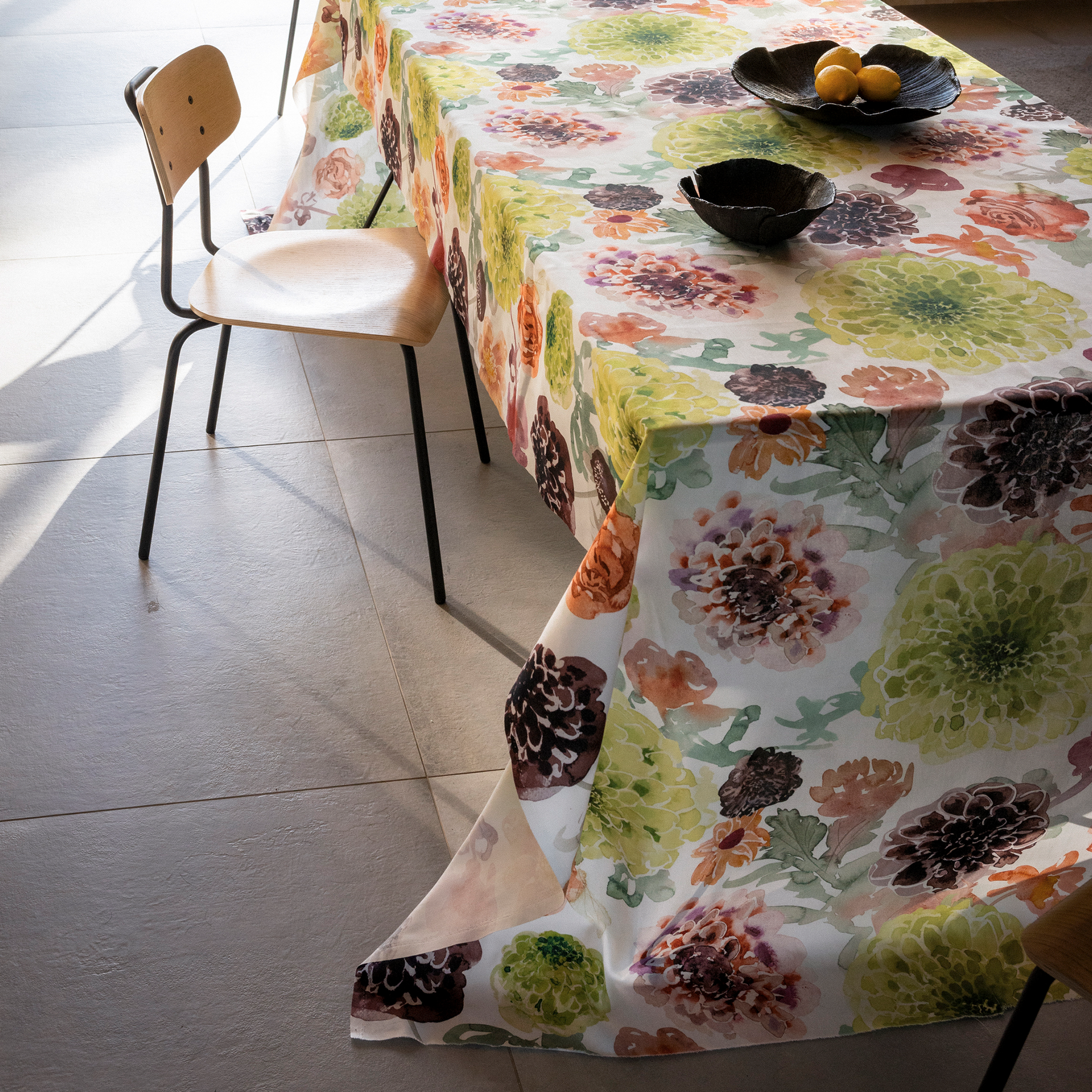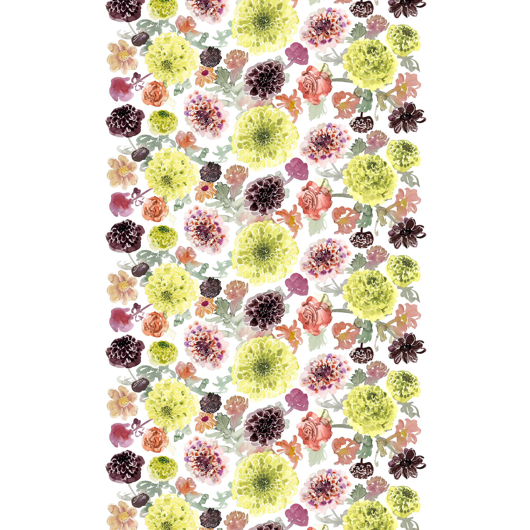 Trendikukka daalia kukkii pitkälle syksyyn saakka ja kantaa muhkeilla kukinnoillaan kesämuistot sisälle koteihimme ilmojen viiletessä ja päivien lyhentyessä. Lasse Kovasen siveltimestä syntyneen Daalia-kuosin lämmin ja hehkuva väriskaala saa kesän jatkumaan hiukan pidempään. Kuosissa on sekä voimaa että herkkyyttä ja sen värit antavat energiaa.