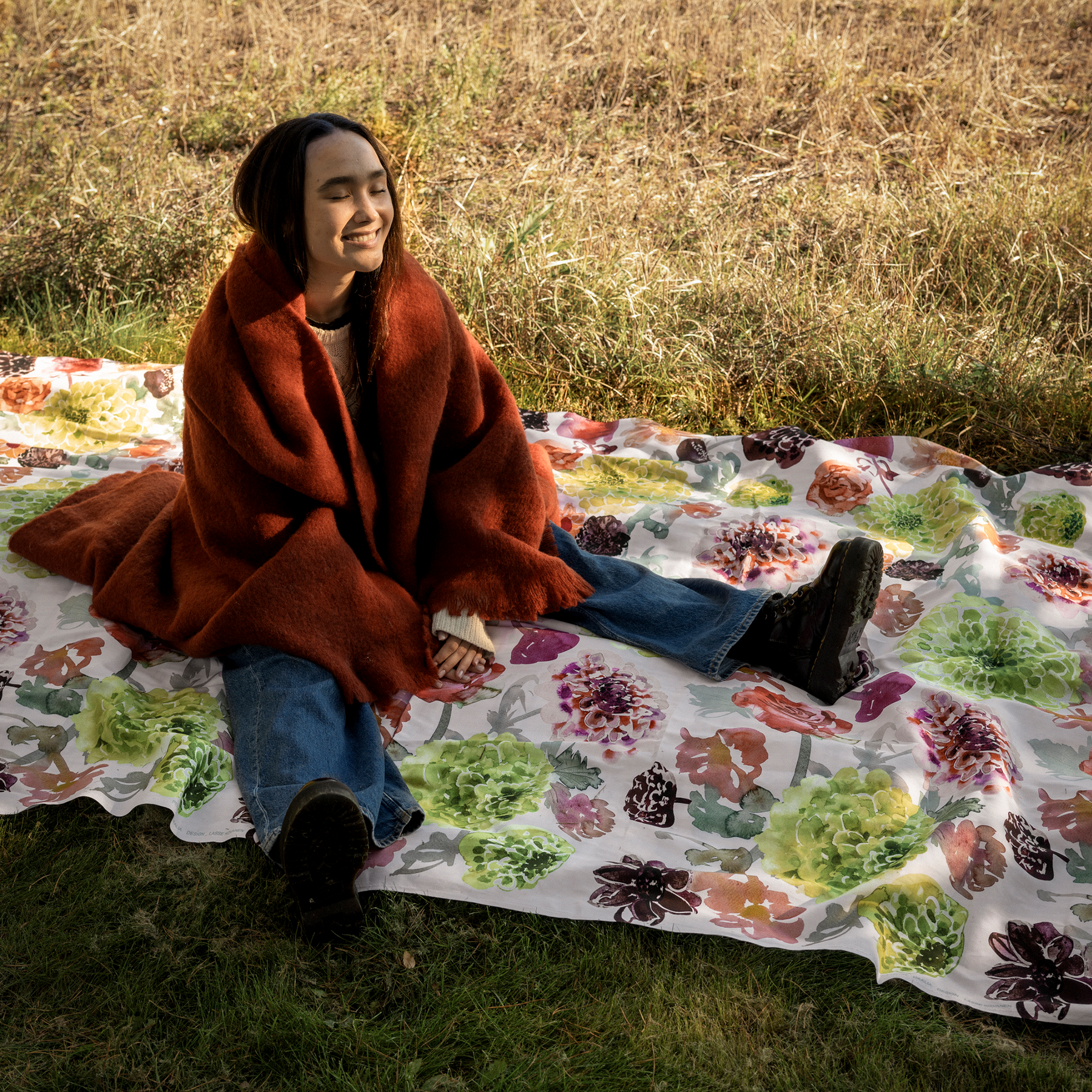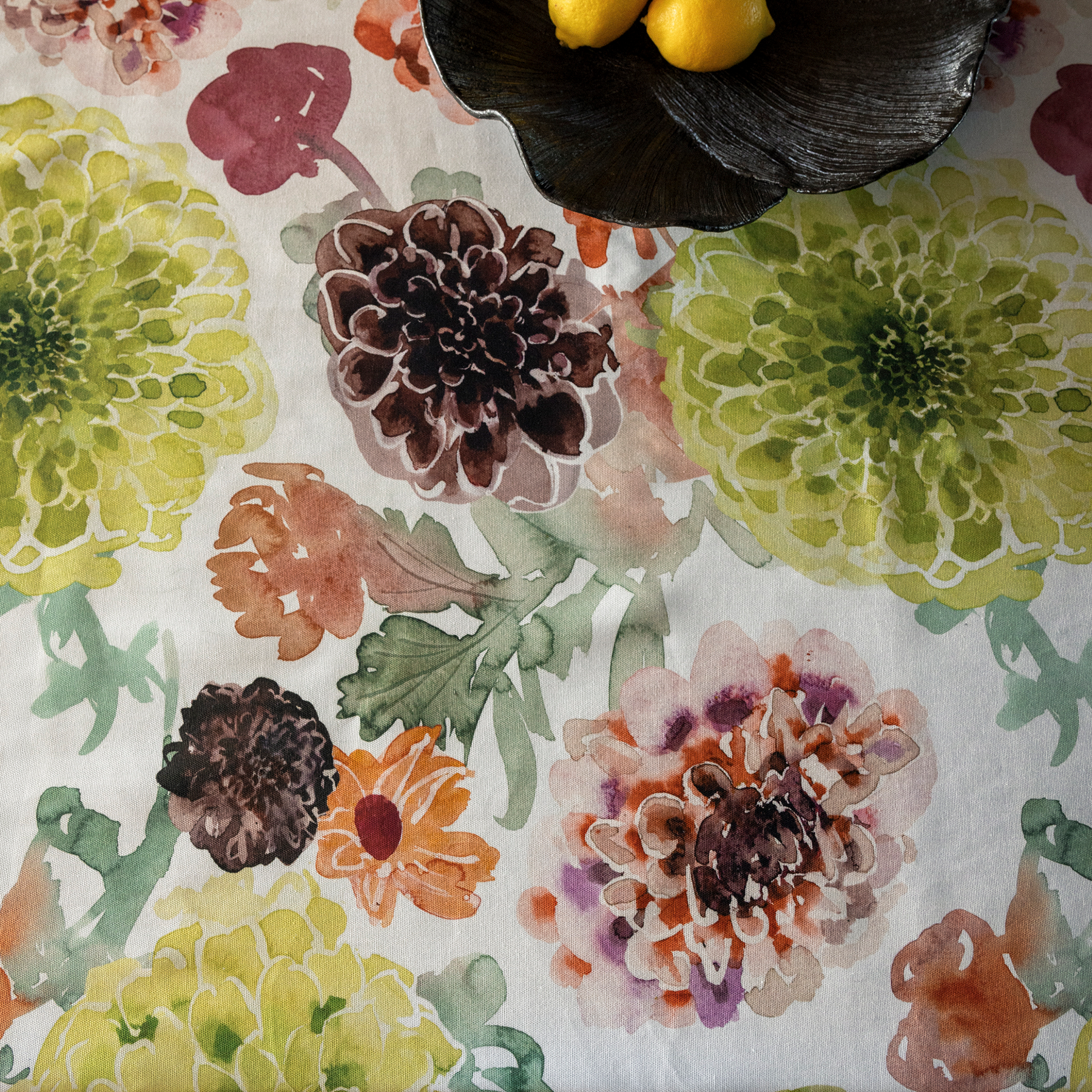Trendikukka daalia kukkii pitkälle syksyyn saakka ja kantaa muhkeilla kukinnoillaan kesämuistot sisälle koteihimme ilmojen viiletessä ja päivien lyhentyessä. Lasse Kovasen siveltimestä syntyneen Daalia-kuosin lämmin ja hehkuva väriskaala saa kesän jatkumaan hiukan pidempään. Kuosissa on sekä voimaa että herkkyyttä ja sen värit antavat energiaa.