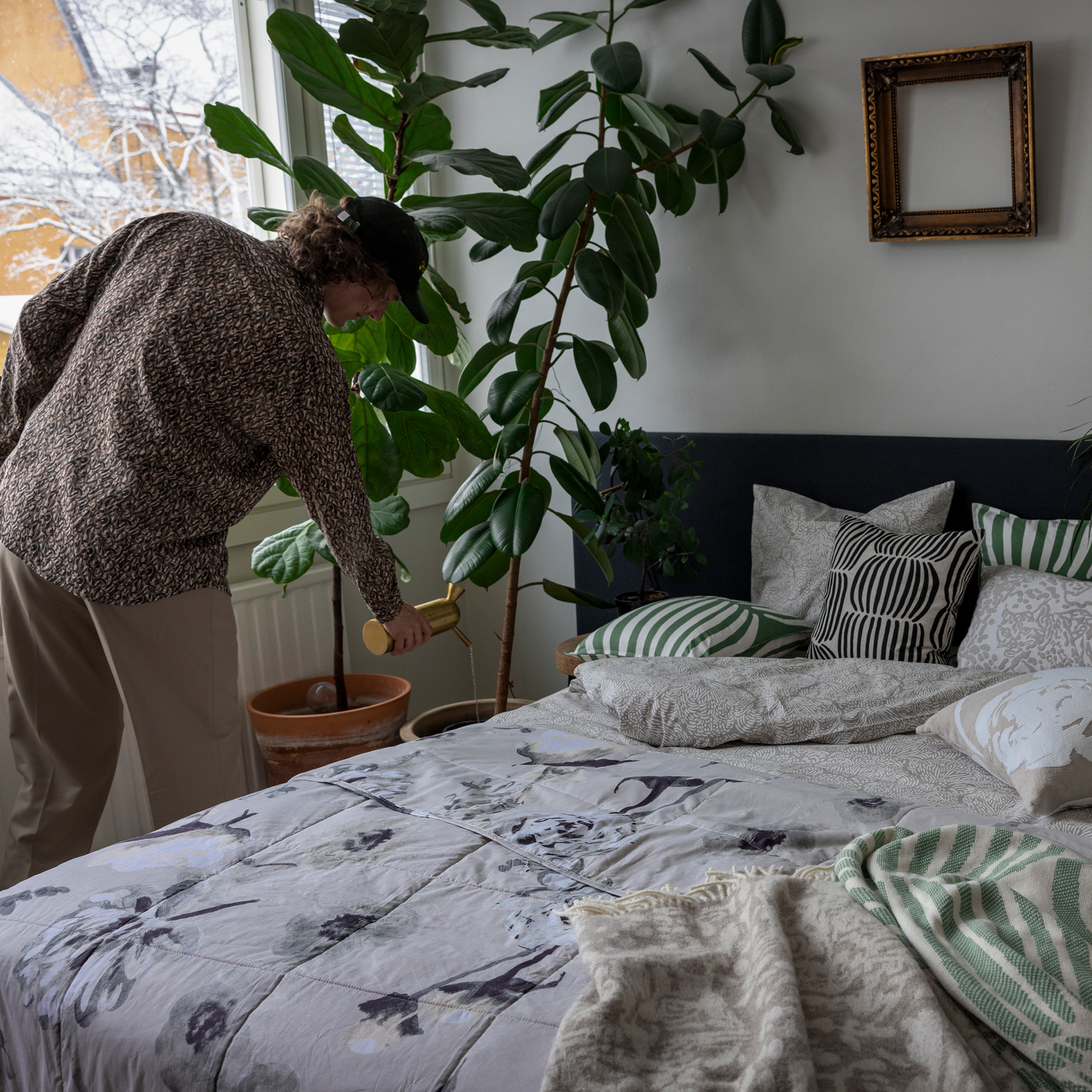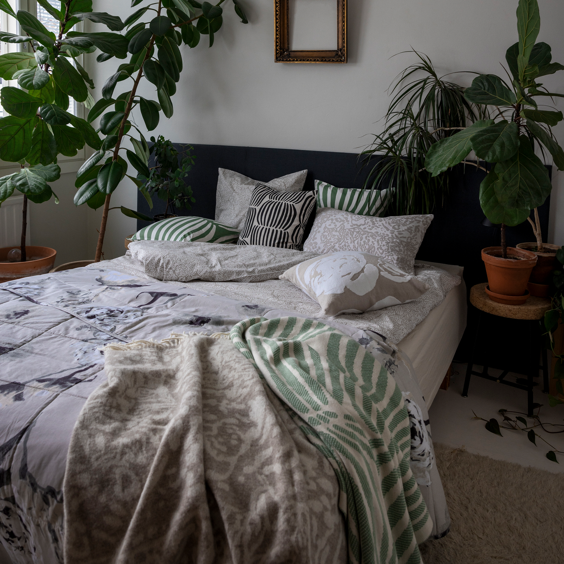 Keväisen vehreyden tuoma energia herättää meissä monessa luovuuden puuskia, jotka puretaan kodin ja puutarhan laittamiseen. Teemme tilaa uudelle, haaveilemme ja innostumme. Lasse Kovasen suunnittelema Freesia tuntuu samalta kuin tuo levottoman jännittävä keväthyrinä. Perinteisellä, ikonimaalauksessakin käytetyllä tempera-tekniikalla nopeasti ja lennokkaasti maalattu kuosi on täynnä yksityiskohtia, jotka ovat syntyneet maalaustavalle tyypillisestä läpikuultavuudesta ja kerroksellisuudesta. Lasse käytti maalatessaan reilusti pohjamaalia ja antoi märkien siveltimien jättämien maalivalumien jäädä näkyviin. Freesia-kuosinen tikattu päiväpeitto viimeistelee makuuhuoneen sisustuksen.