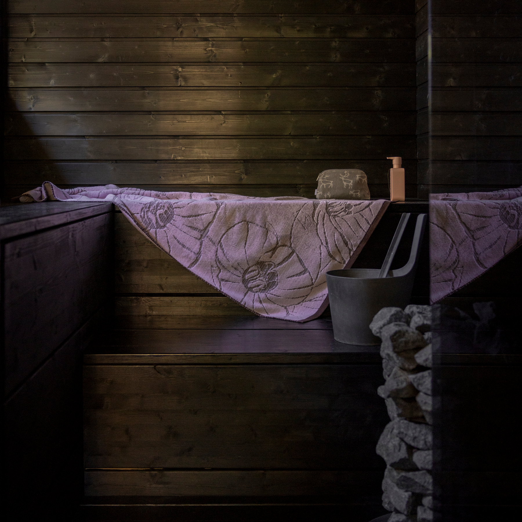Vaaleanpunainen Haave-kylpypyyhe on kooltaan 70x150 cm ja 100 % puuvillafroteeta.