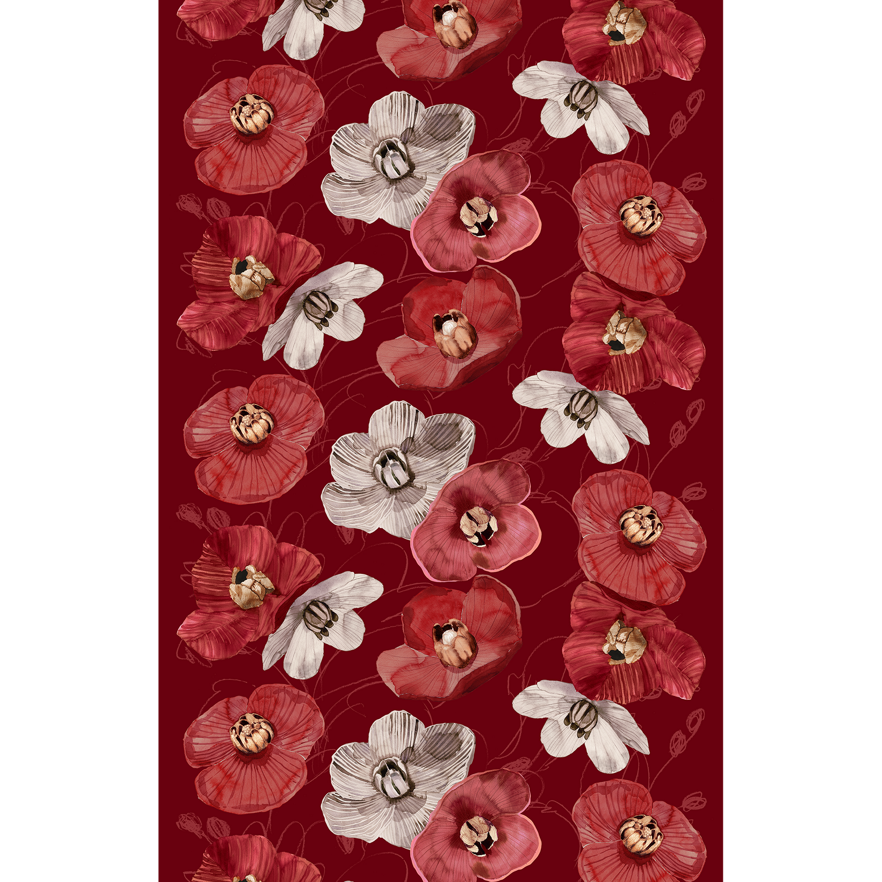 Punainen Haave-puuvillasatiinikangas on 100% puuvillasatiinia. Sen leveys on 150 cm ja kuosin raporttikoko on 87 cm.