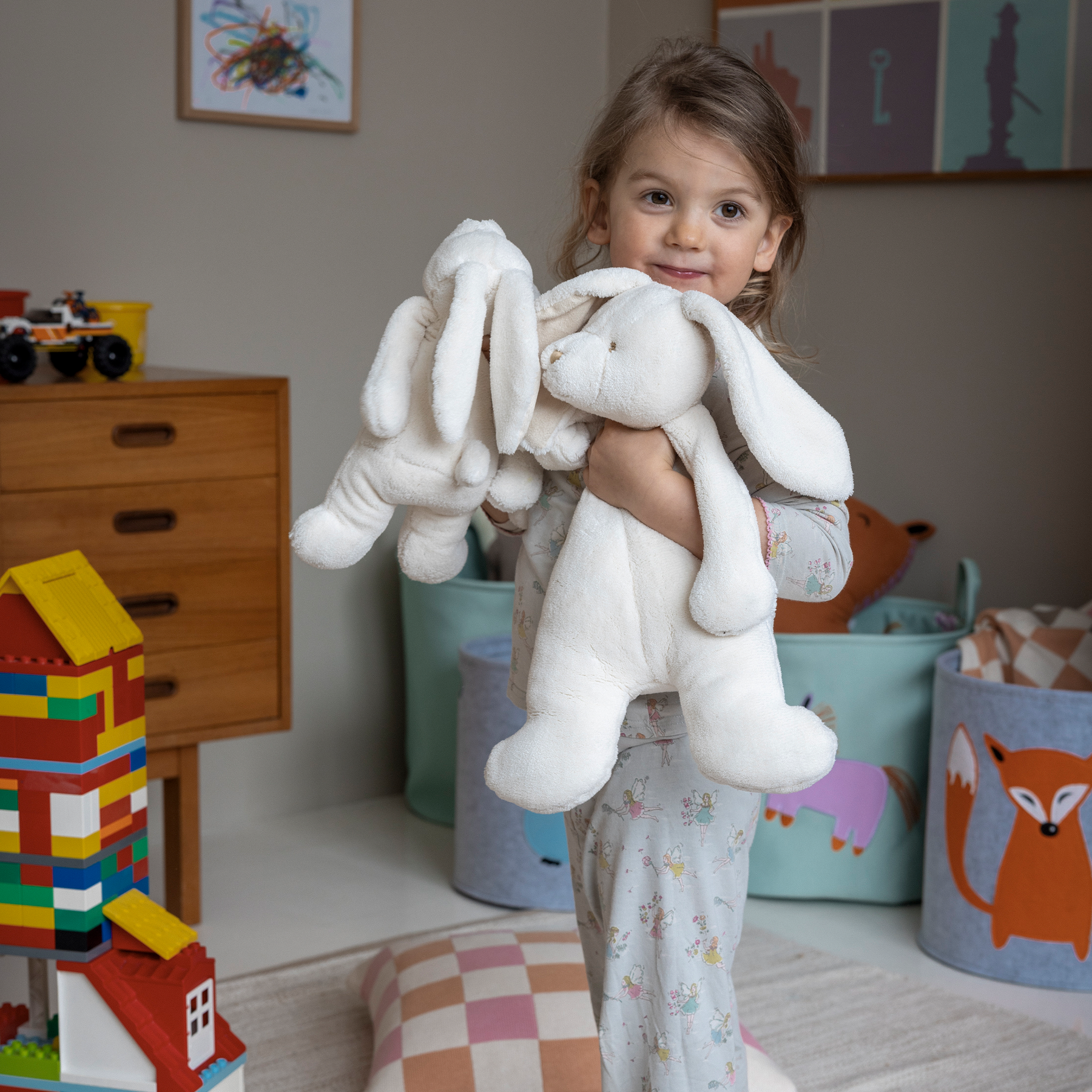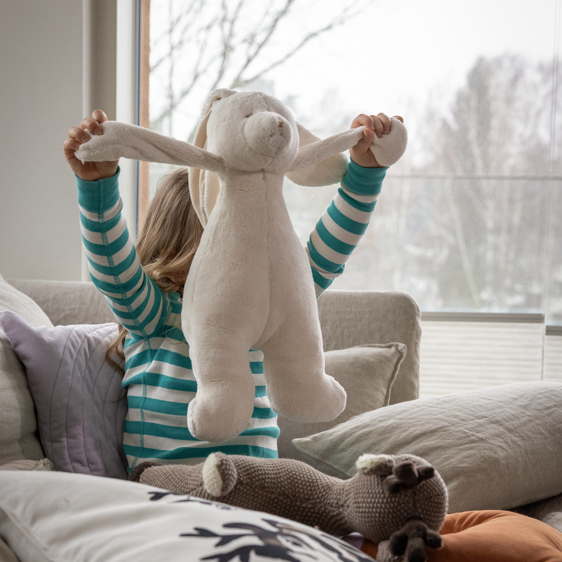 Luonnonvalkoinen Halipupu on kooltaan 39 cm ja sille suositellaan käsinpesua.