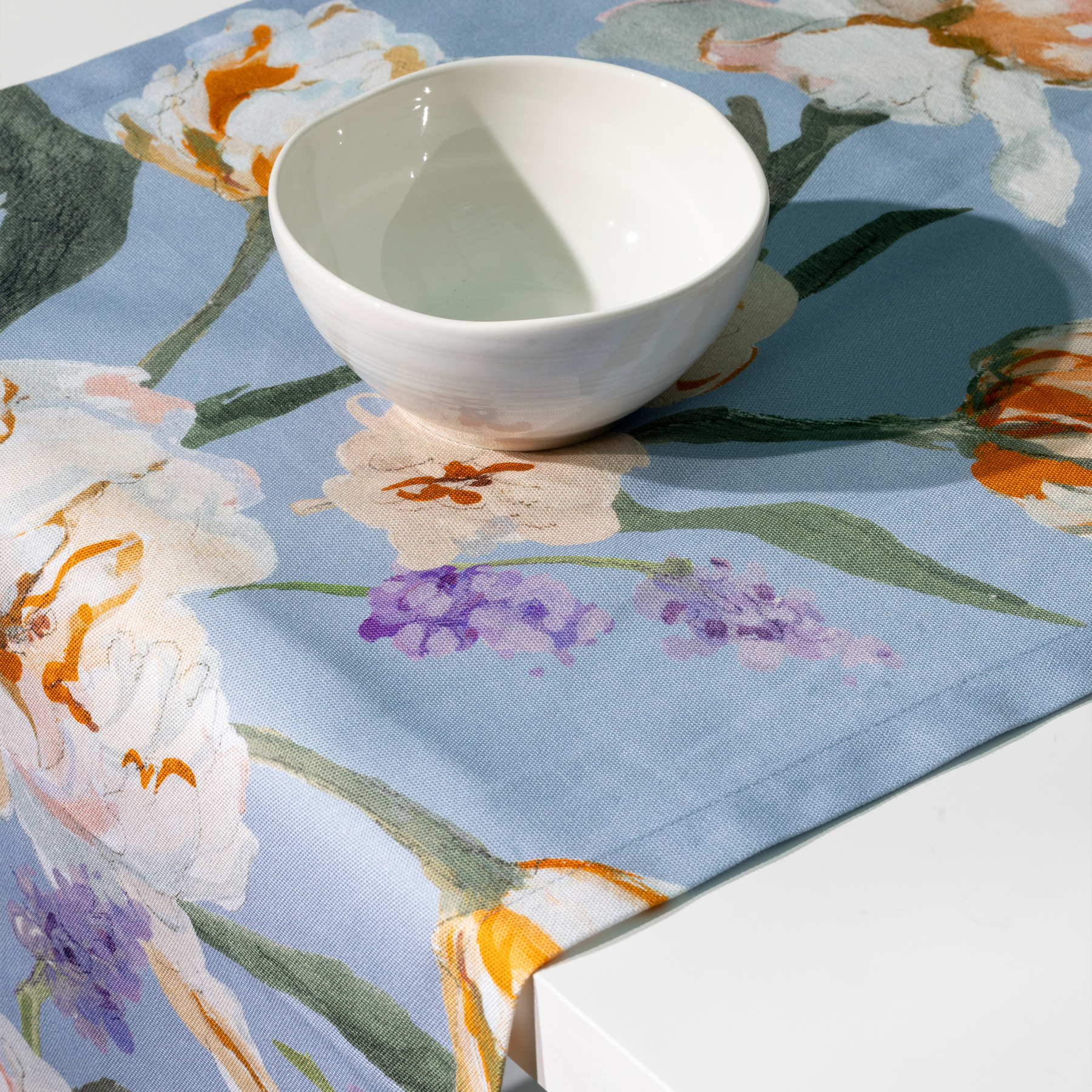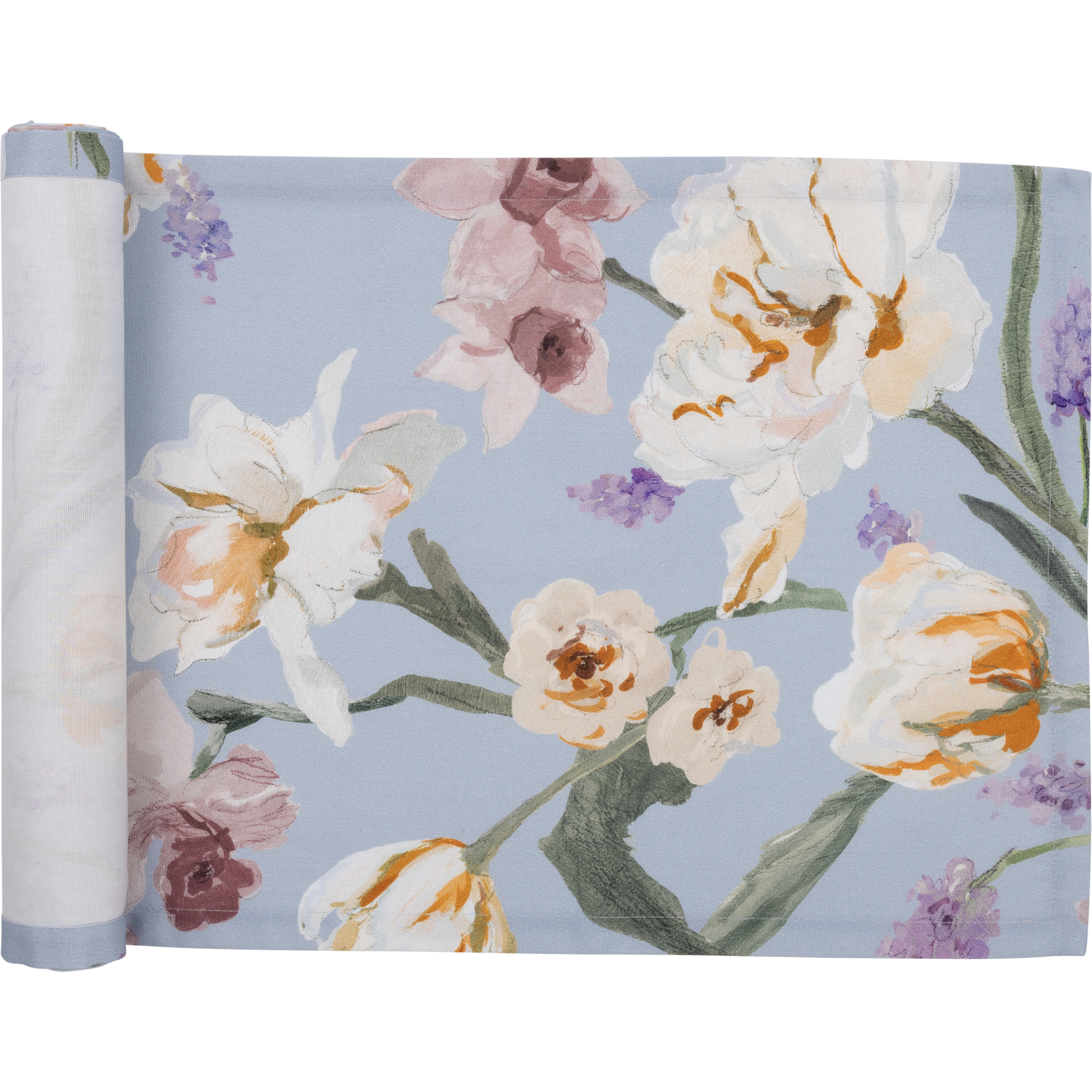 Helmililja-sarjan vaaleansininen akryylipinnoitettu kaitaliina on mitoiltaan 45x160 cm. Kestää konepesun varovaisella ohjelmalla 40 asteessa.