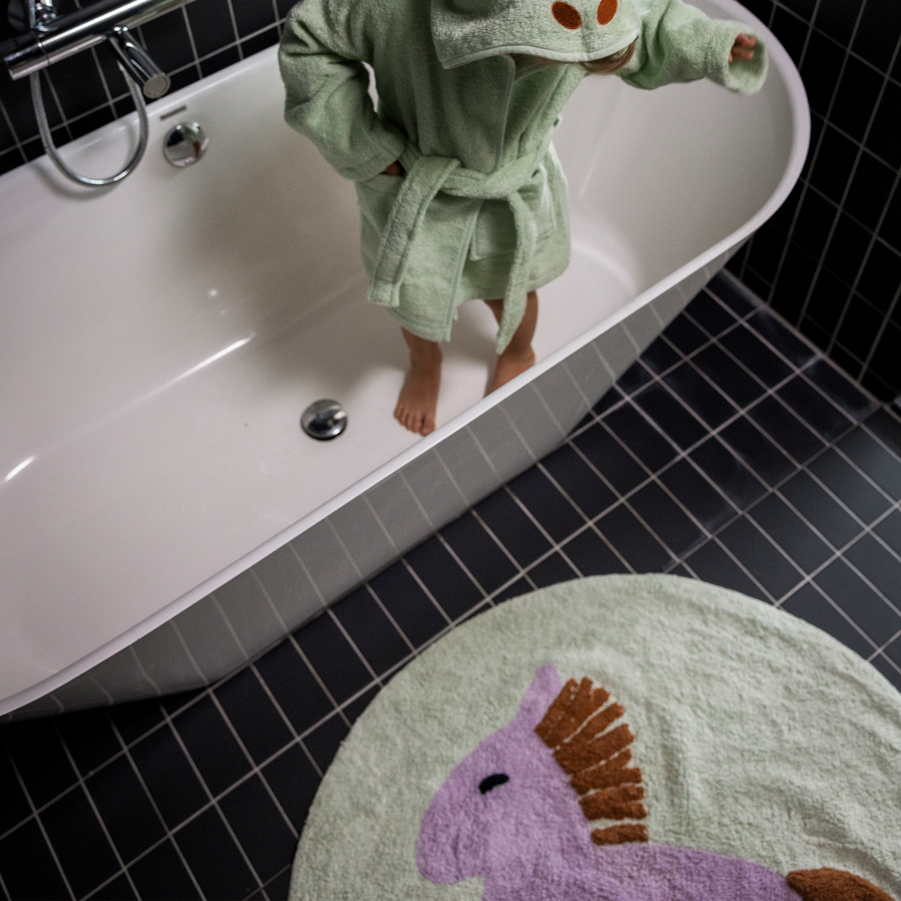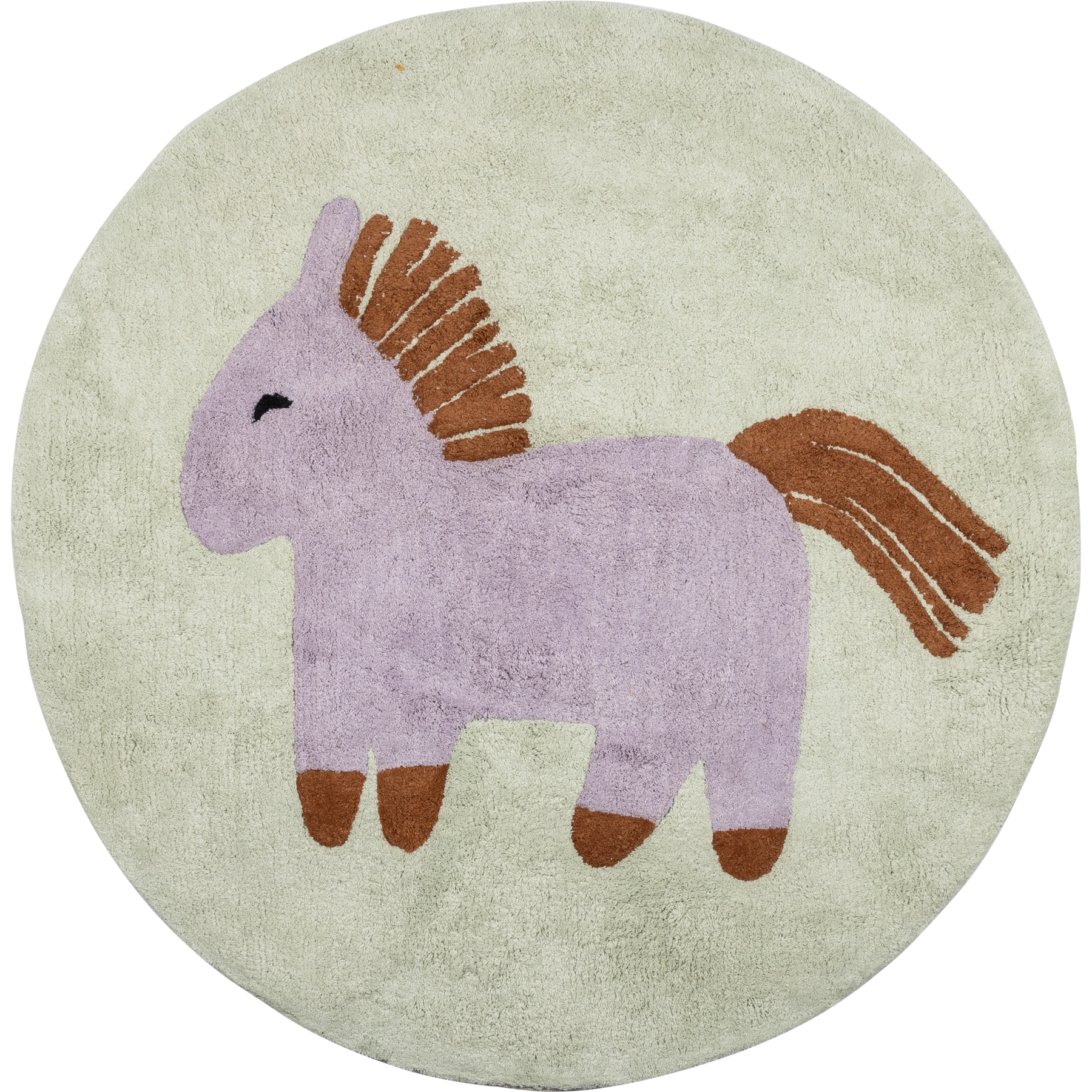 Vaaleanvihreän Heppa-maton halkaisija on 100 cm ja sen materiaali on 90 % puuvillaa ja 10 % keinokuitusekoitetta.