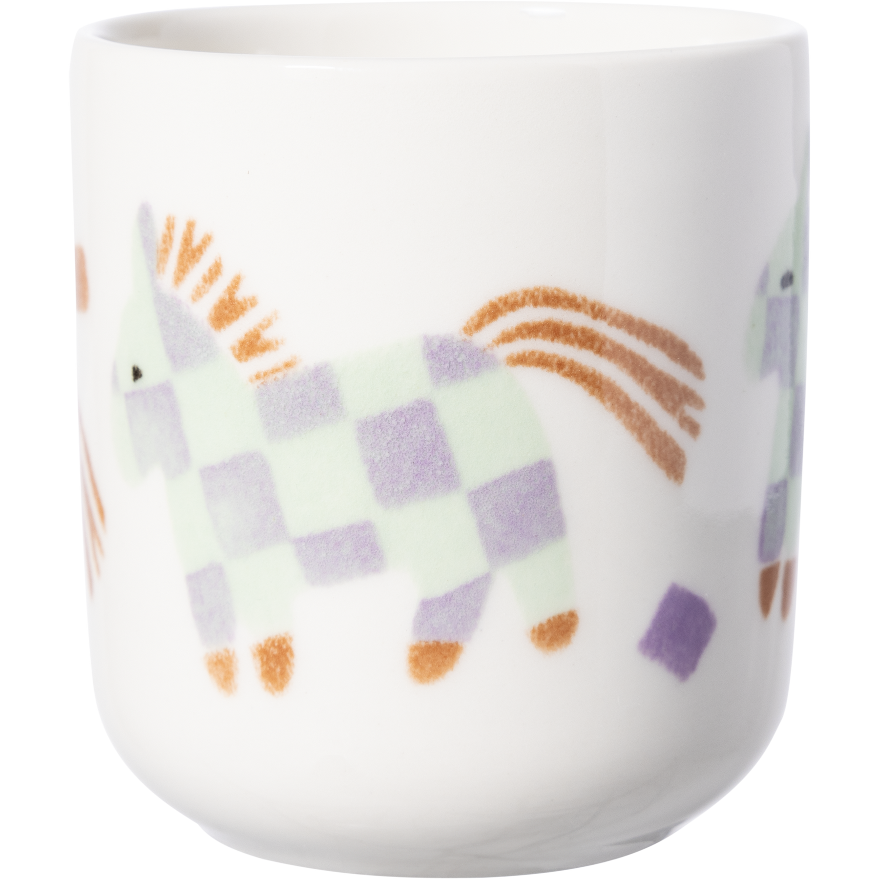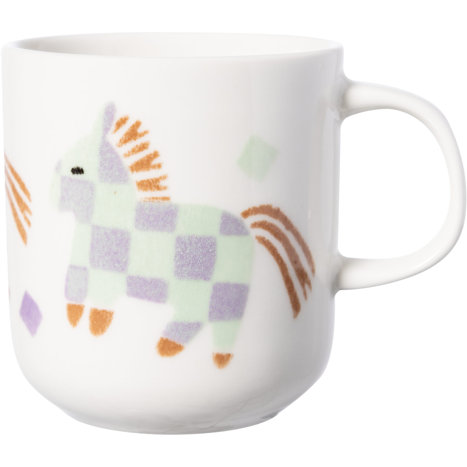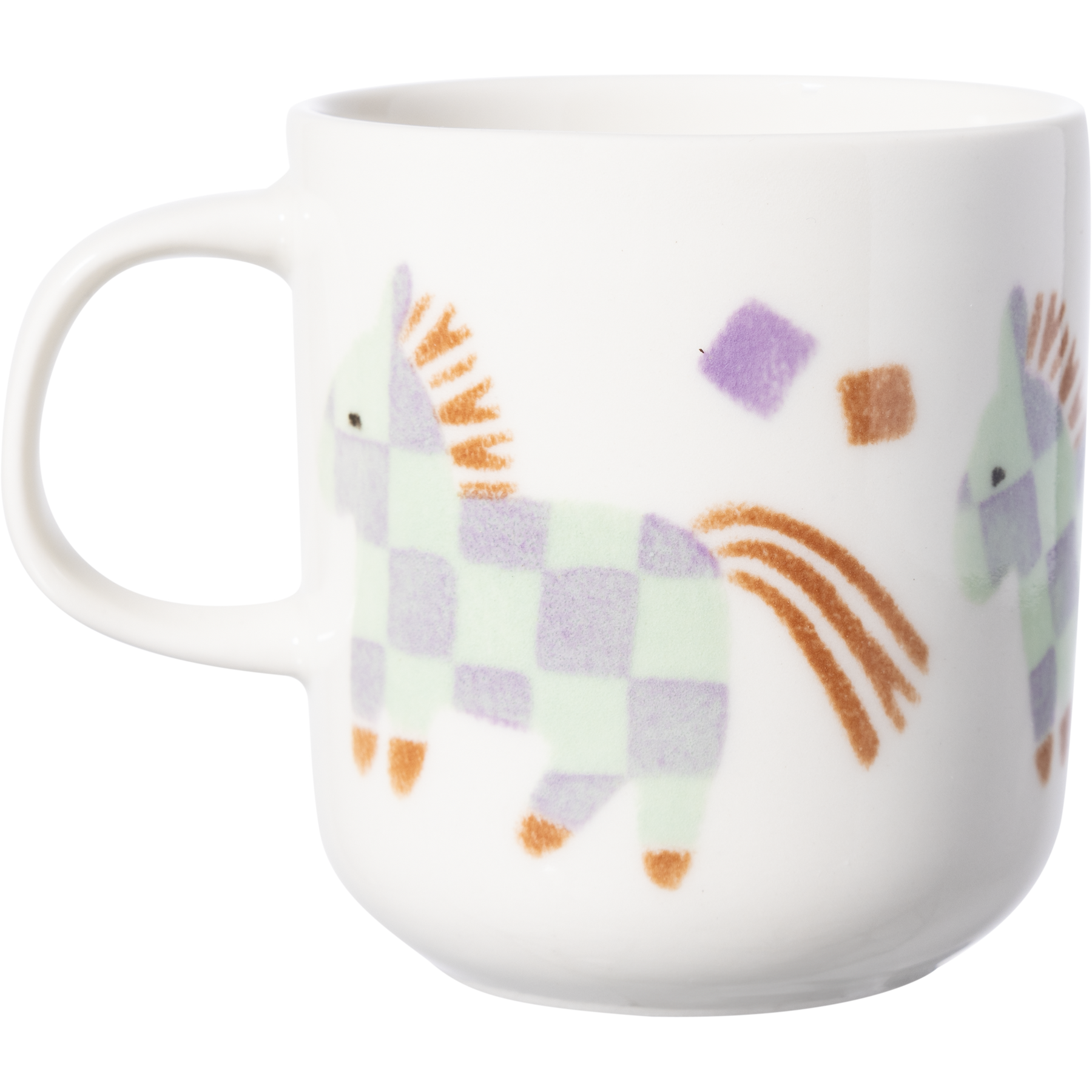 Lasten elämä on täynnä valtavia tunteita. Hurjan jännittäviä hetkiä, räiskyvän suuria iloja sekä maata mullistavia suruja. Useimmiten kaikki yhdessä päivässä. Toisinaan energiaa on kuin villinä laukkaavalla varsalla. Ruokailuhetkien ajaksi malttaa kuitenkin rauhoittua paikoilleen, kun astioita koristaa Minna Niskakankaan suunnittelema Heppa-kuvitus. Muki on valmistettu Suomessa, Pentikin omalla keramiikkatehtaalla.