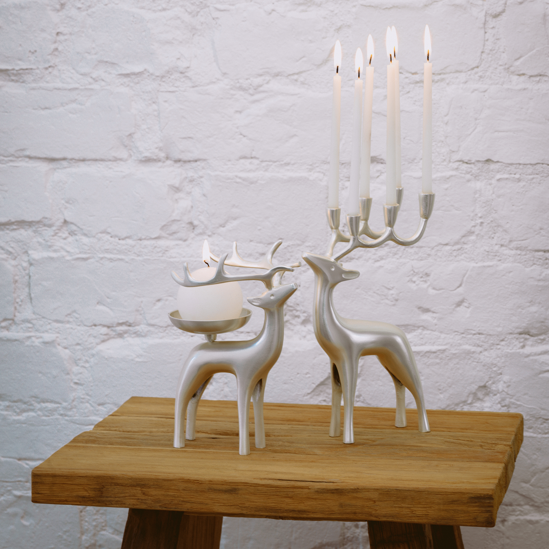 Pentikin näyttävät, hopeoidut porot huokuvat Lapin taikaa. Uljas, hopeoitu porokynttelikkö on todellinen klassikko ja haluttu lahja, joka tuo arvokasta tunnelmaa sisustukseen. 24 cm korkeaan porokynttelikköön sopivat pienemmät tuohuskynttilät.