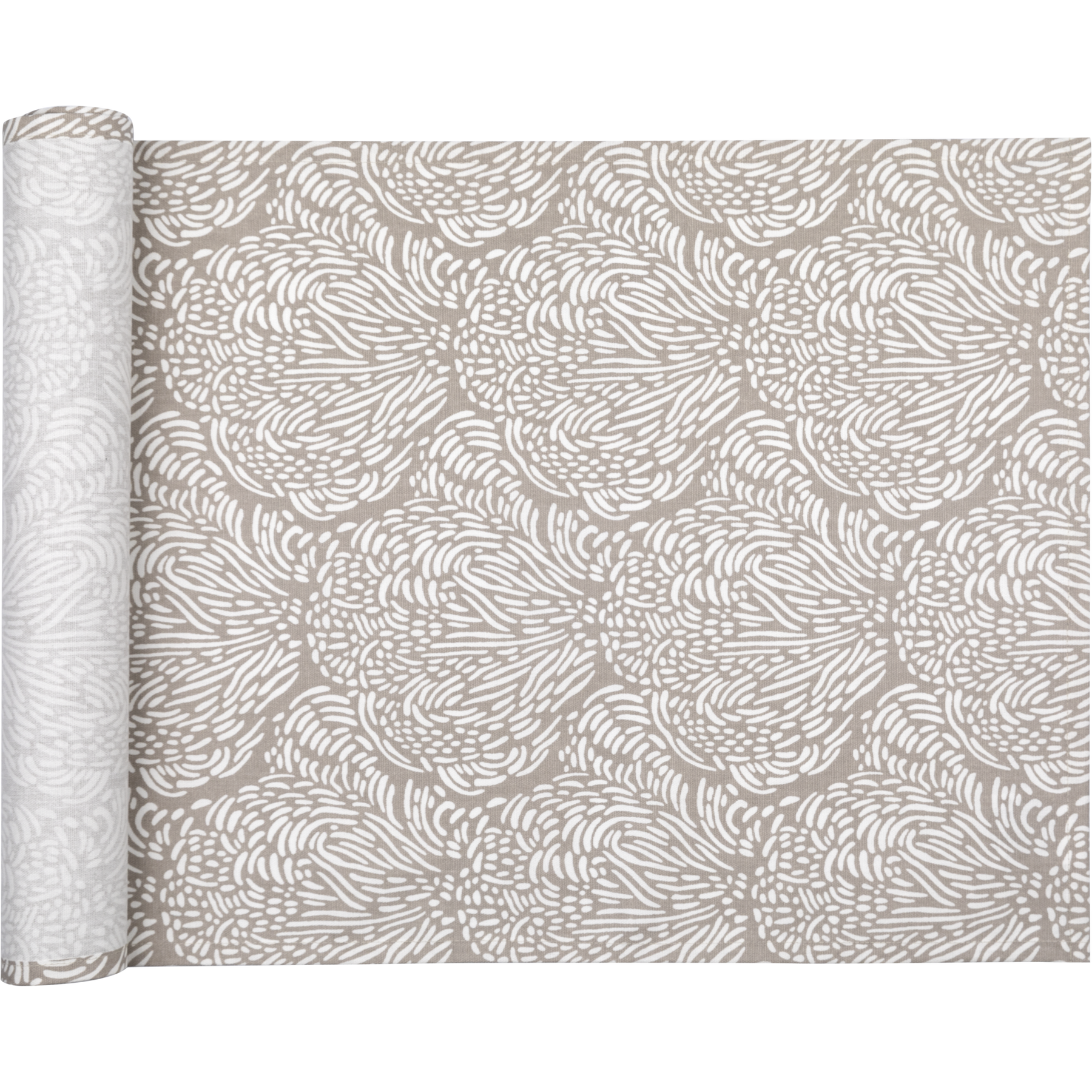 Vaaleanruskean Jäkälä-kaitaliinan koko on 45x160 cm. Kaitaliina on akryylipinnoitettua puuvillakangasta, joka on käytännöllinen valinta ruokapöytään, sillä se hylkii likaa ja on helppo pyyhkiä puhtaaksi. Konepesu varovaisella ohjelmalla 40 asteessa. Voi kutistua ensimmäisessä pesussa enintään 3%.