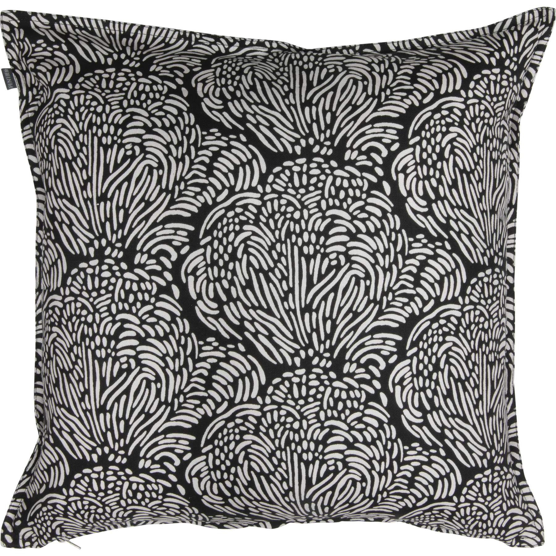 Mustan tyynynpäällisen koko on 45x45 cm, ja siihen sopii parhaiten Pentikin 48x48 cm kokoinen untuva/höyhen-sisätyyny. Tyynynpäällinen on 100 % puuvillaa, ja sen voi pestä koneessa 60 asteessa.