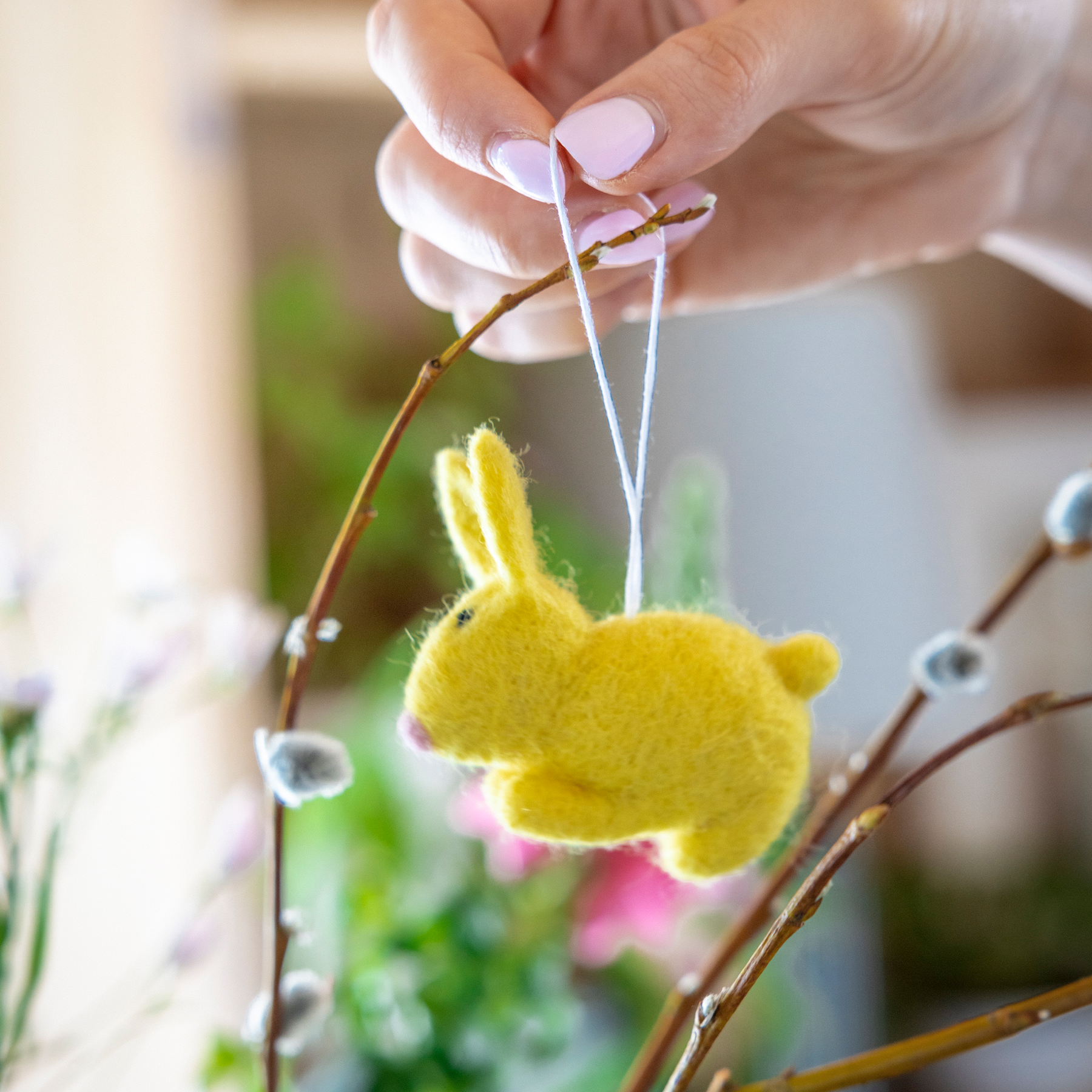 Pääsiäisen tienoilla pohjolan puput vaihtavat väriään. Osa näköjään pirteän keltaiseksi! Suloinen Jänönen on lämminhenkinen yksityiskohta pajunoksalla roikkuessaan ja tuo hymyn huulille vuodesta toiseen. Keltainen Jänönen-huopakoriste on kooltaan 6 cm.