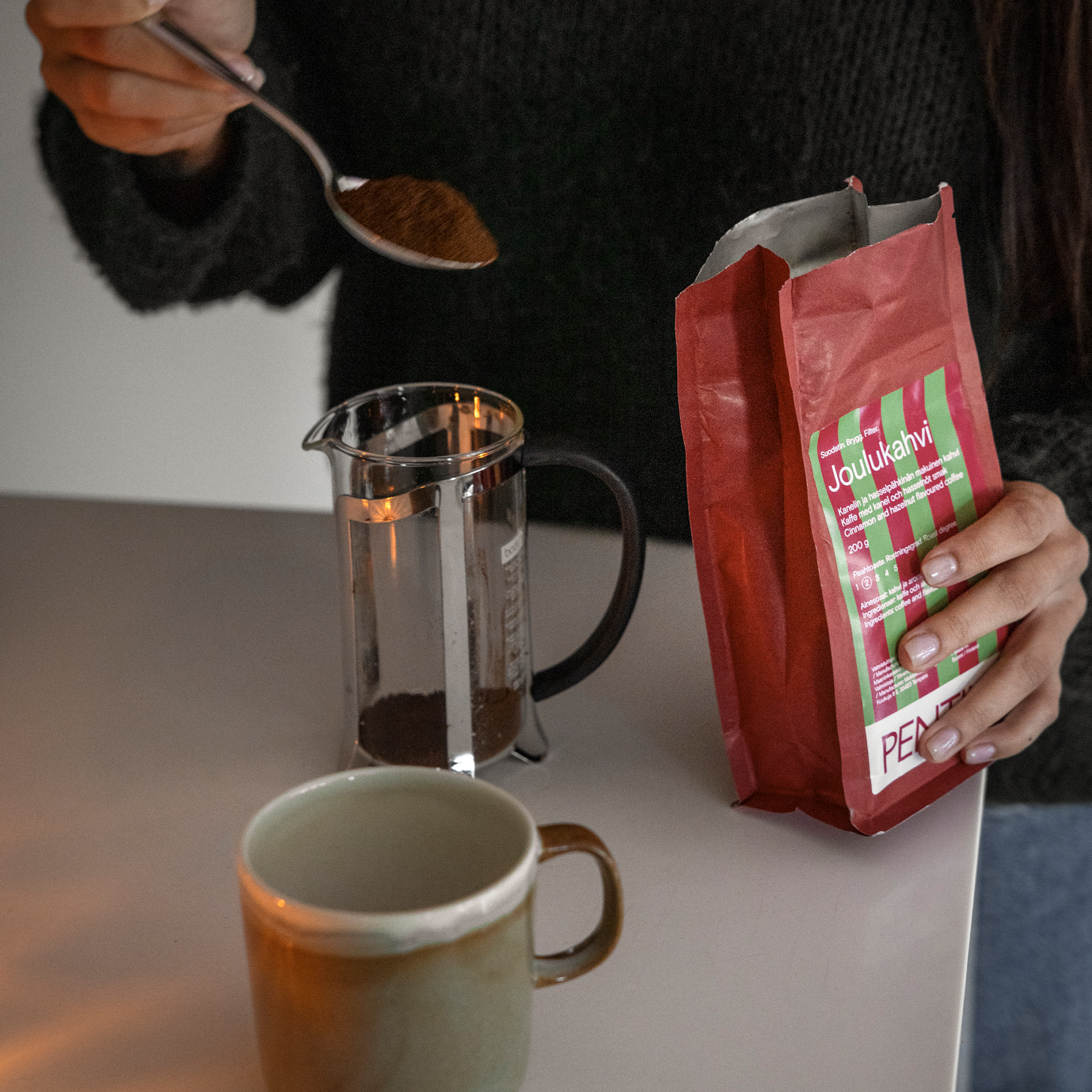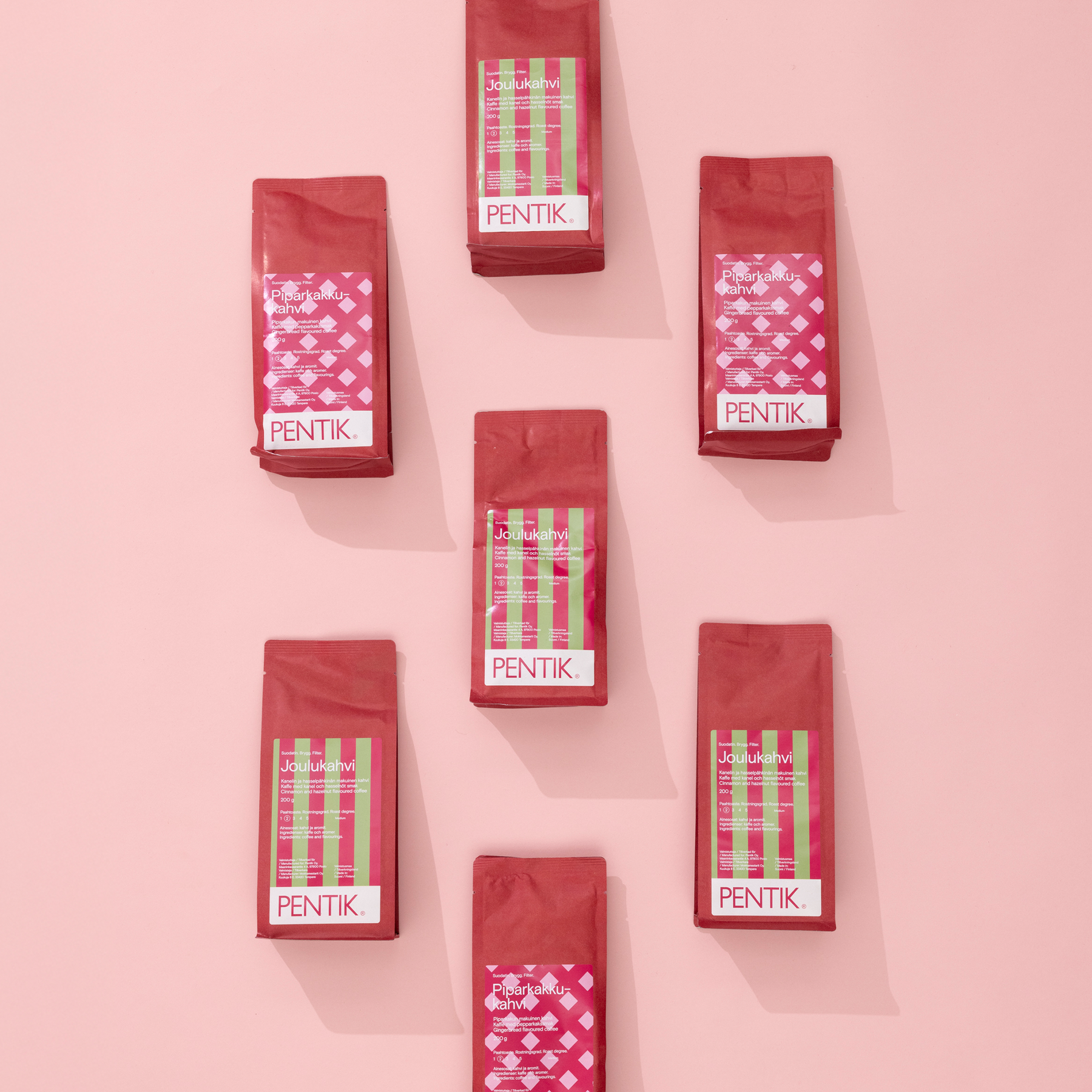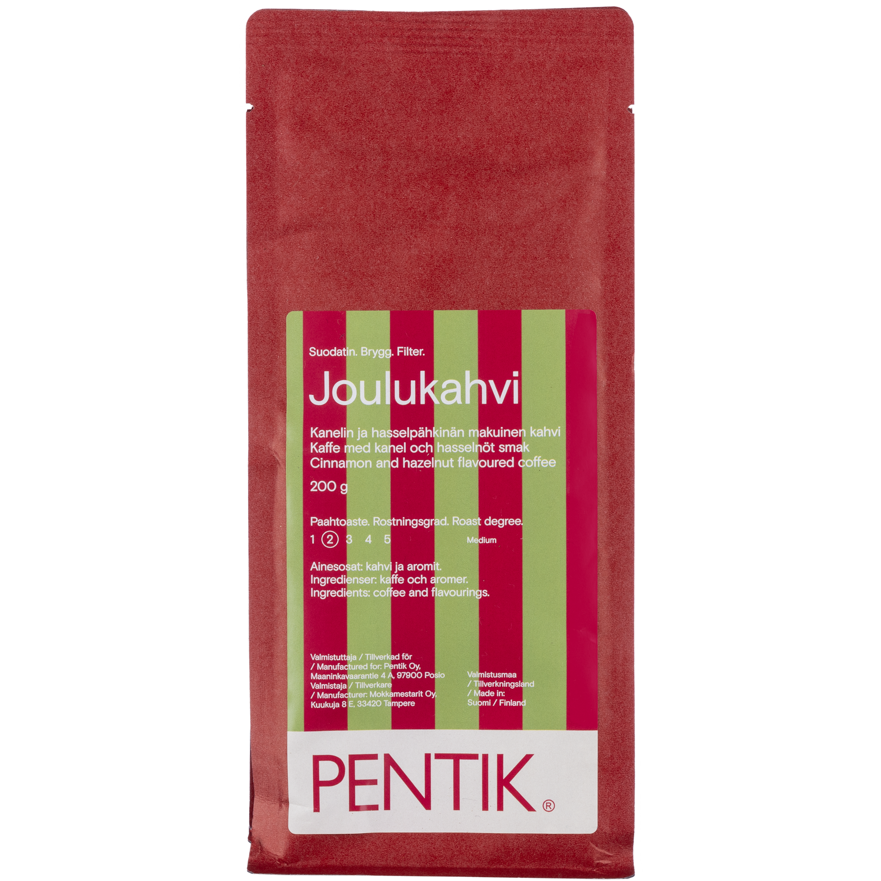 Jouluisiin kahvihetkiin tai herkkulahjaksi sopiva Joulukahvi on kanelin ja hasselpähkinän makuinen Arabica-kahvi. Pentikin Joulukahvi valmistetaan Suomessa, Tampereella Mokkamestareiden kahvipaahtimolla. Jos haluat nauttia makukahvin aromit voimakkaimmillaan, keitä se sellaisenaan tavallisen suodatinkahvin tapaan. Voit myös sekoittaa Joulukahvia lempisuodatinkahvisi sekaan. Suodatinjauhatus.