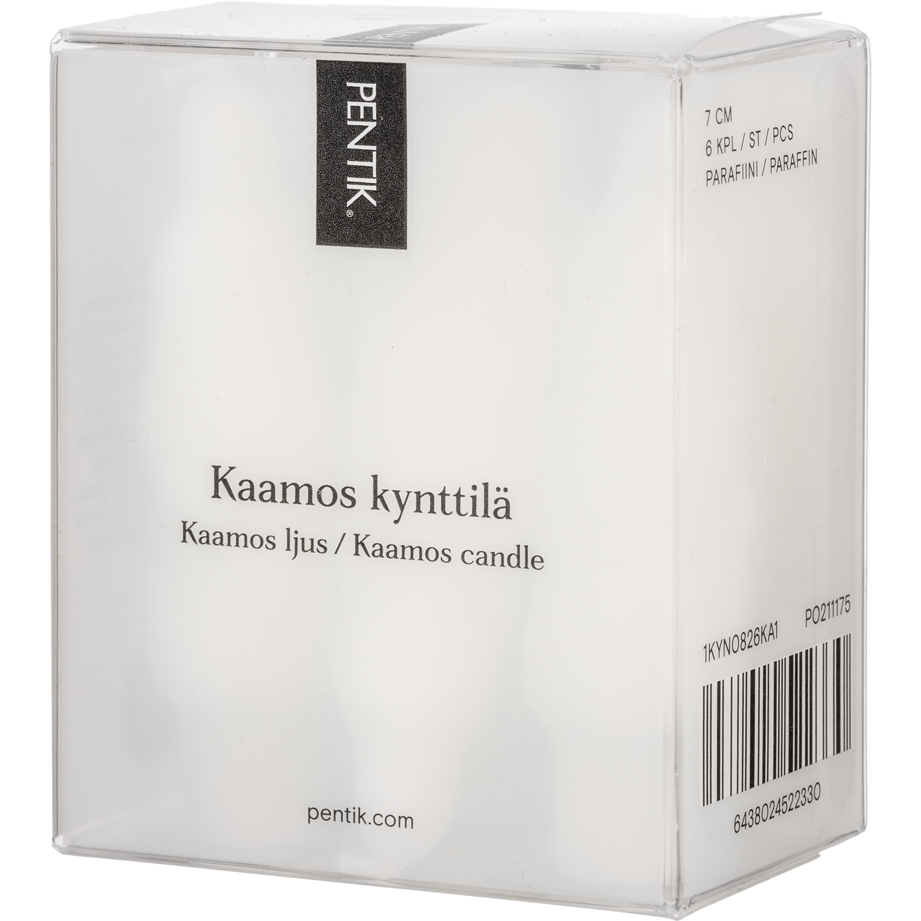 Kaamos-kynttilä on suunniteltu juuri Kaamoskiviä varten ja suosittelemme vain niiden käyttöä kynttilänjalassa, sillä sitä ei ole testattu muilla kynttilöillä ja näin ollen emme voi taata tuotteen turvallisuutta muita kynttilöitä poltettaessa. Laatikko sisältää kuusi valkoista, 7 cm pituista Kaamos-kynttilää.