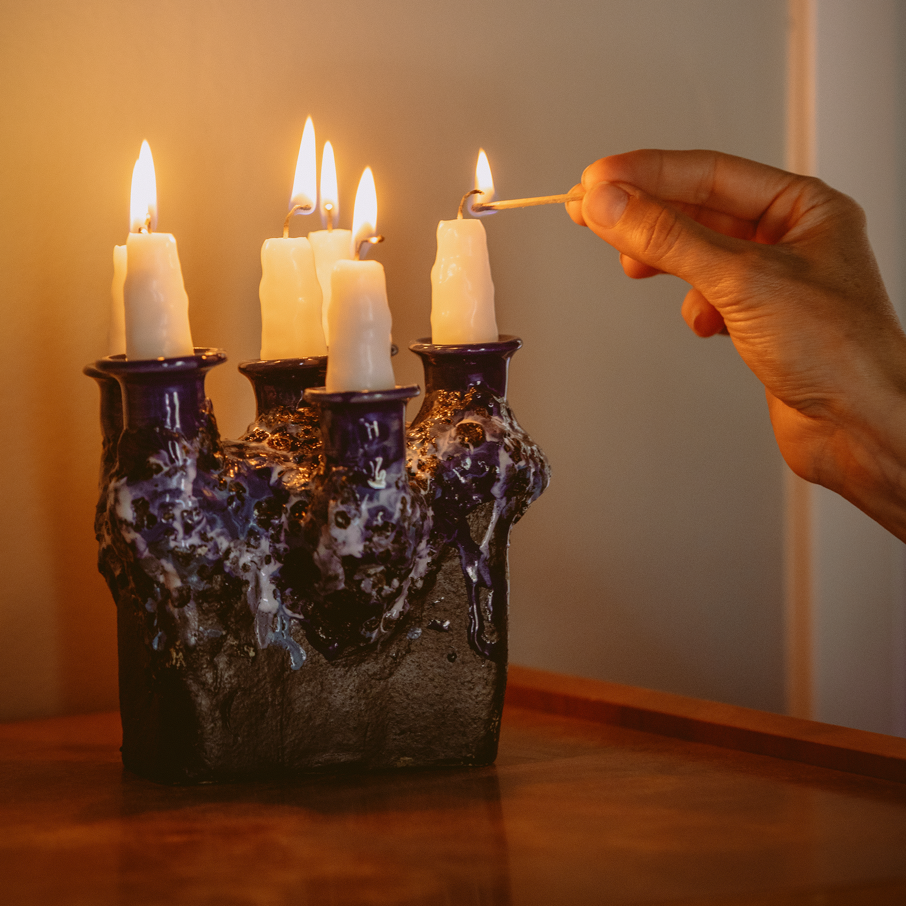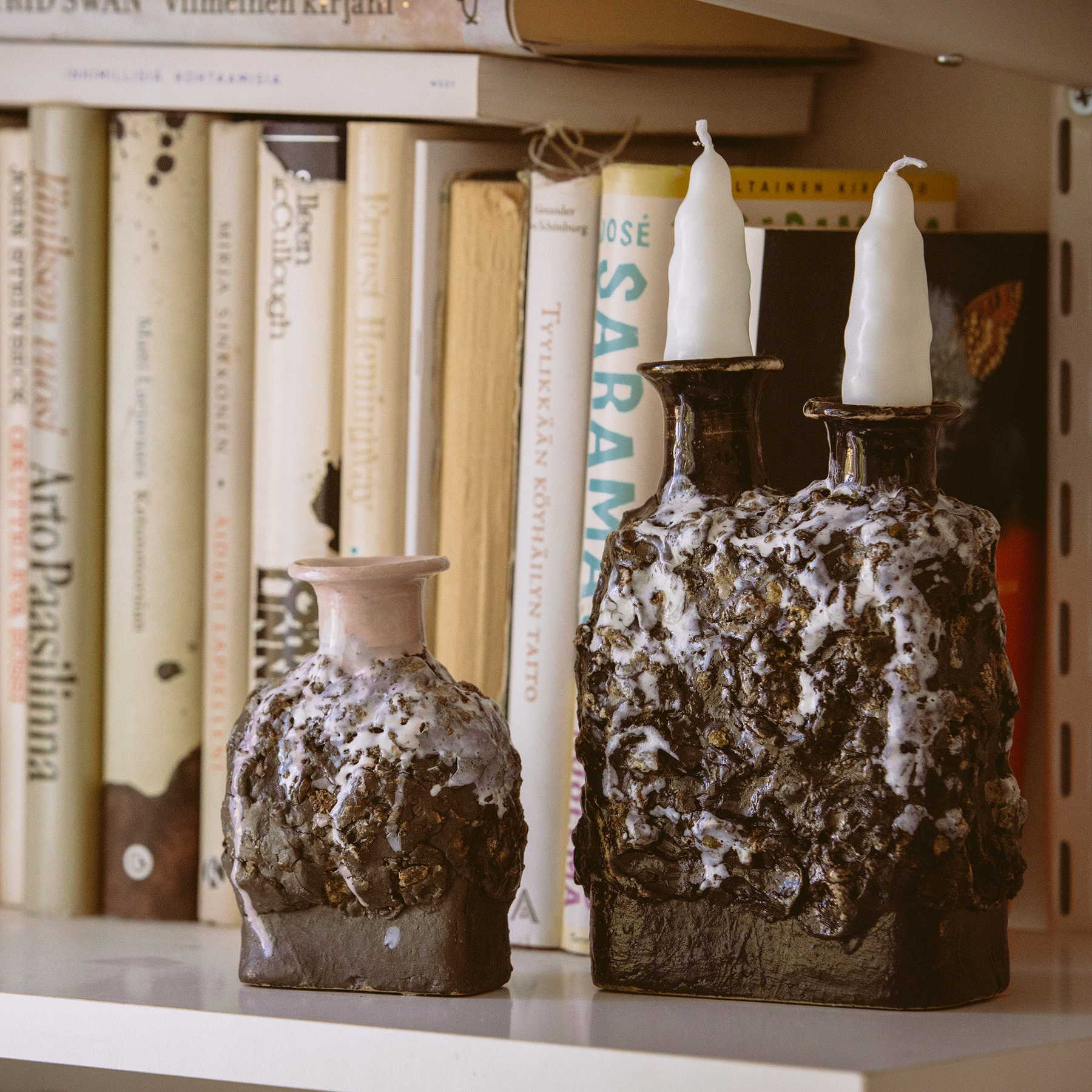 Syksyinen ruska tuntureiden koivikoissa ja varvuissa. Rakkakivien pintaa kirjovat jäkälät. Jääkautisten siirtolohkareiden rujot reunat. Kun Anu Pentik perheineen muutti 1970-luvun alussa eteläiseen Lappiin Posiolle, teki luonto häneen lähtemättömän vaikutuksen. Hän halusi tallentaa sen kaiken käsinkosketeltavaan muotoon; luoda jotain yhtä raakaa ja pitelemätöntä kuin luonto, jonka keskellä hän eli. Syntyi Kaamoskivi. Nyt olemme tuoneet myyntiin uuden erän legendaarisia Kaamoskivi-kynttilänjalkoja. Valmistettu käsityönä Posiolla, maailman pohjoisimmalla keramiikkatehtaalla. Samoissa maisemissa, josta tuote sai alkunsa. Jokaiseen Kaamoskiveen tulee mukaan myös Posion hiekkaa, jota Anu on kerännyt Kitkajärven rannalta.