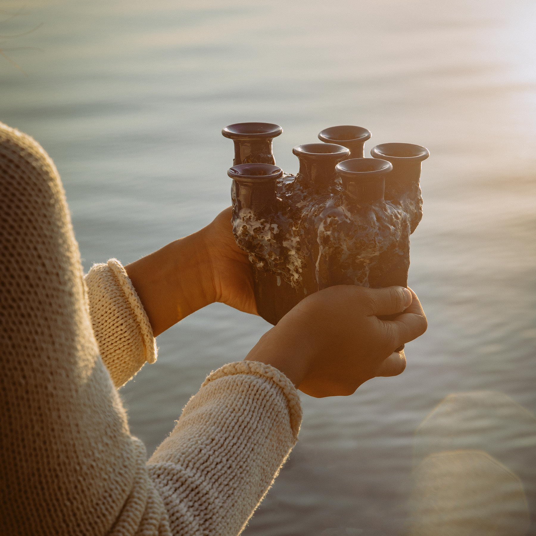 Syksyinen ruska tuntureiden koivikoissa ja varvuissa. Rakkakivien pintaa kirjovat jäkälät. Jääkautisten siirtolohkareiden rujot reunat. Kun Anu Pentik perheineen muutti 1970-luvun alussa eteläiseen Lappiin Posiolle, teki luonto häneen lähtemättömän vaikutuksen. Hän halusi tallentaa sen kaiken käsinkosketeltavaan muotoon; luoda jotain yhtä raakaa ja pitelemätöntä kuin luonto, jonka keskellä hän eli. Syntyi Kaamoskivi. Nyt olemme tuoneet myyntiin uuden erän legendaarisia Kaamoskivi-kynttilänjalkoja. Valmistettu käsityönä Posiolla, maailman pohjoisimmalla keramiikkatehtaalla. Samoissa maisemissa, josta tuote sai alkunsa. Jokaiseen Kaamoskiveen tulee mukaan myös Posion hiekkaa, jota Anu on kerännyt Kitkajärven rannalta.