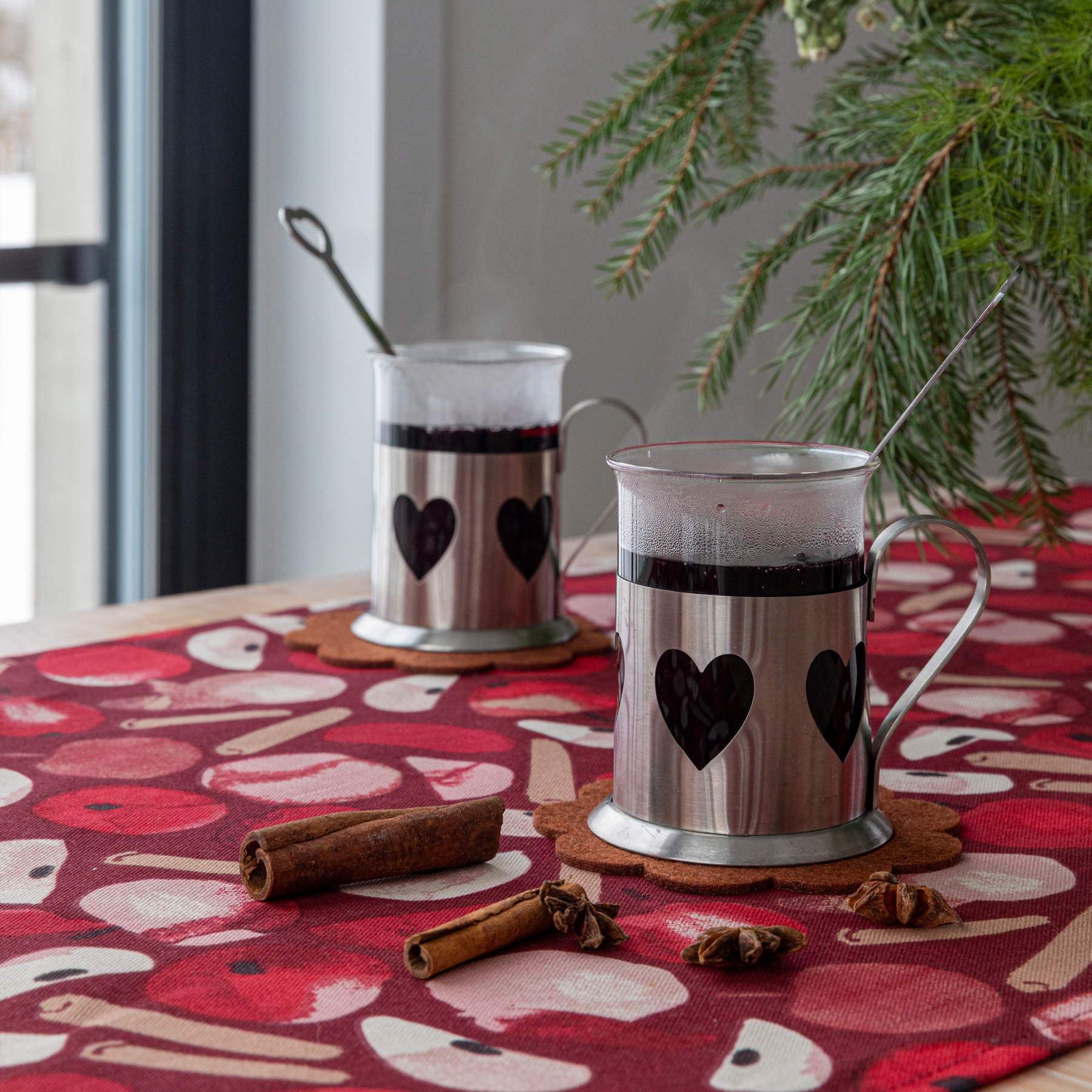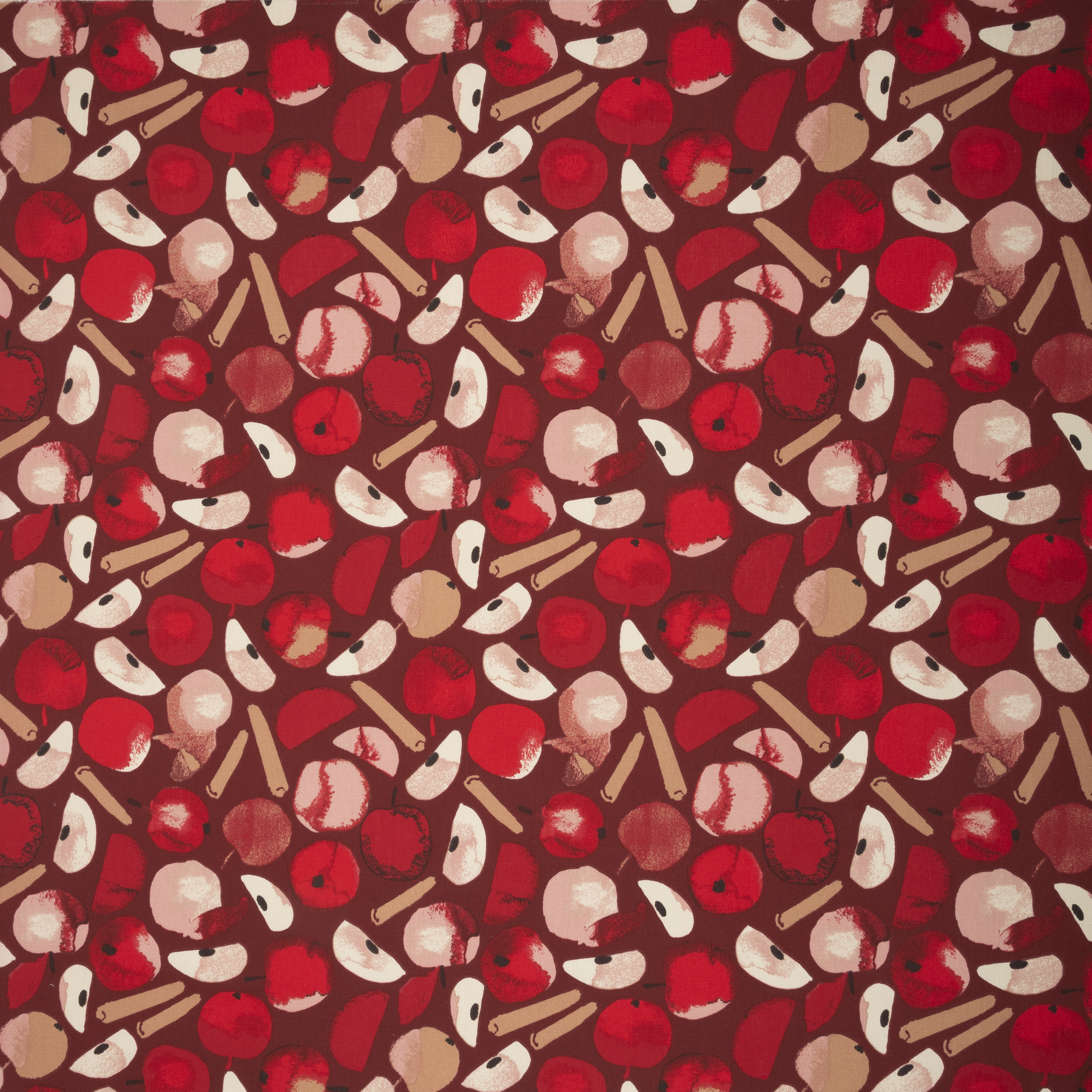 Lasse Kovasen Kaneliomena-kokoelma on täynnä lämpöä ja iloa mehukkaine omenineen ja aromikkaine kanelitankoineen. Kirkkaanpunaiset omenaviipaleet ja ruskeat kanelitangot koristavat Kaneliomena-kangasta, jolla voi luoda kotiin iloista jouluilmettä. Kangas on 100% puuvillaa ja sen leveys on 150 cm. Kangas voi kutistua ensimmäisessä pesussa maksimissaan 4 %. Konepesu varovaisella ohjelmalla 60 asteessa. Kankaan raporttikoko on 64 cm.