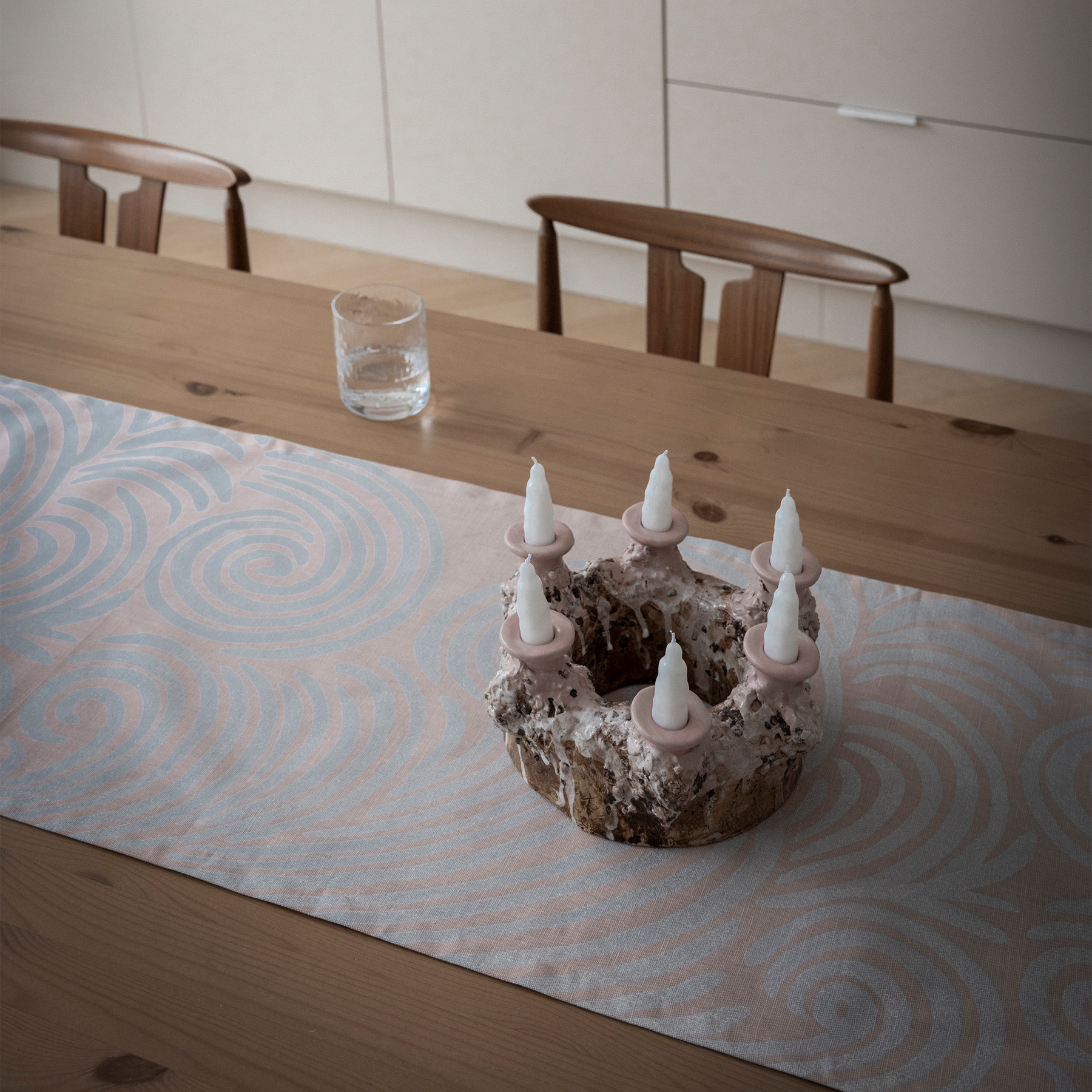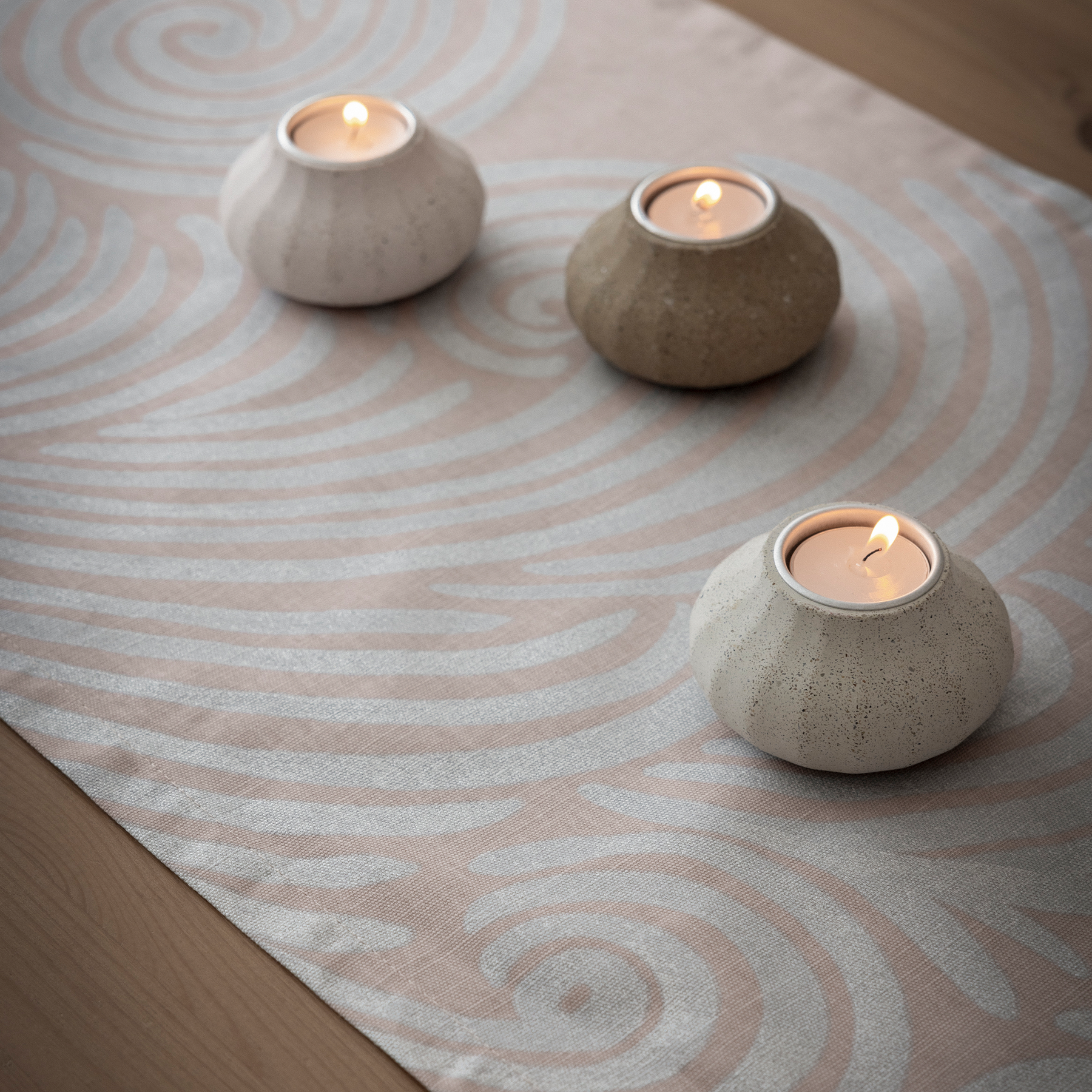 Takan tai nuotion sytyttämiseen on meillä jokaisella omat konstimme. Haloista vuoltavat kiehiset kuuluvat keinoista käytetyimpiin. Minna Niskakangas ikuisti kansallispuiston nuotiopaikalta löytyneet, edellisten retkeilijöiden jäljiltä jääneet kiehiset vesiväreillä maalaten. Kiehisten kauniit muodot loivat koristeellisen kuosin, joka on painettu osittain hopeisella helmiäispainovärillä pehmeän roosansävyiselle pohjavärille. Kiehisten tuomaa lämpöä on saatavilla kattaustekstiilien, kankaiden ja sisustustyynynpäällisten muodossa.