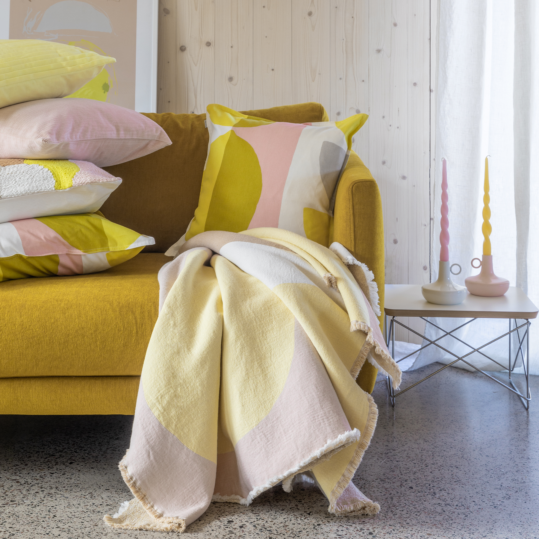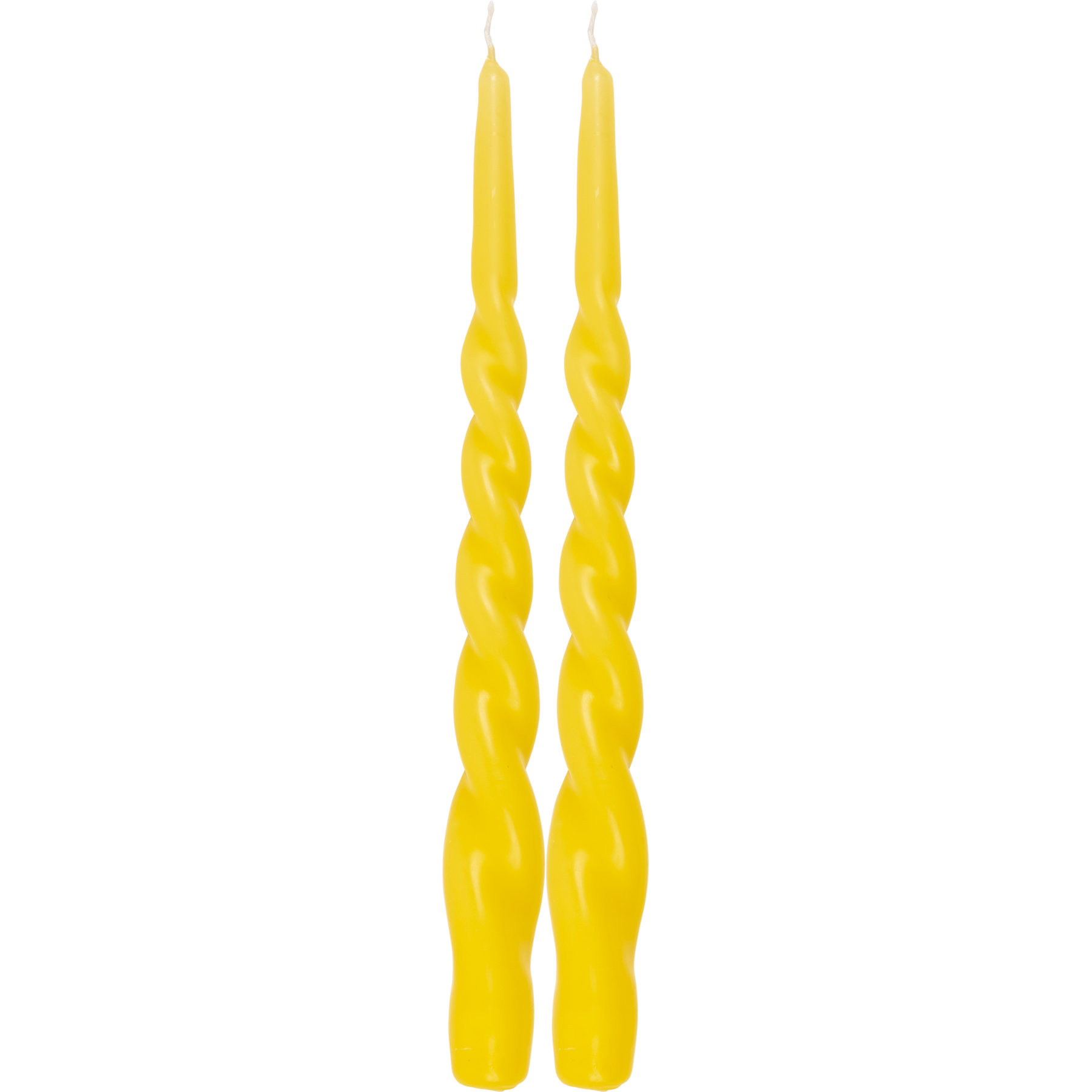Kirkkaan keltainen Kierre-kruunukynttilä on näyttävä yksityiskohta kattauksissa ja sisustuksessa.