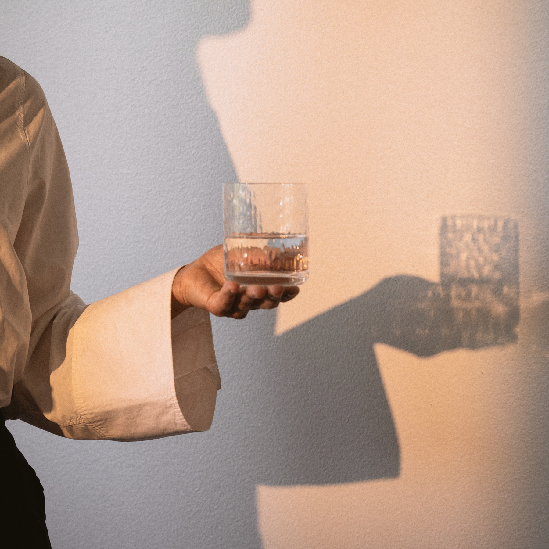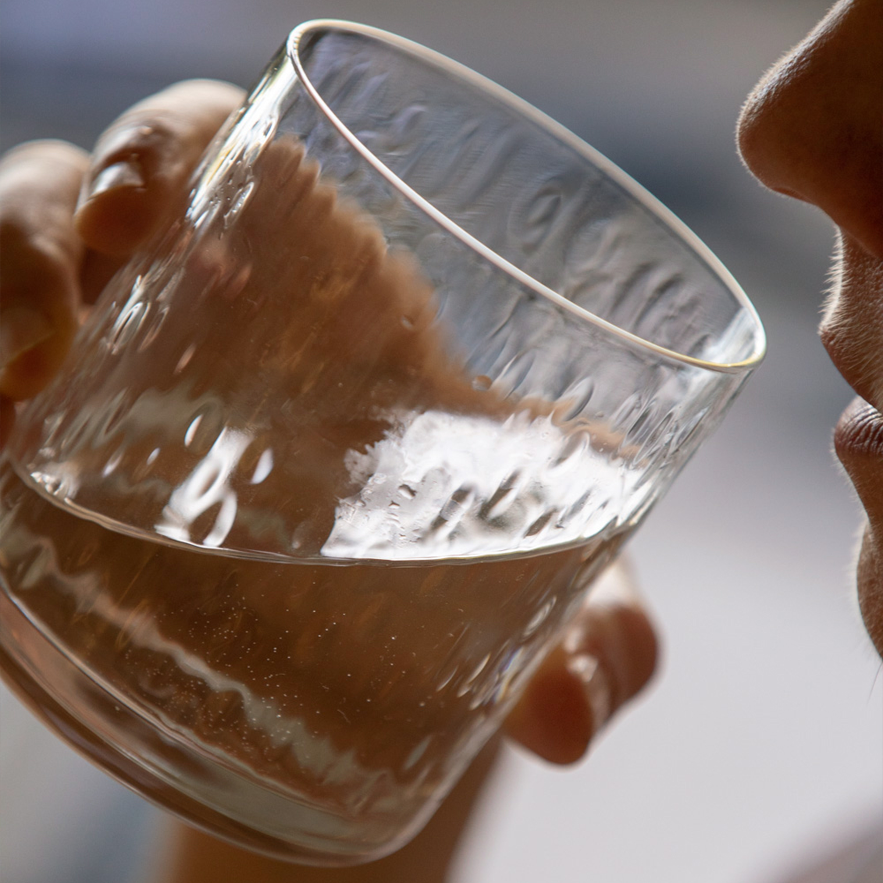 Kesytön, mutta lempeä. Sellainen on kosken luonto. Villinä virtaavaa vettä lumoutuu katselemaan pitkäksi aikaa. Myös Minna Niskakankaan suunnittelemassa Koski-juomalasissa valon ja veden välke vangitsee katseen. Lasin yksinkertainen, käteen sopiva muoto elävöityy pinnan kuviolla, jonka Minna loi alunperin vaneriin kaivertamalla.