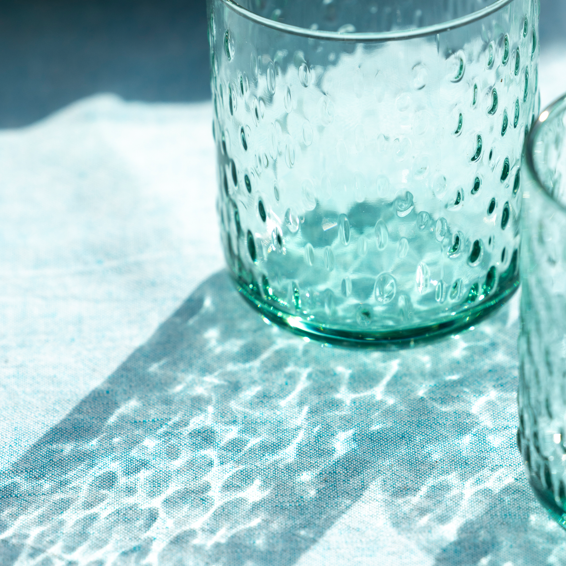 Koski-juomalasi on suupuhallettua lasia. Turkoosin Koski-juomalasin vetoisuus on 27 cl. Myydään kahden lasin setteinä. Lasin voi pestä astianpesukoneessa.