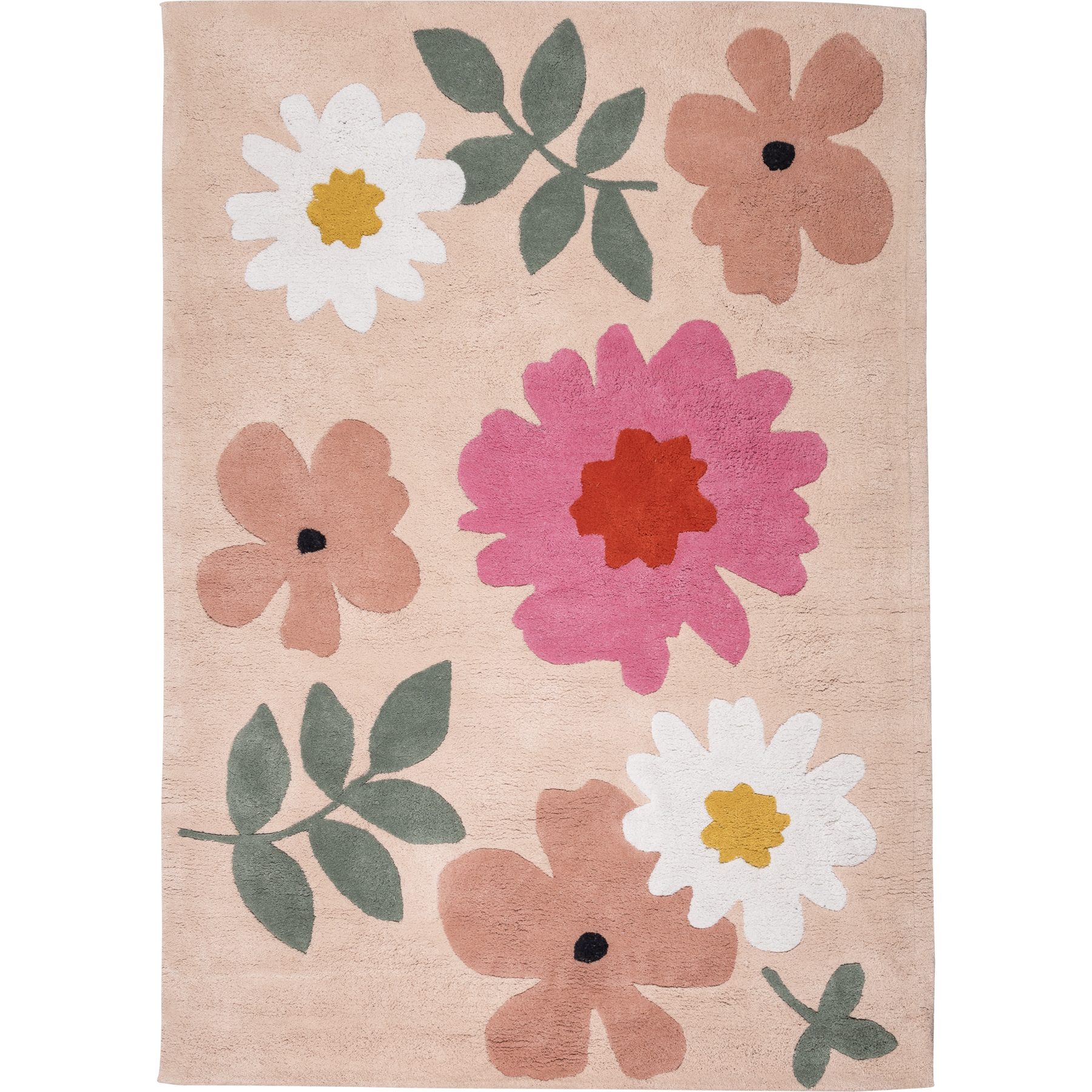Vaaleanpunainen Kukka-matto on kooltaan 90x130 cm ja sen materiaali on 90 % puuvillaa ja 10 % keinokuitusekoitetta.