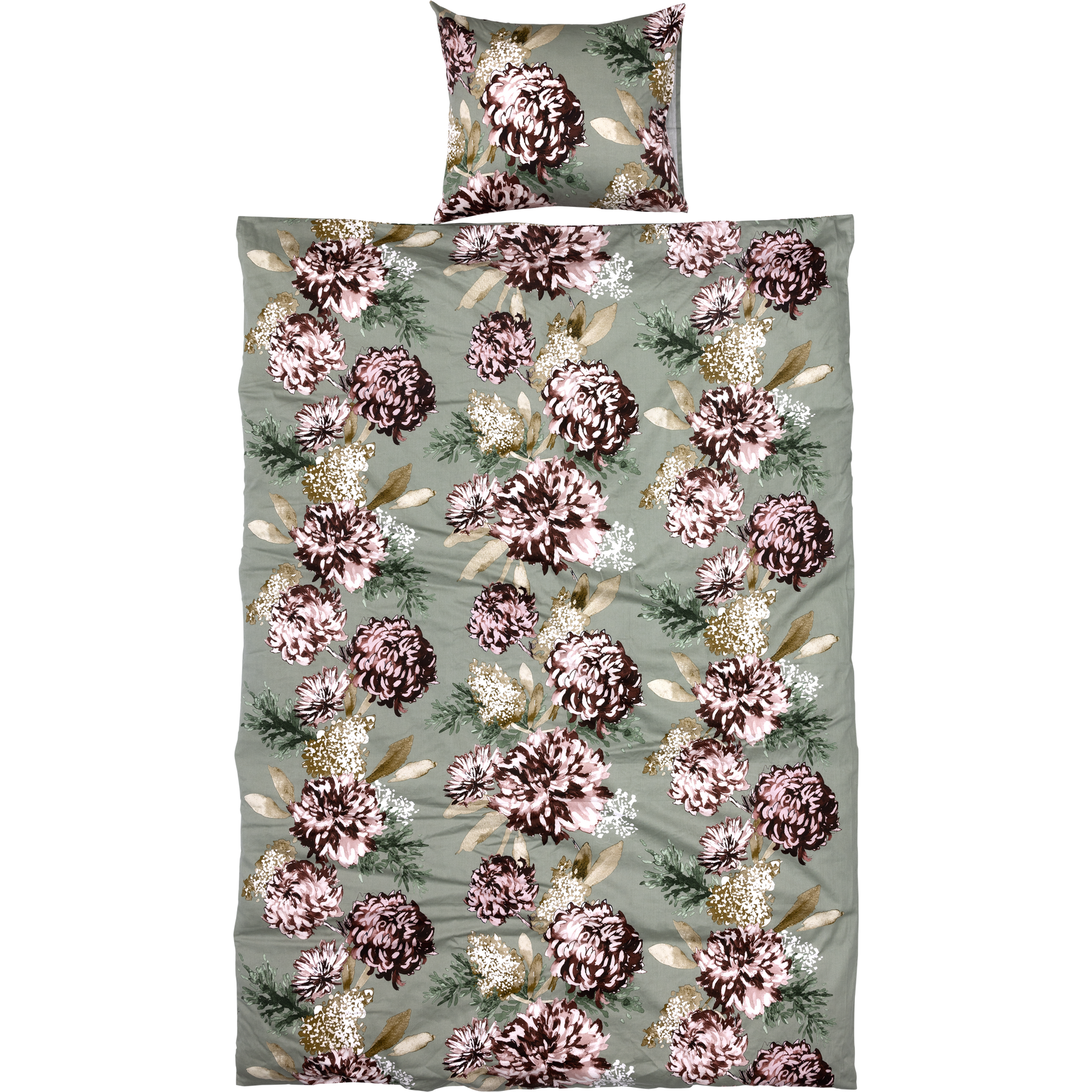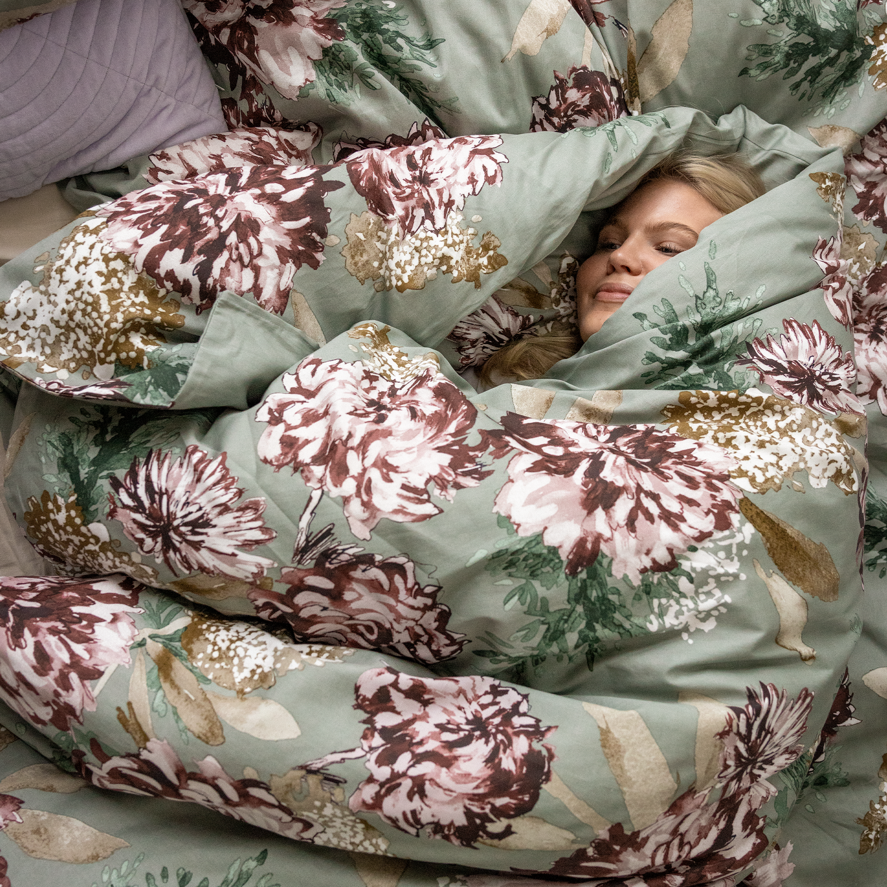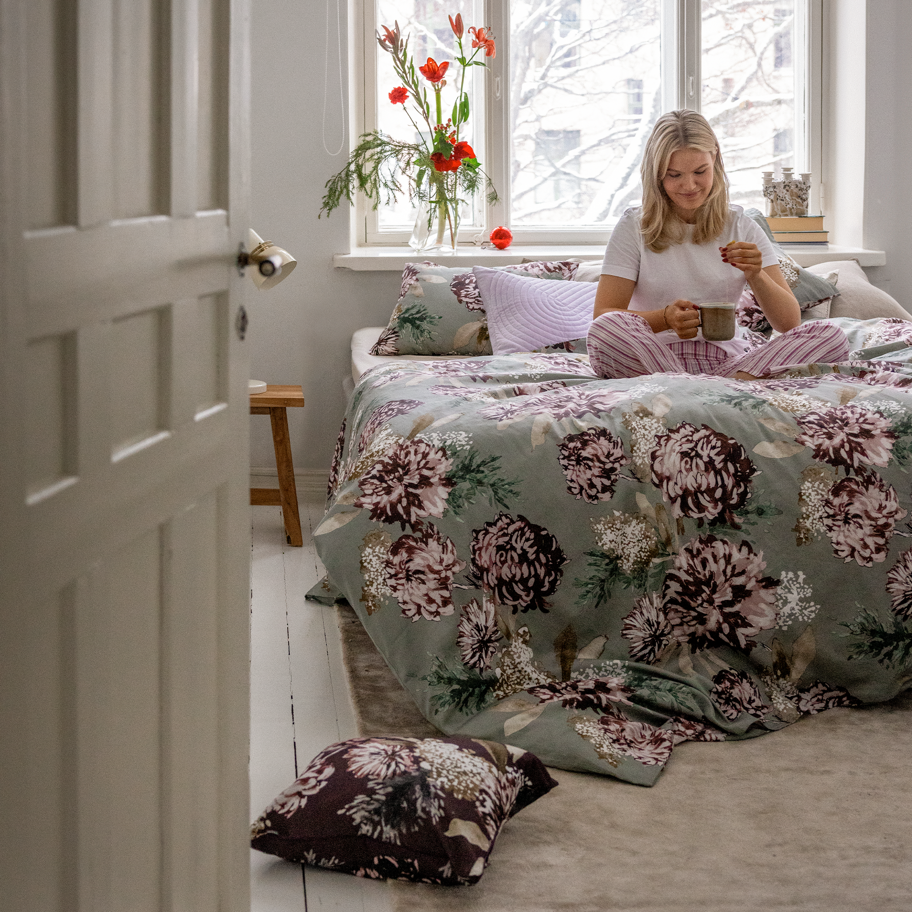 Kruunuja ei jaeta meillä Suomessa syntymässä, mutta kodissasi saat päättää, kuka on kuningatar. Minna Niskakankaan maalaama Kuningatar-kuosi tuo arkeen juhlan tuntua: siinä hehkuvat krysanteemit, sypressin oksat ja skimmiat – kuin suoraan kukkivasta talvipuutarhasta. Tämä pehmeä ja ylellinen puuvillasatiinisetti tuo makuuhuoneeseesi hiljaista arvokkuutta ja suomalaisen kodin kauneutta.