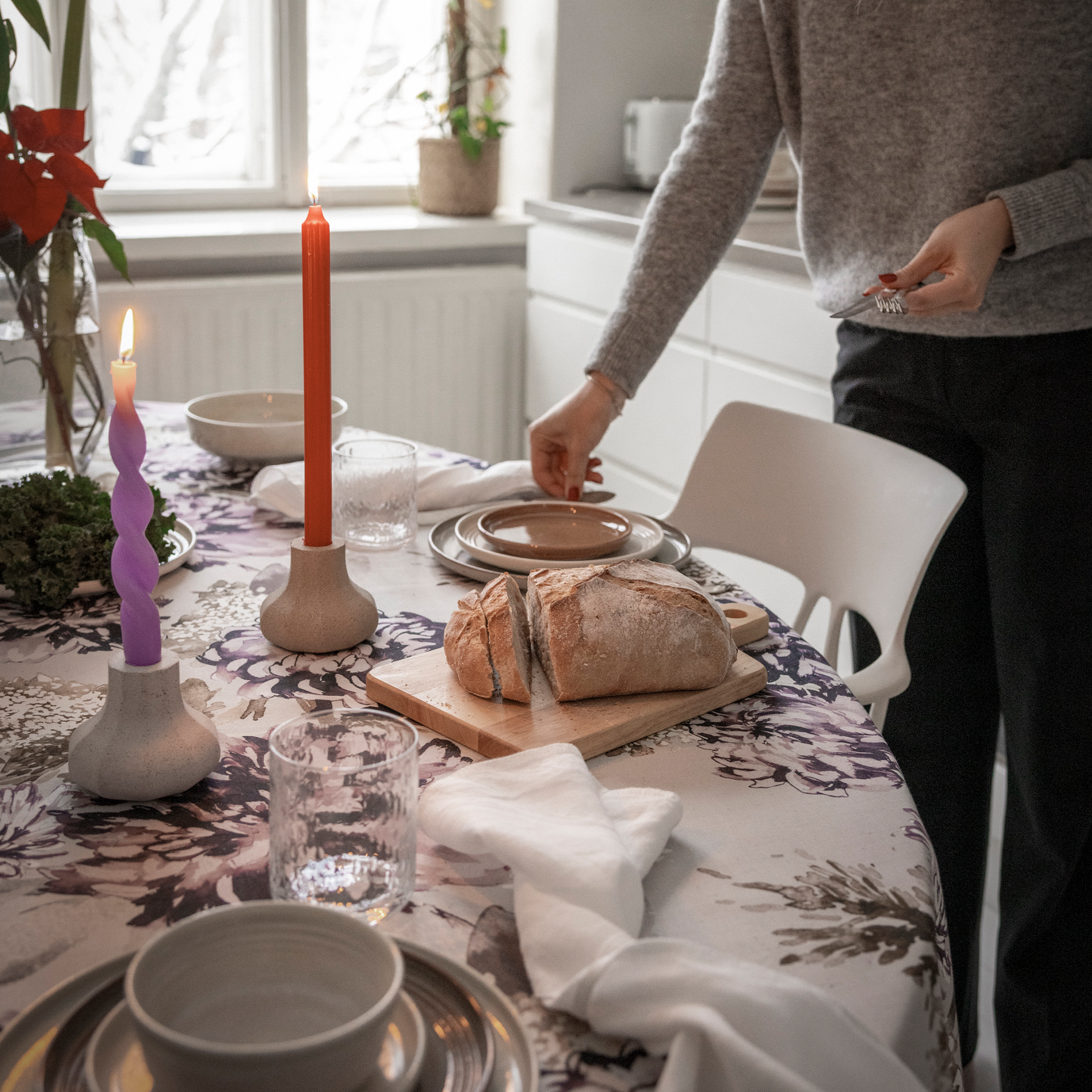 Toisin kuin muilla pohjoismaalaisilla, harvalla meistä suomalaisista on kuninkaallisia sukujuuria. Silti luonteessamme ja joulunviettotavoissamme on hiljaista arvokkuutta. Perhe on meille tärkein, oli se pieni tai suuri. Heitä varten katamme pöydän ja koristamme kodin niin kauniisti kuin osaamme. Minna Niskakangas maalasi Kuningatar-kuosiin muhkeita krysanteemeja, sypressin oksia ja jouluasetelmista tuttuja skimmioita. Malliston tuotteet ovat saatavilla rauhoittavan vaaleanharmaalla sekä juhlavan viininpunaisella pohjavärillä. Molemmissa on mukana ripaus hopean- ja kullanhohtoa.