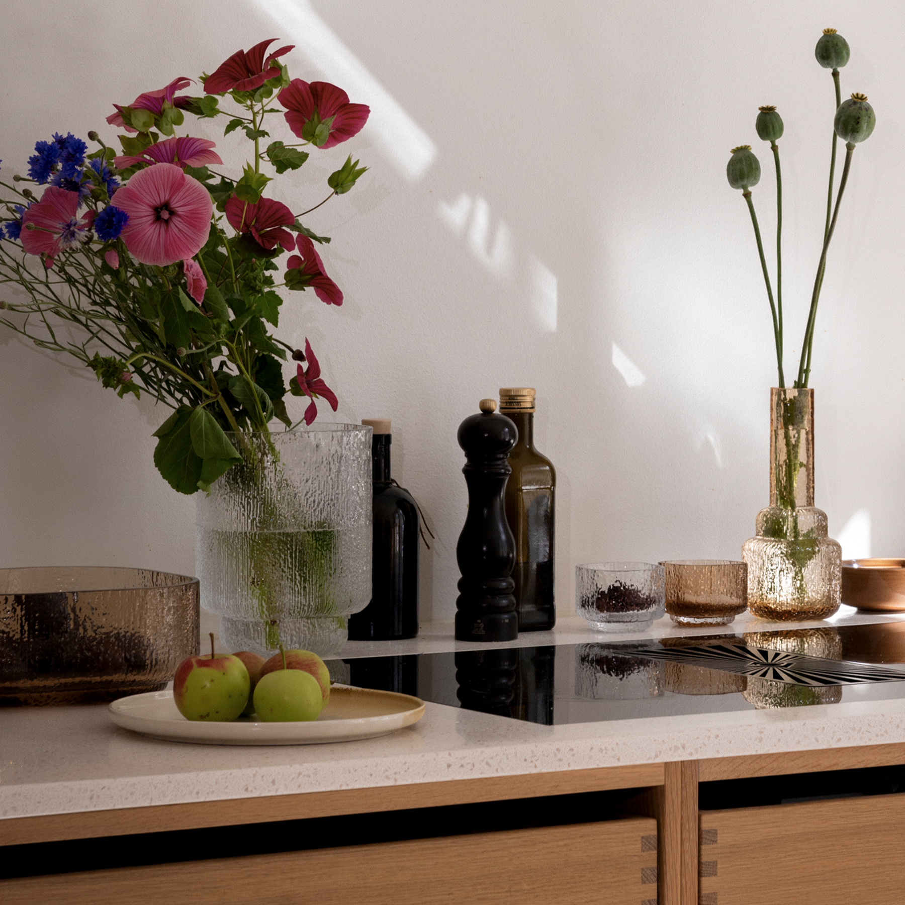 Kuulea-lasimaljakko on kaunis katsoa sellaisenaankin, mutta edukseen suosikkikukkiesi kanssa. Kavennettu pohja antaa tukea hiukan korkeammillekin kukille, ja sopivan leveä yläosa mahdollistaa näyttävätkin asetelmat. Kuulea-sarjan tuotteita yhdistää pinnan kuviointi, joka on saanut inspiraationsa sateen ropinasta ikkunaan. Suunnittelija Tuuli Saarelainen.