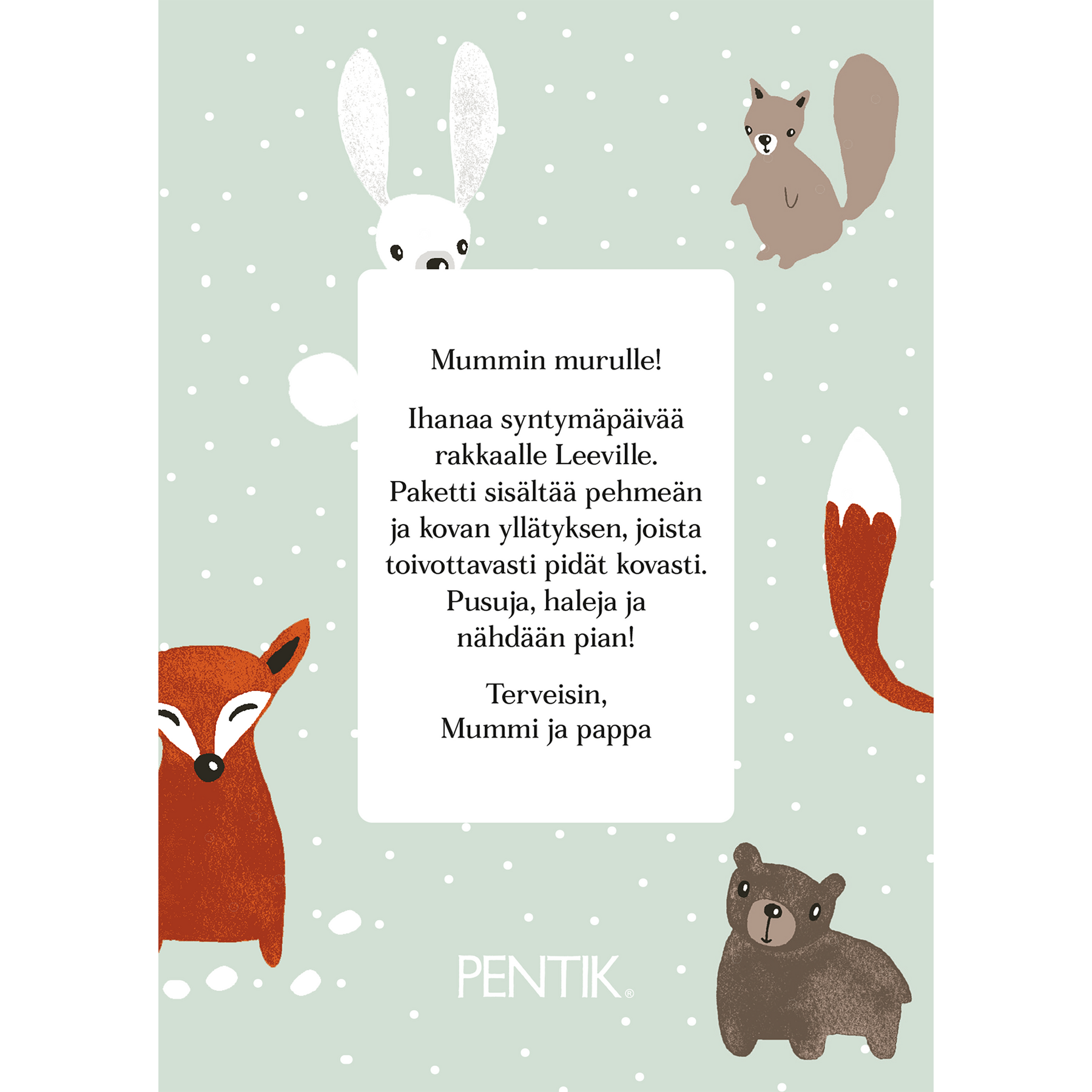 Lähetä kauniisti paketoitu lahja suoraan lahjansaajalle. Lahjapakettiin kiinnitettävällä hurmaavalla Metsänväki-kuvioidulla kortilla pääset kertomaan keneltä lahja on. Syötä viestisi ja kortin allekirjoitus yllä näkyviin kenttiin.