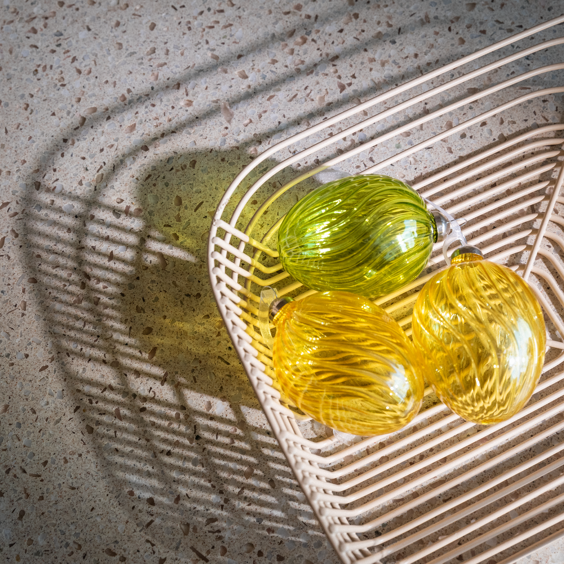 Kirkkaan keltaista Laine-lasimunaa koristavat laineilevat kuviot. Tyylikäs lasikoriste on ilahduttava yksityiskohta pajunoksalla roikkuessaan ja sopii myös osaksi pääsiäisen kattauksia. Laine-lasimunan koko on 9 cm ja siinä on ripustunauha.