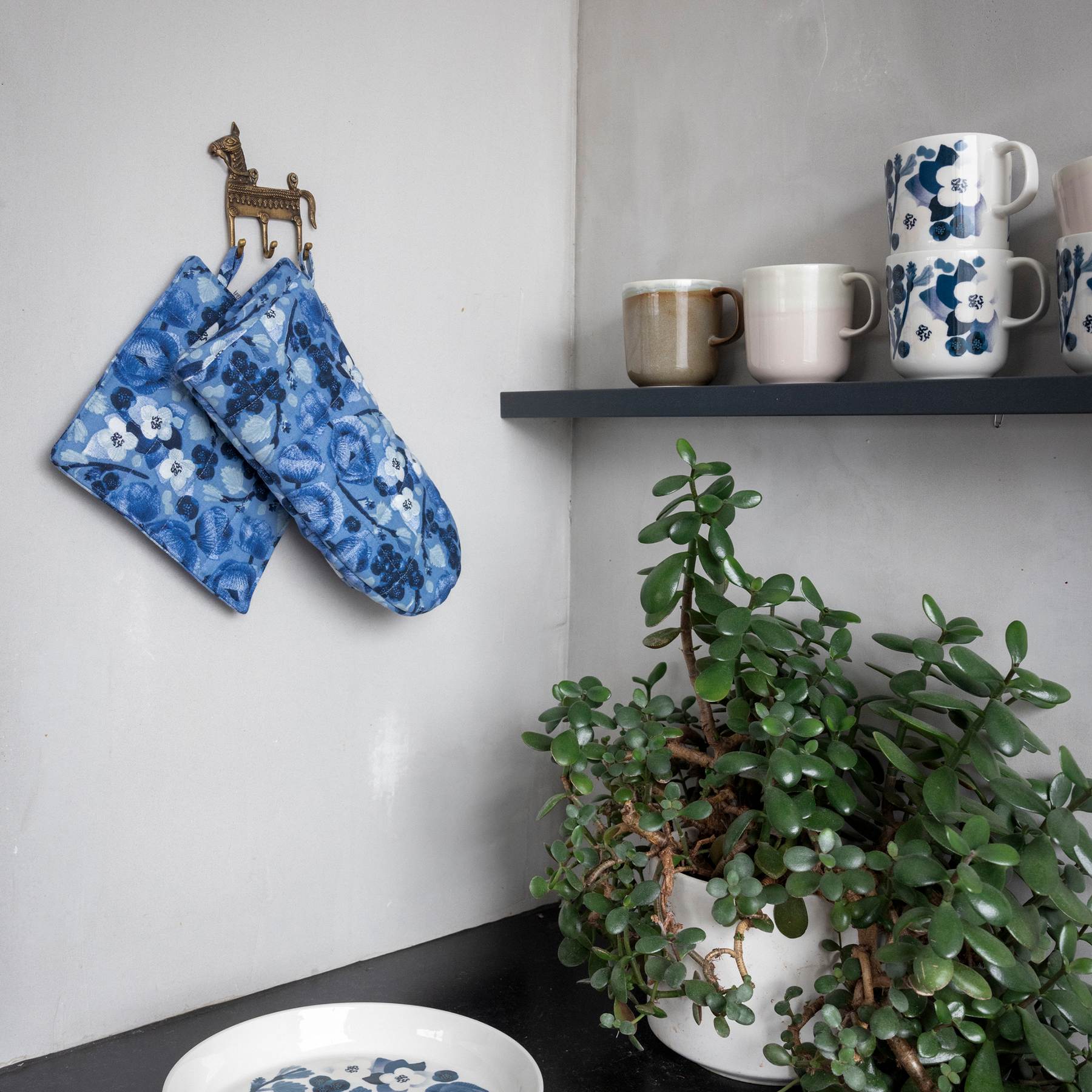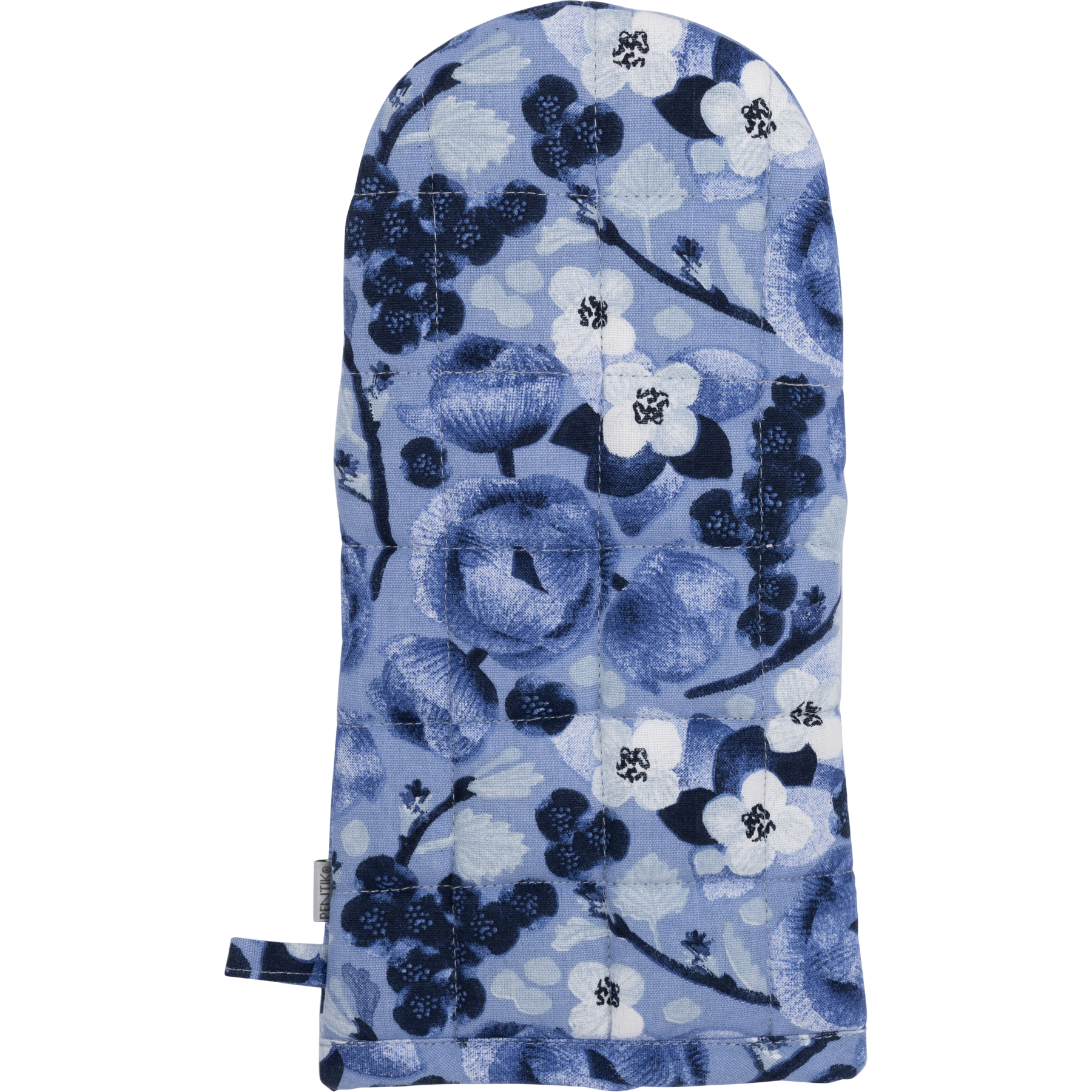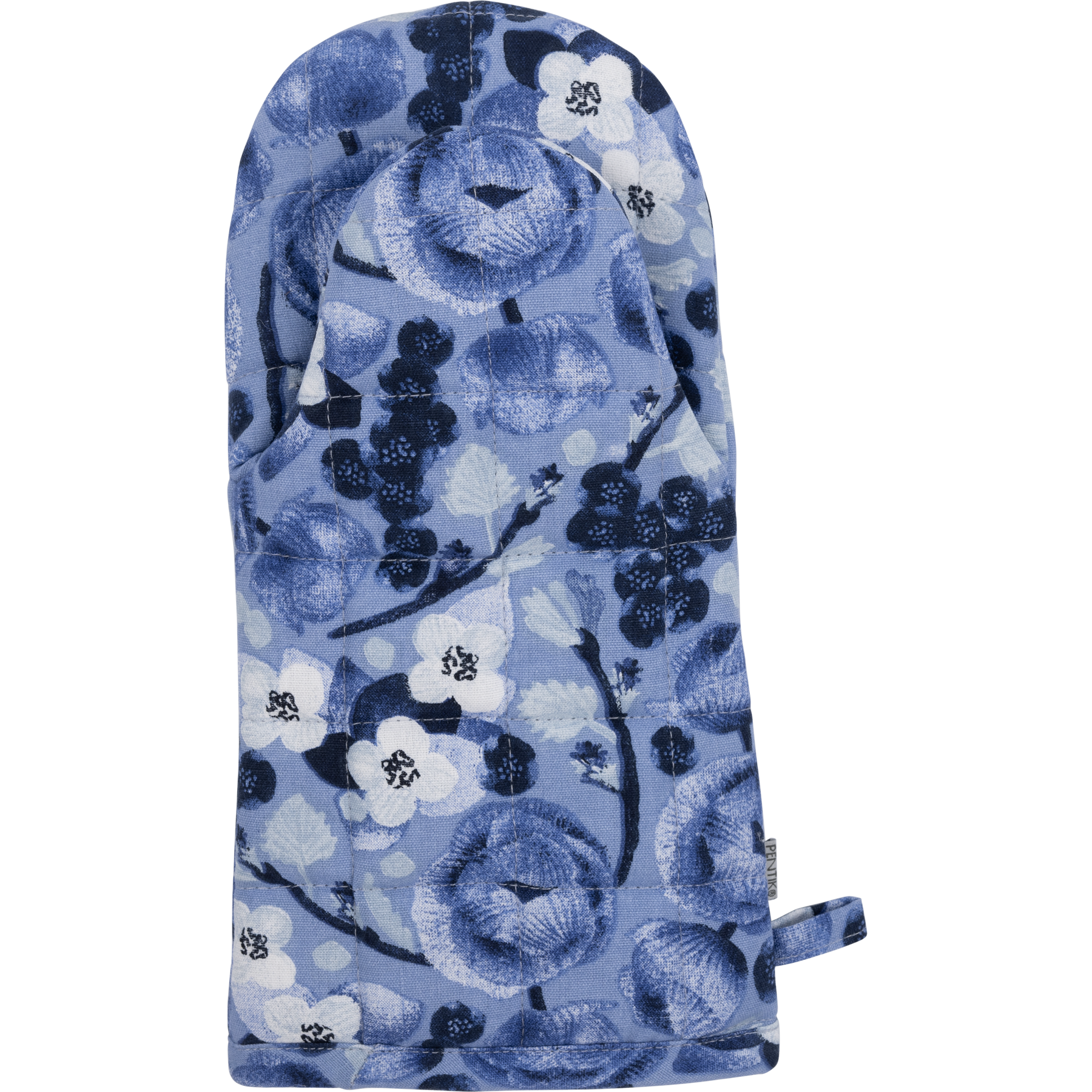 Sinivalkoisen Lapinkukka-patakintaan koko on 16x31 cm. Patakintaan voi pestä koneessa 60 asteessa. Varo uunin vastuksia ja avotulta. Tuote on tarkoitettu kuumien astioiden käsittelyyn.