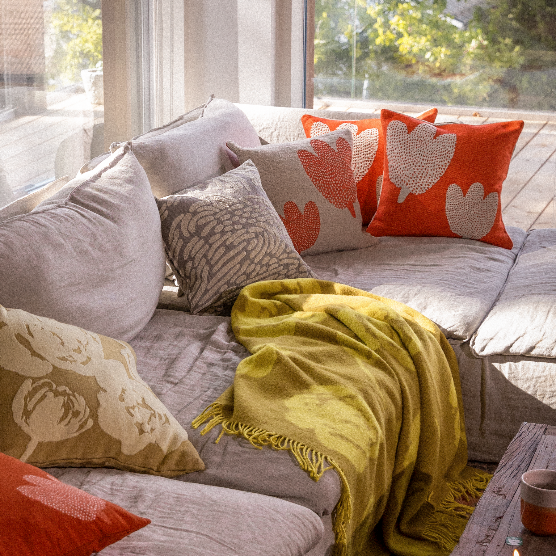 Suunnittelija Laura Isoniemi loi Lapinvuokko-kuosin keskitalven pimeydessä. Silloin mieli vei hänet takaisin kesäisiin päiviin suvun vanhan hirsitalon pihamaalla. Muistiin piirtyivät talon seinustalla kukkivat pienet ja sitkeät lapinvuokot, jotka hän piirsi tuomaan iloa ja toiveikkuutta kaamoksen keskelle. Poimi omat Lapinvuokkosi syysmallistostamme. Näitä kukkia ei tarvitse laittaa maljakkoon. Jacquard-koristeinen Lapinvuokko-tyynynpäällinen on valmistettu Suomessa. Sen pohjaväri on toisella puolella vaaleanruskea ja toisella puolella punainen.