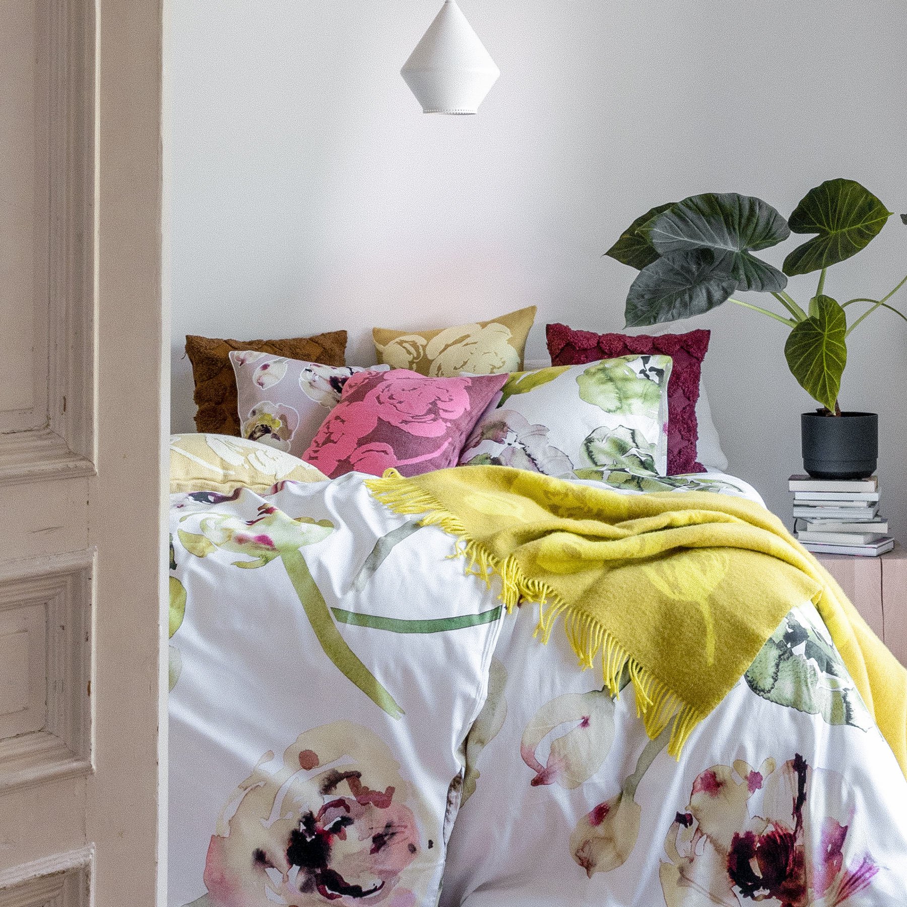 Lasse Kovanen maalasi Lilia-kuosiin näyttäviä ranskalaisia tulppaaneja, jotka tunnetaan eloisasta ja kesyttömästä kasvutavastaan. Valtavat kukat keikkuvat kurittomasti pitkien, valon mukana vääntyilevien varsien päässä, eikä edes maljakko saa pidettyä niitä aisoissa. Näillä kukilla on pilkettä silmäkulmissa. Aivan kuten meillä pohjoisen ihmisillä, vaikka meitä usein pidetään hiljaisina ja hillittyinä. Lilia-malliston tekstiilit tuovat iloisen riehakasta tunnelmaa kotiin nytkin, kun ilmassa alkaa olla syksyn tuoksua.