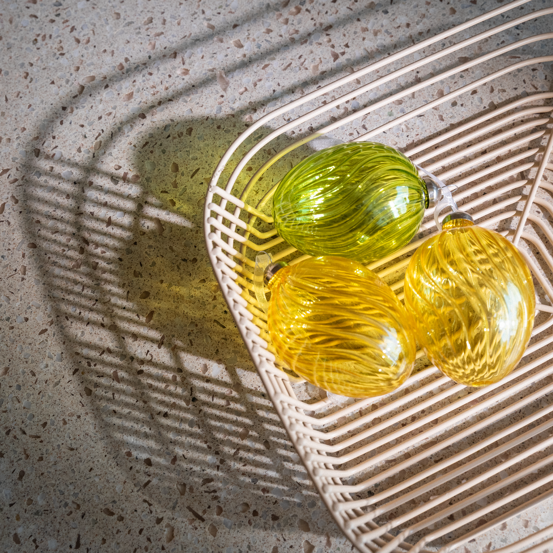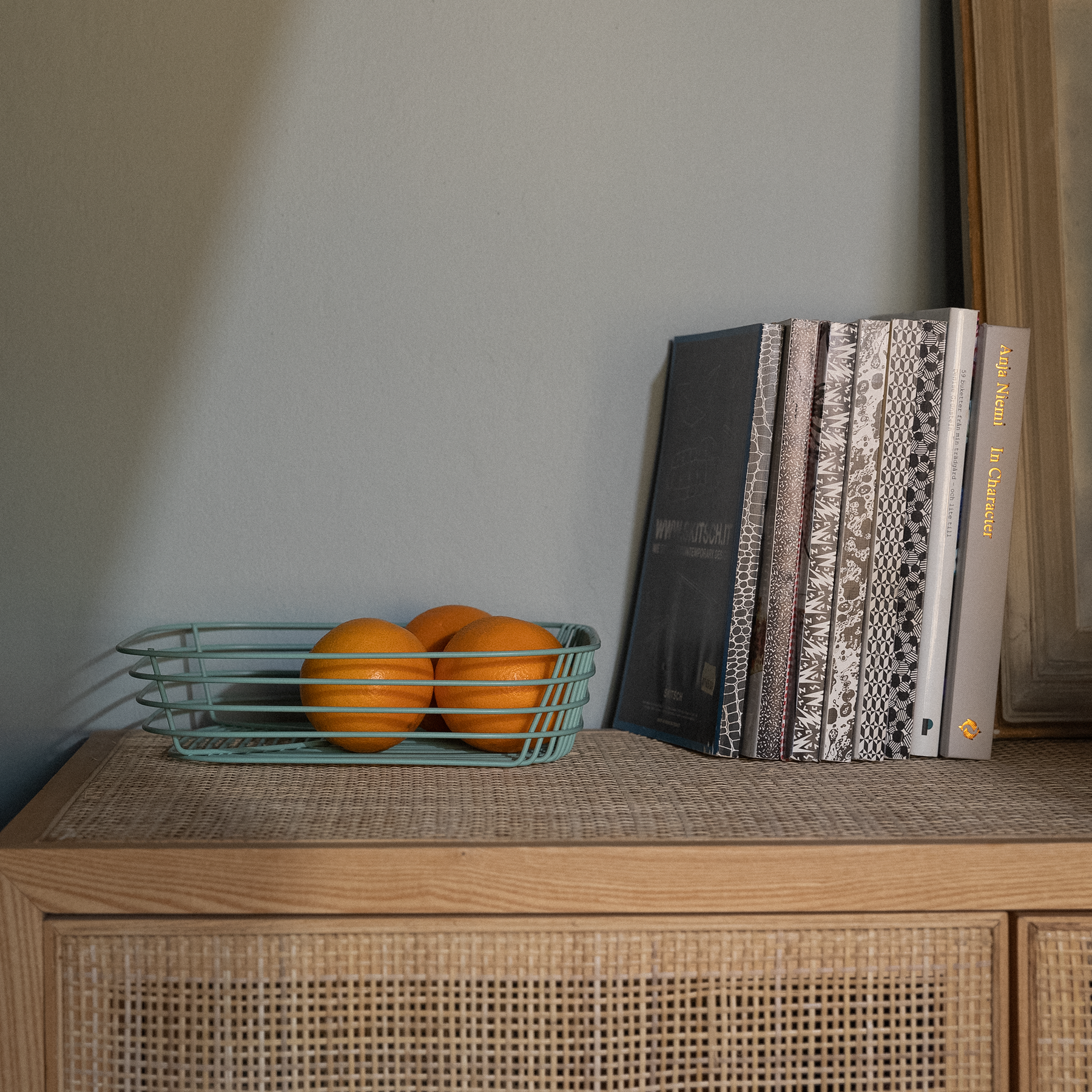 Tuuli Saarelaisen suunnittelema Linjakas-kori säilöö hedelmät tyylikkäästi. Liinan kanssa käytettynä se toimii myös ilmavana leipäkorina. Turkoosin korin muodoissa toistuvat kauniisti Kaarna-sarjan pehmeän luonnolliset kaaret.