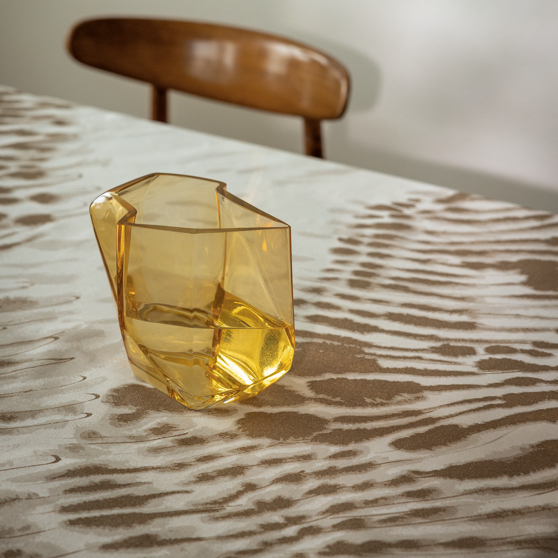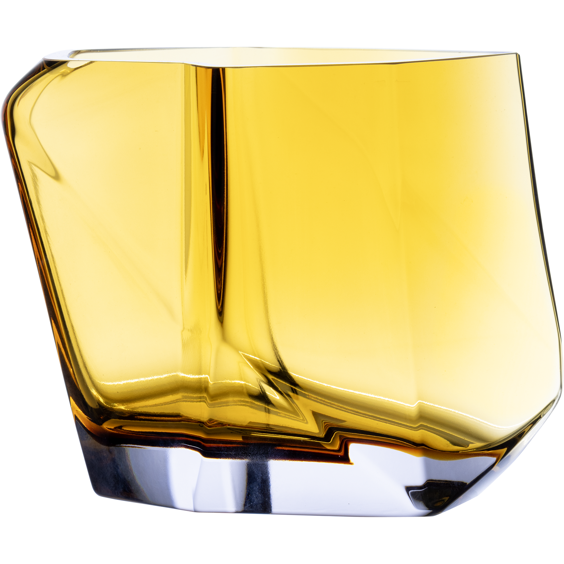 Keltainen Lohkare-maljakko on kooltaan 18x17 cm ja sille suositellaan käsinpesua.