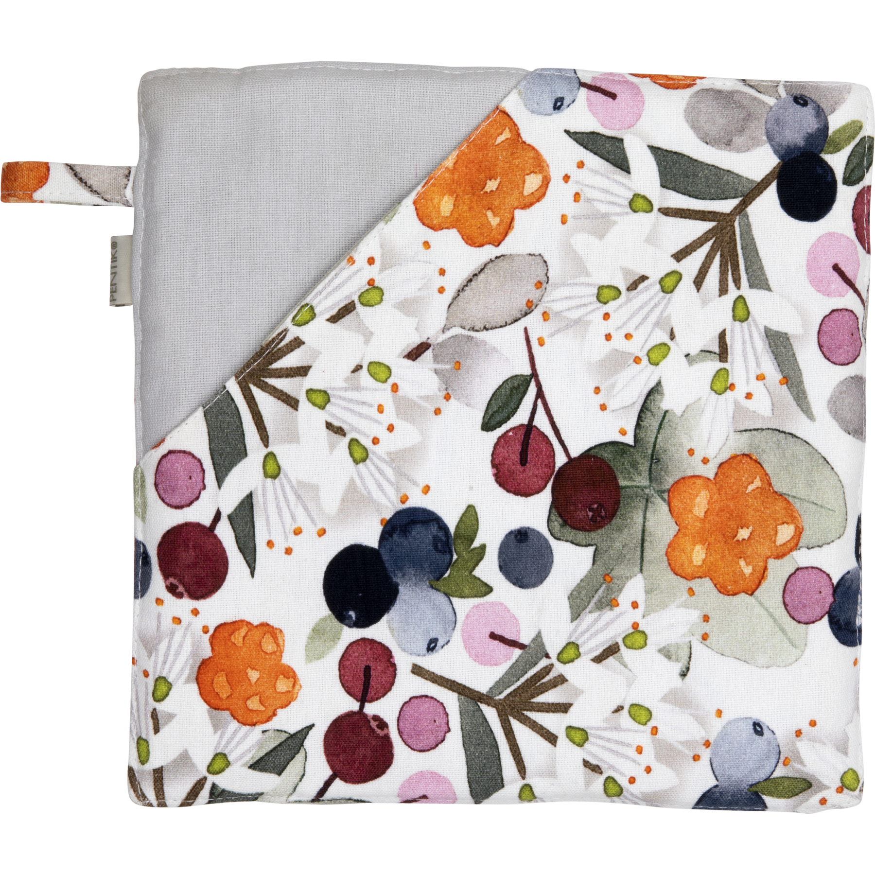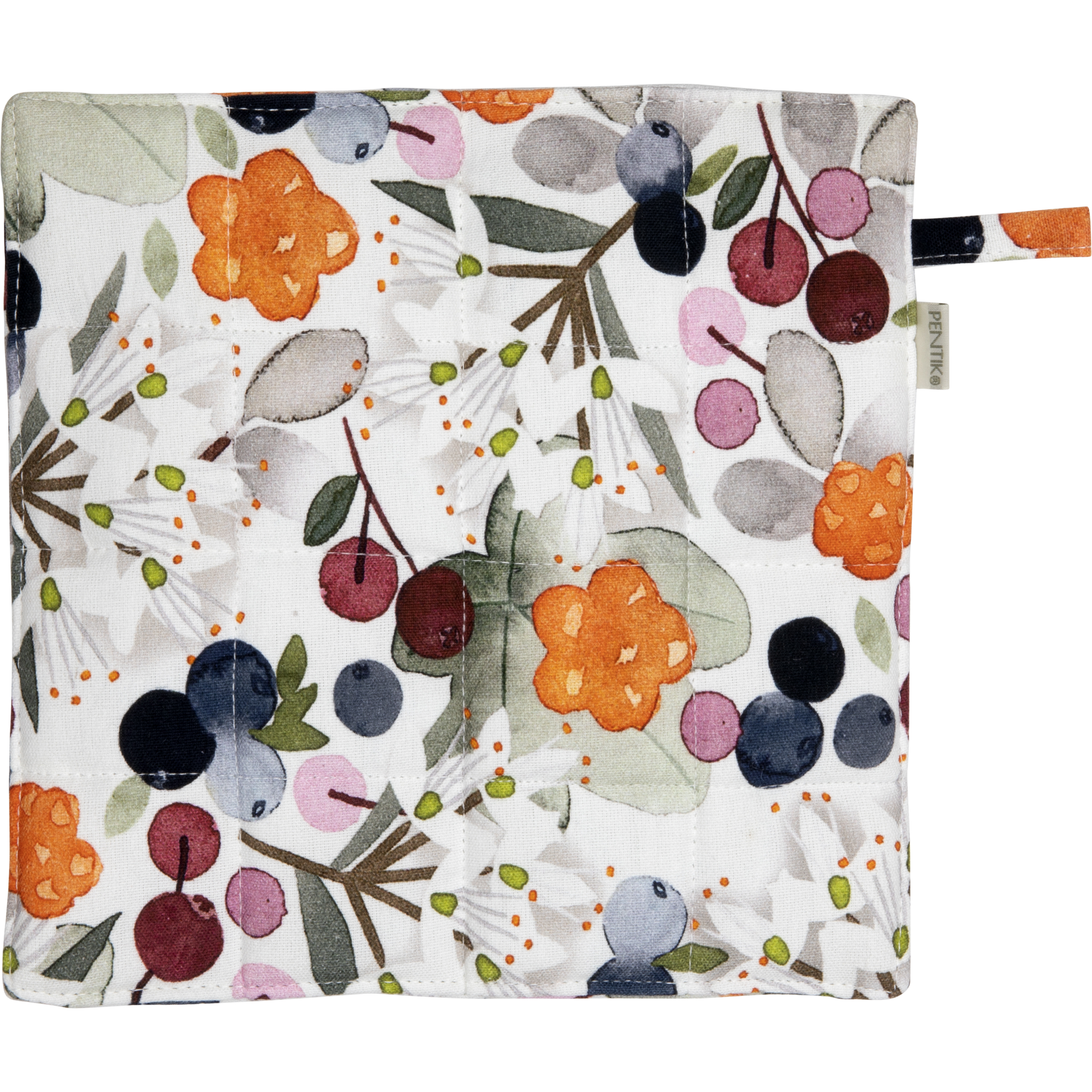 Metsämarja-patalapun koko on 21x21 cm ja materiaali 100 % puuvillaa (täyte on polyesteriä). Konepesu 60 asteessa.