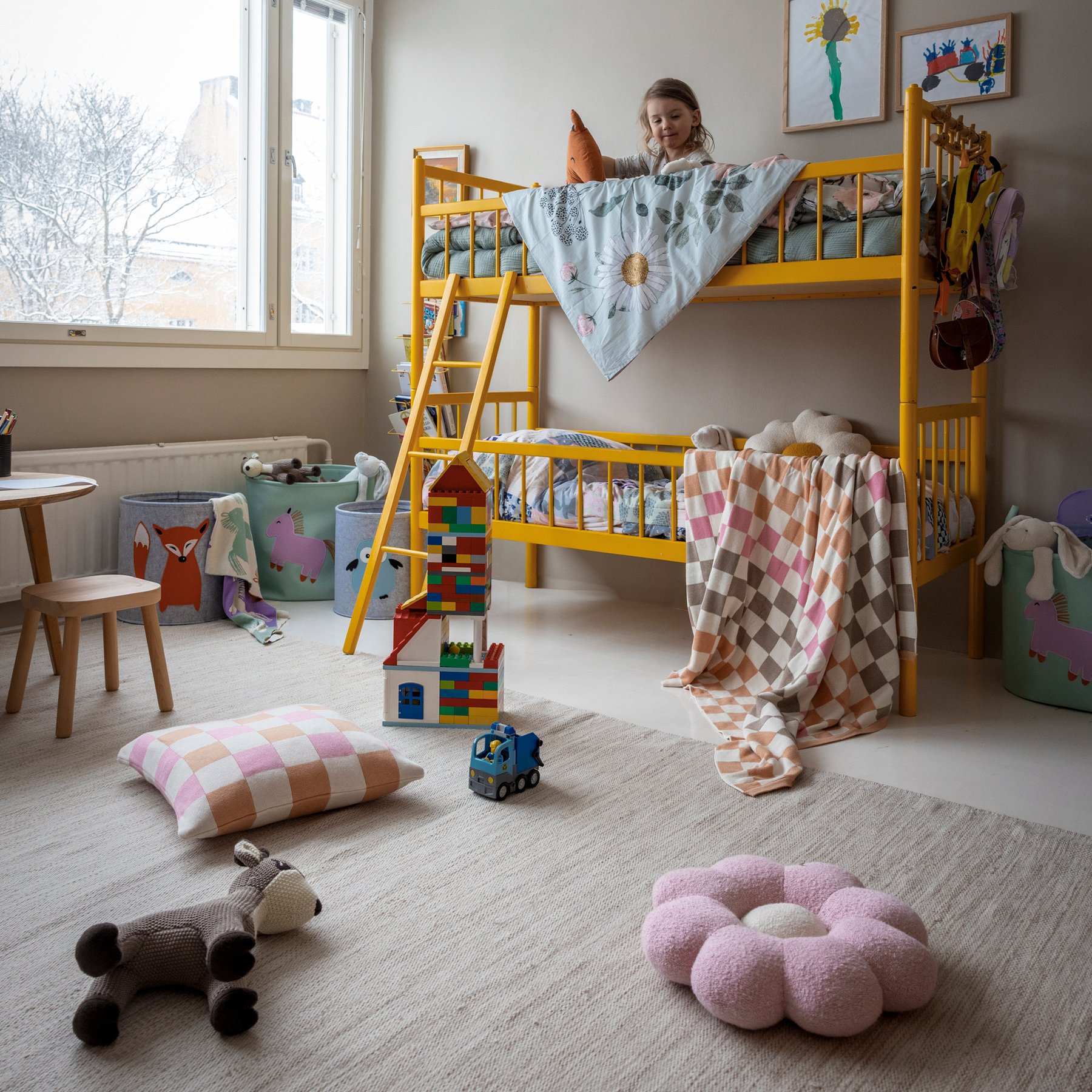 Lasten elämä on täynnä valtavia tunteita. Hurjan jännittäviä hetkiä, räiskyvän suuria iloja sekä maata mullistavia suruja. Useimmiten kaikki yhdessä päivässä. Toisinaan lelut leviävät pitkin huonetta, mutta sekin kuuluu lapsen elämään. Päivän päätteeksi ne voi kerätä säilytyskoriin, jota koristaa Minna Niskakankaan suunnittelema Leevi-pöllö tai Elmo-kettu. Sieltä rakkaat lelut löytyvät taas aamulla.