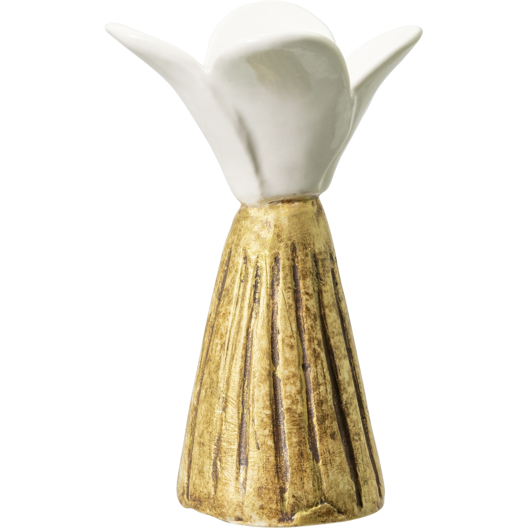 Valkoinen keraaminen kukkaveistos on 12 cm korkea ja sen jalka on viimeistelty kultaisella lasitevärillä. Suunniteltu ja valmistettu Suomessa.