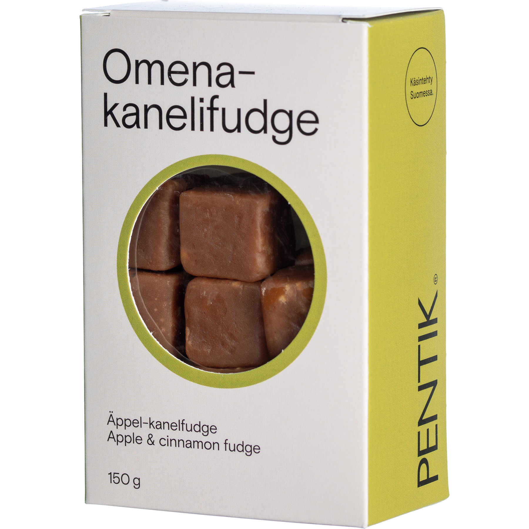 Pentikin omena-kanelifudge eli pehmeä toffee valmistetaan Pohjanmaalla, Granholmin herkkutehtaalla käsityönä. Työ on hidasta, sillä palat muotoillaan käsin ja annetaan kypsyä ennen pakkausta ja toimitusta. Fudget ovat gluteenittomia ja ne valmistetaan ilman säilöntä- ja väriaineita. Pentikin herkut tyynnyttävät oman makeannälän ja sopivat hyvin myös lahjaksi. Valmistettu Suomessa.