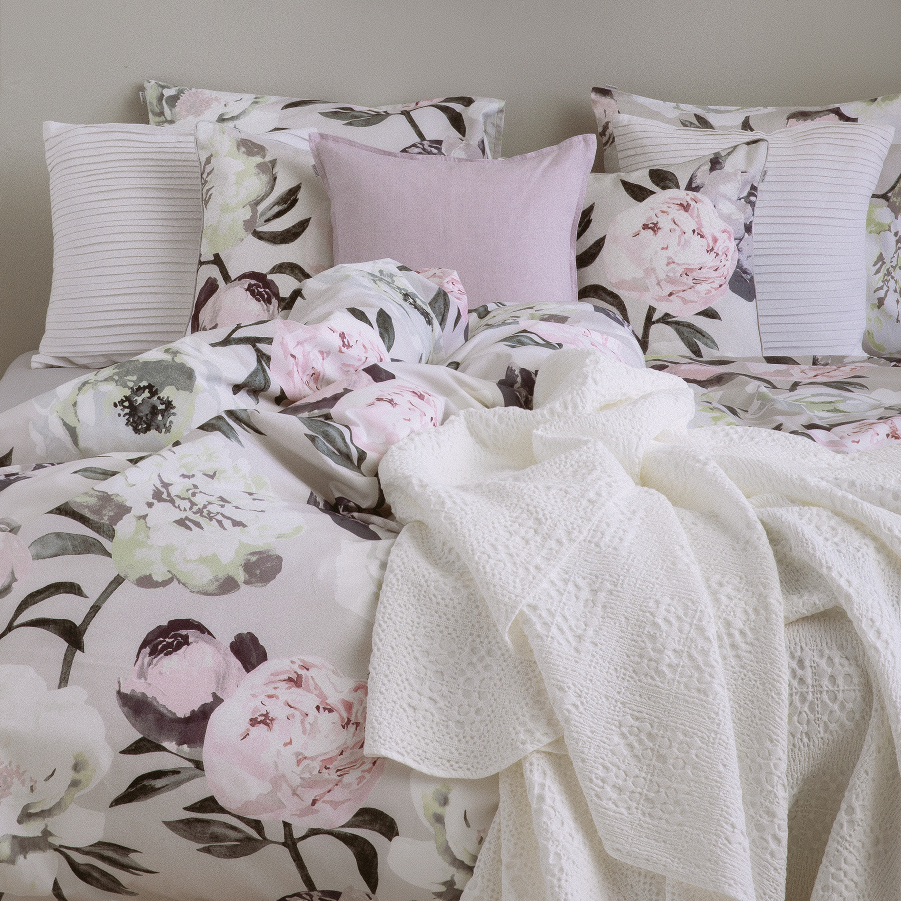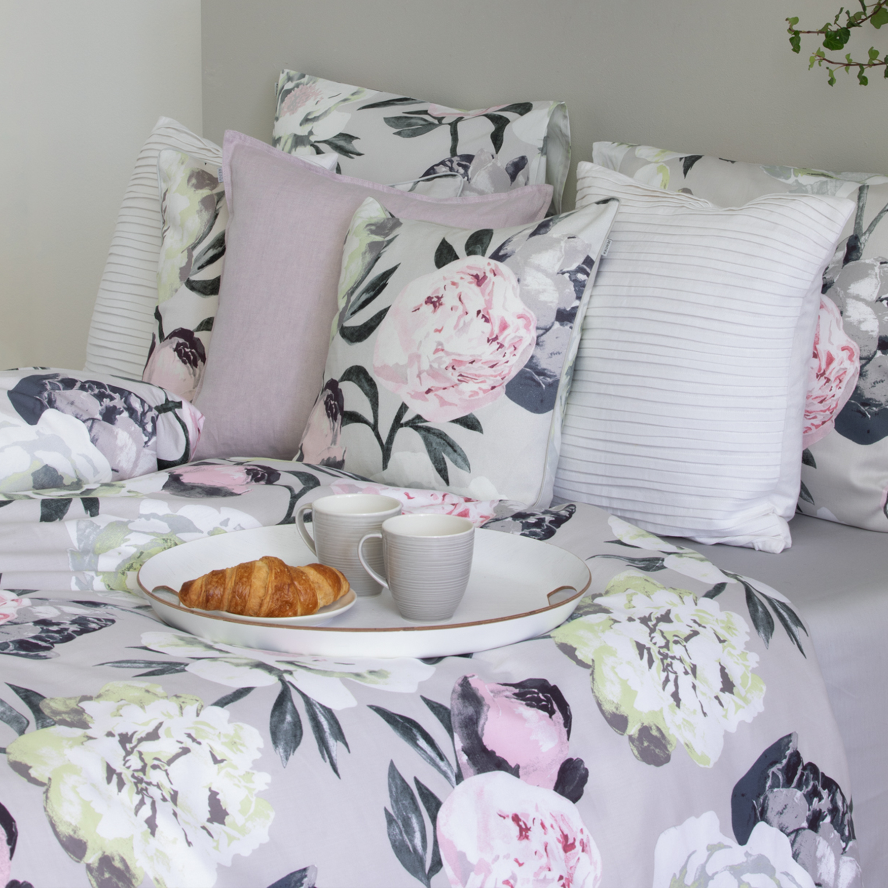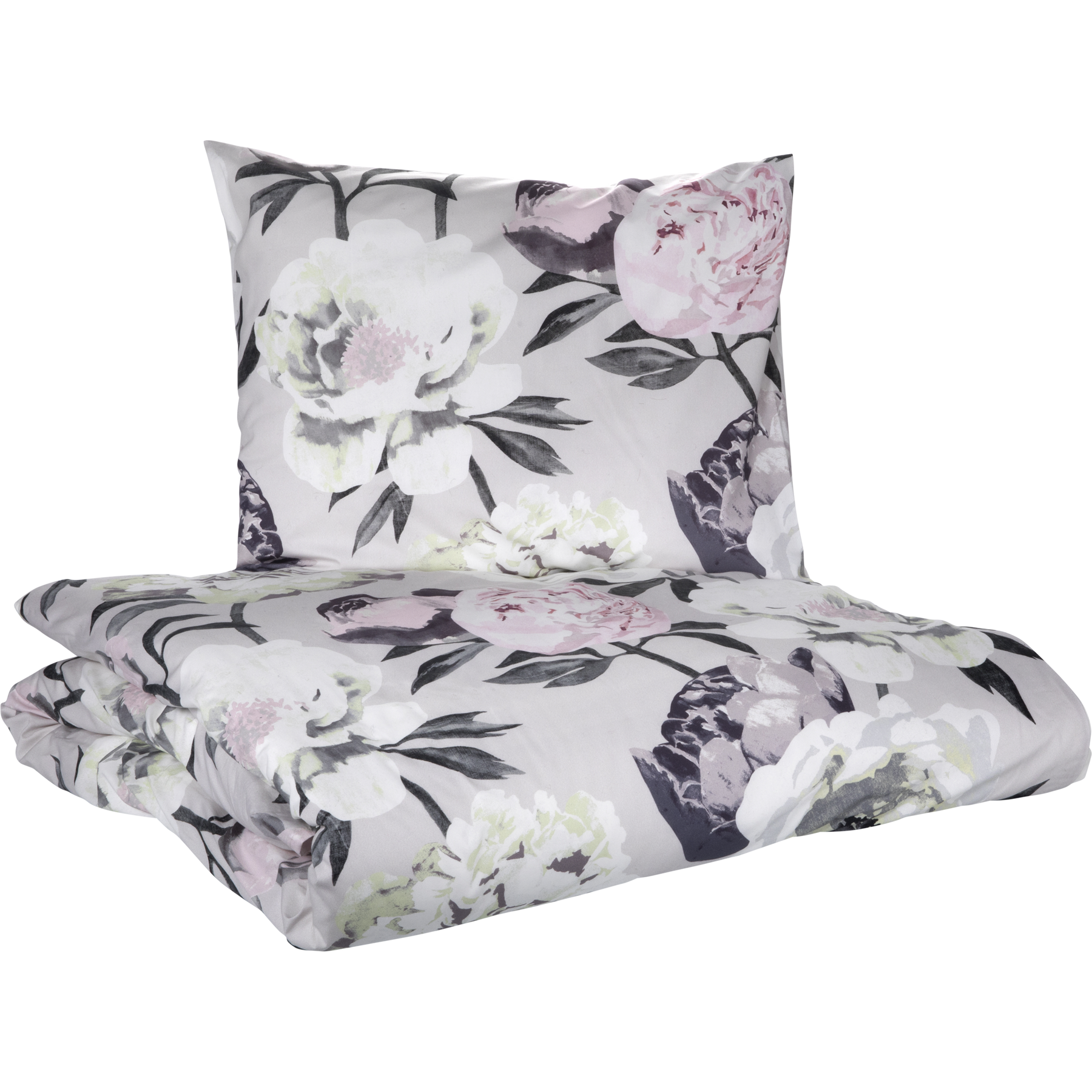 Vaaleanharmaaseen Pioni-pussilakanasettiin sisältyy 150x210 cm pussilakana sekä 50x60 cm kokoinen tyynyliina. Pioni-kuosi on pussilakanan ja tyynyliinan molemmilla puolilla. Vuodevaatteet ovat 100% puuvillaperkaalia ja ne voi pestä 60 asteessa. Puuvillaperkaali on vuodevaatteissa yleisimmin käytetty, tiheään kudottu, helppohoitoinen ja mattapintainen materiaali. Se tuntuu ihoa vasten ylelliseltä ja miellyttävältä, minkä vuoksi puuvillaperkaalilakanoita kutsutaan myös "hotellilakanoiksi". Tuotteen lankaluku eli kankaantiheys (TC) on TC200.
