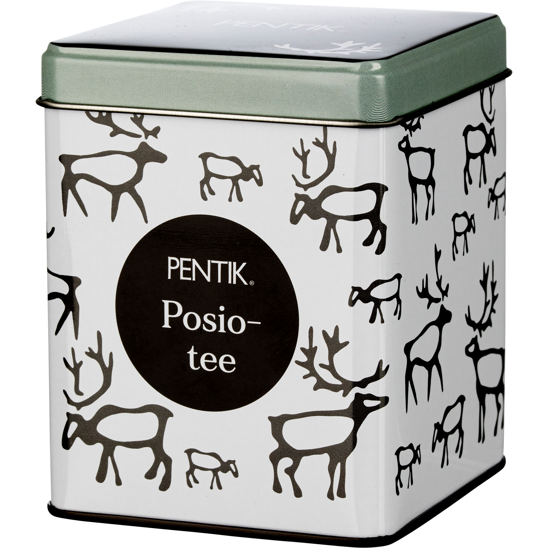 Tee on pakattu kauniiseen peltipurkkiin, jota koristavat Minna Niskakankaan Saaga-kuosin porot. Posiotee on kotimainen tuote, jonka valmistaja on suomalainen teetalo Nordqvist. Teepurkki on hyvä lahjaidea teen ystävälle kotimaisen mukin tai hunajan kera.