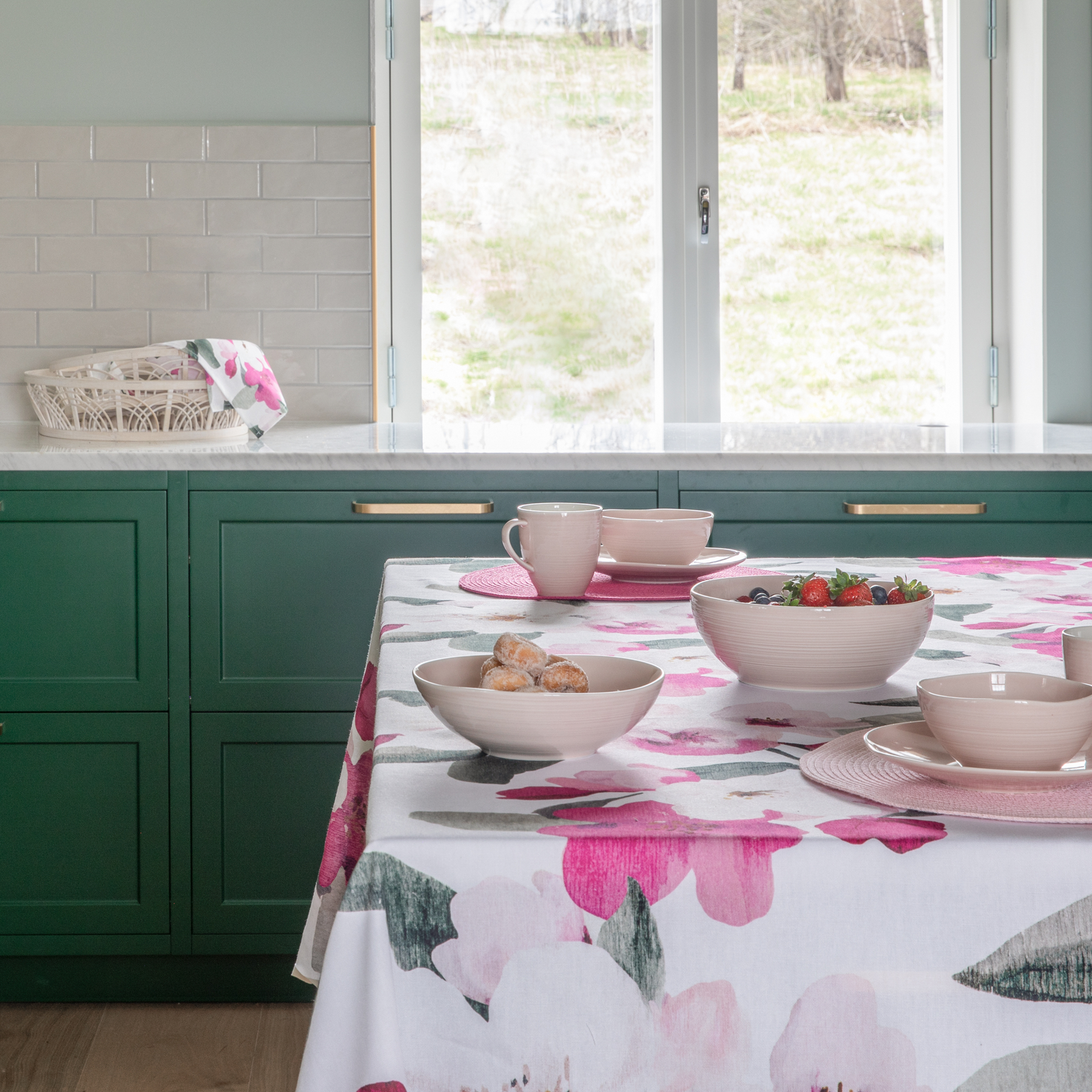 Pohjoisen kesässä jopa puut kukkivat. Mutta vain ohikiitävän hetken. Minna Niskakangas ikuisti Purppuraomenapuiden kukinnan maalaten sen vesiväreillä vanerille, jotta voit nauttia siitä vuodenajasta riippumatta. Omenapuiden hennot kukat leijailevat kotiin vuodevaatteiden, sisustus- ja kattaustekstiilien sekä pyyhkeiden muodossa.