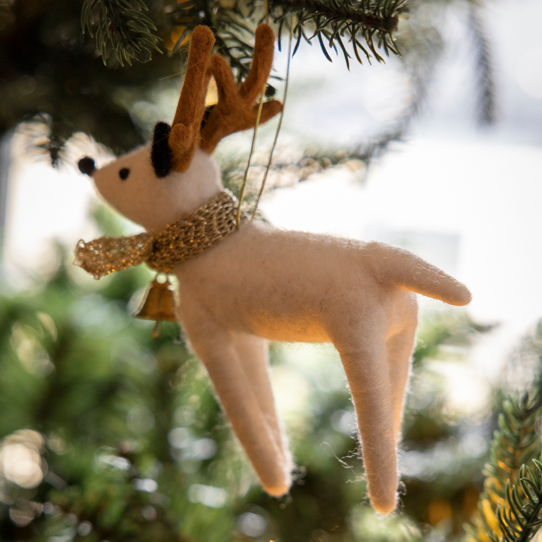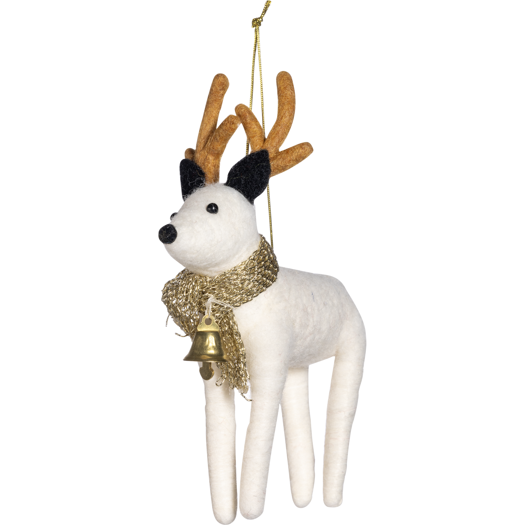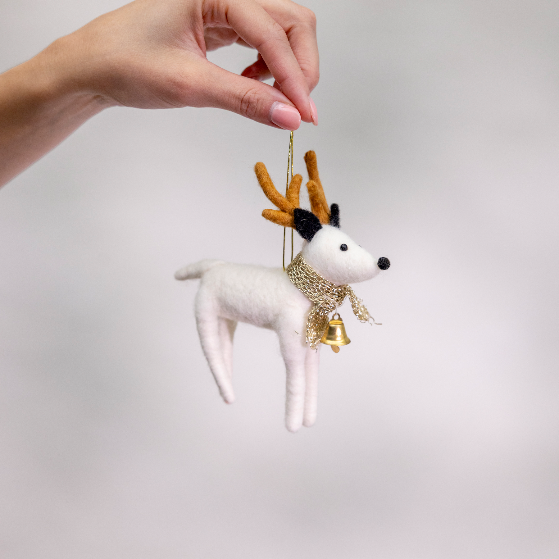 Valkoisen Pyry-porokoristeen korkeus on 14 cm ja se on valmistettu polyesteristä ja villasta.